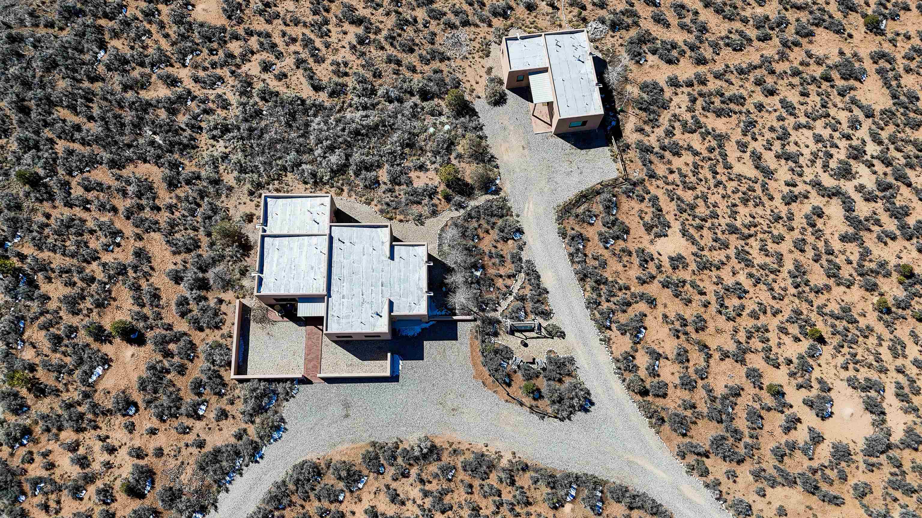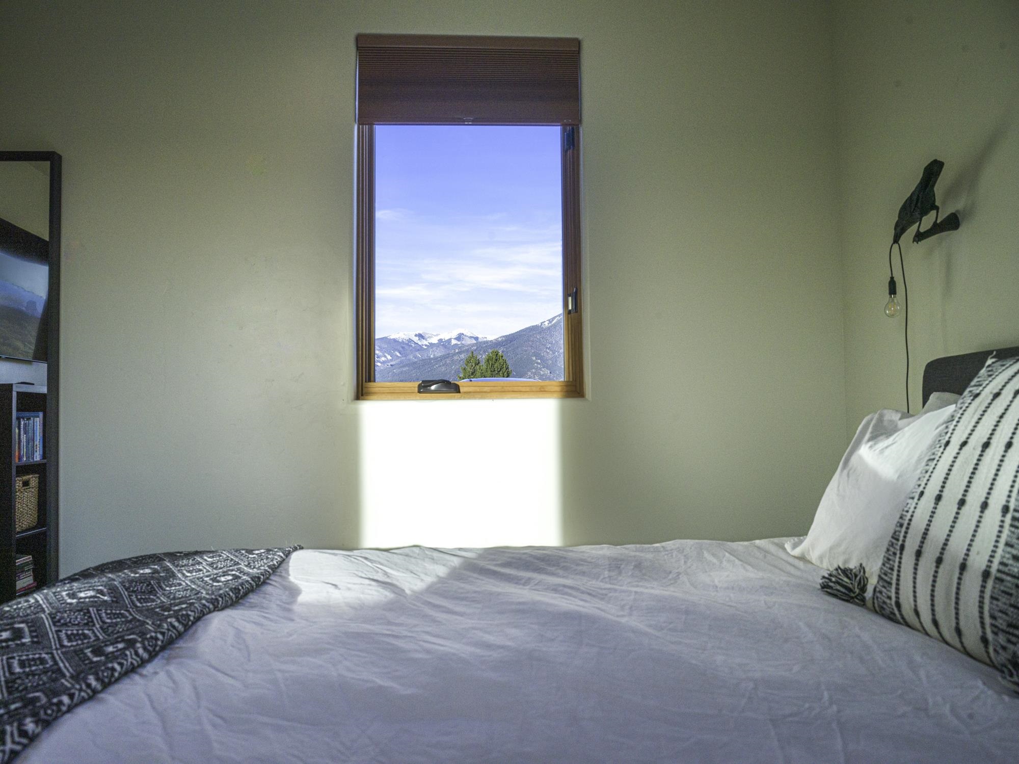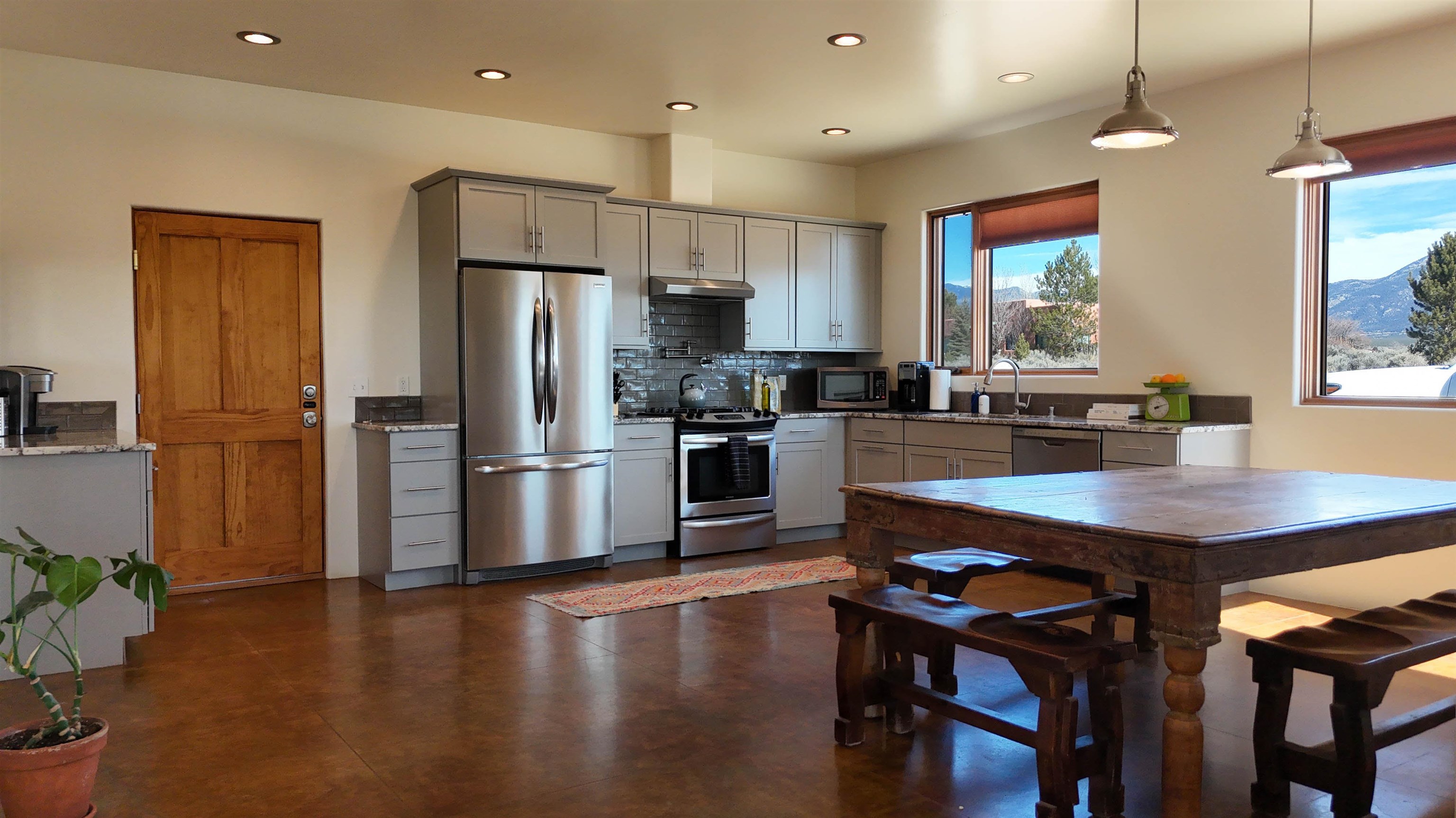 Framed by unobstructed views of Taos Mountain and set in one of El Prado’s most desirable locations, this 2018-built residence reflects a thoughtful, modern approach to high-desert living. The architecture is clean and restrained, allowing light, proportion, and landscape to take the lead. Just 10 minutes from the Plaza in Taos and 20 minutes from Taos Ski Valley, the setting offers both quiet and connection, perfect for supporting a range of living and income possibilities. The 1,748 sq ft main home features 2 bedrooms and 2 baths beneath soaring ceilings, with radiant-heated concrete floors grounding the interiors in warmth and subtle texture. Open living spaces are intentionally oriented toward the mountain, creating a seamless dialogue with the indoors. Finishes are contemporary and refined, with an emphasis on clean lines, natural light, and livable simplicity. An attached heated garage integrates convenience without interrupting the home’s aesthetic clarity. A completely separate 740 sq ft guest house — 1 bedroom, 1 bath — mirrors the same design sensibility. Bright, efficient, and beautifully proportioned, perfect for a private retreat, studio, or income-producing space with a strong short-term rental history available for review. Well-sited on its acre, modern in execution, and quietly architectural in presence, this is a home where design and landscape are in balance.