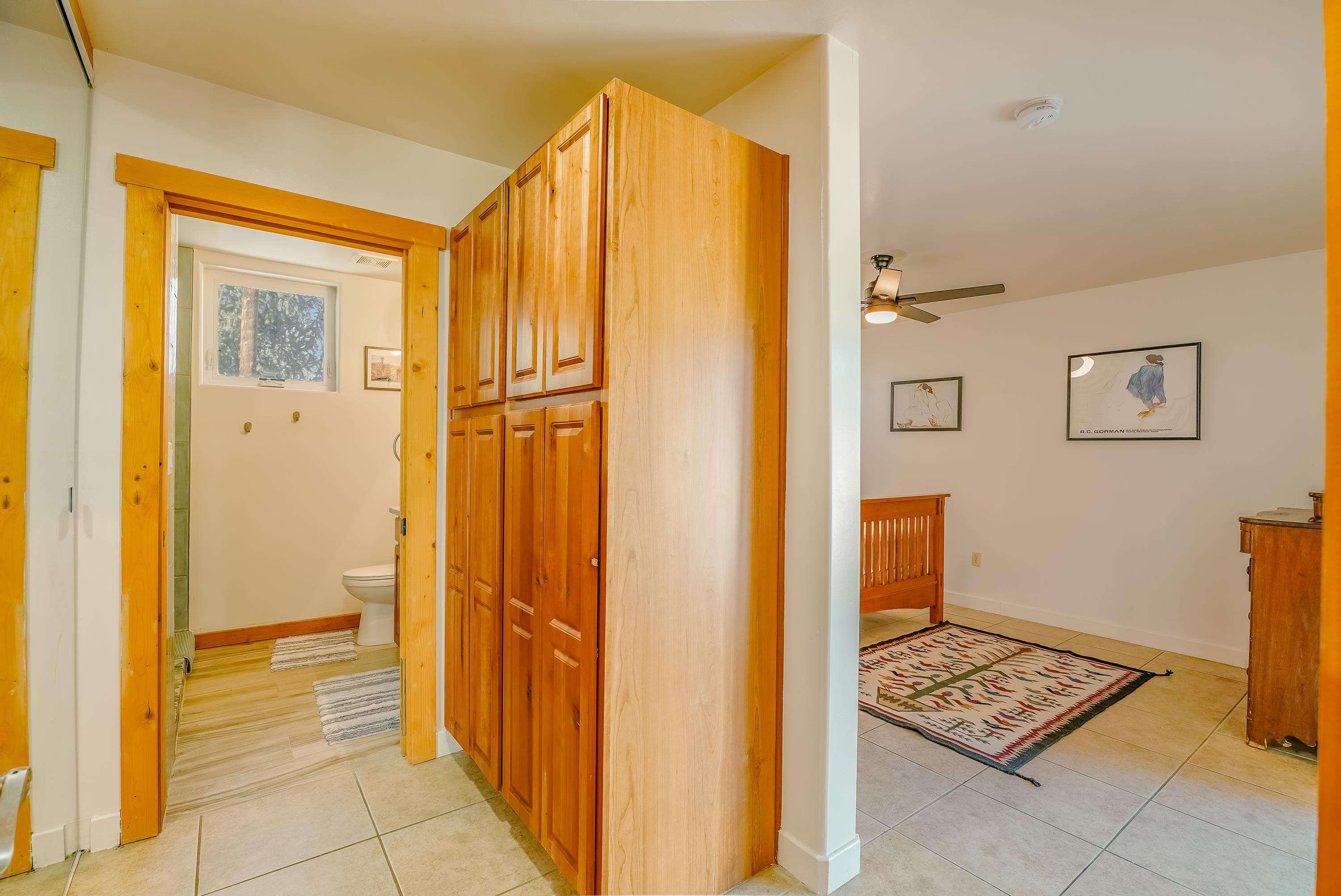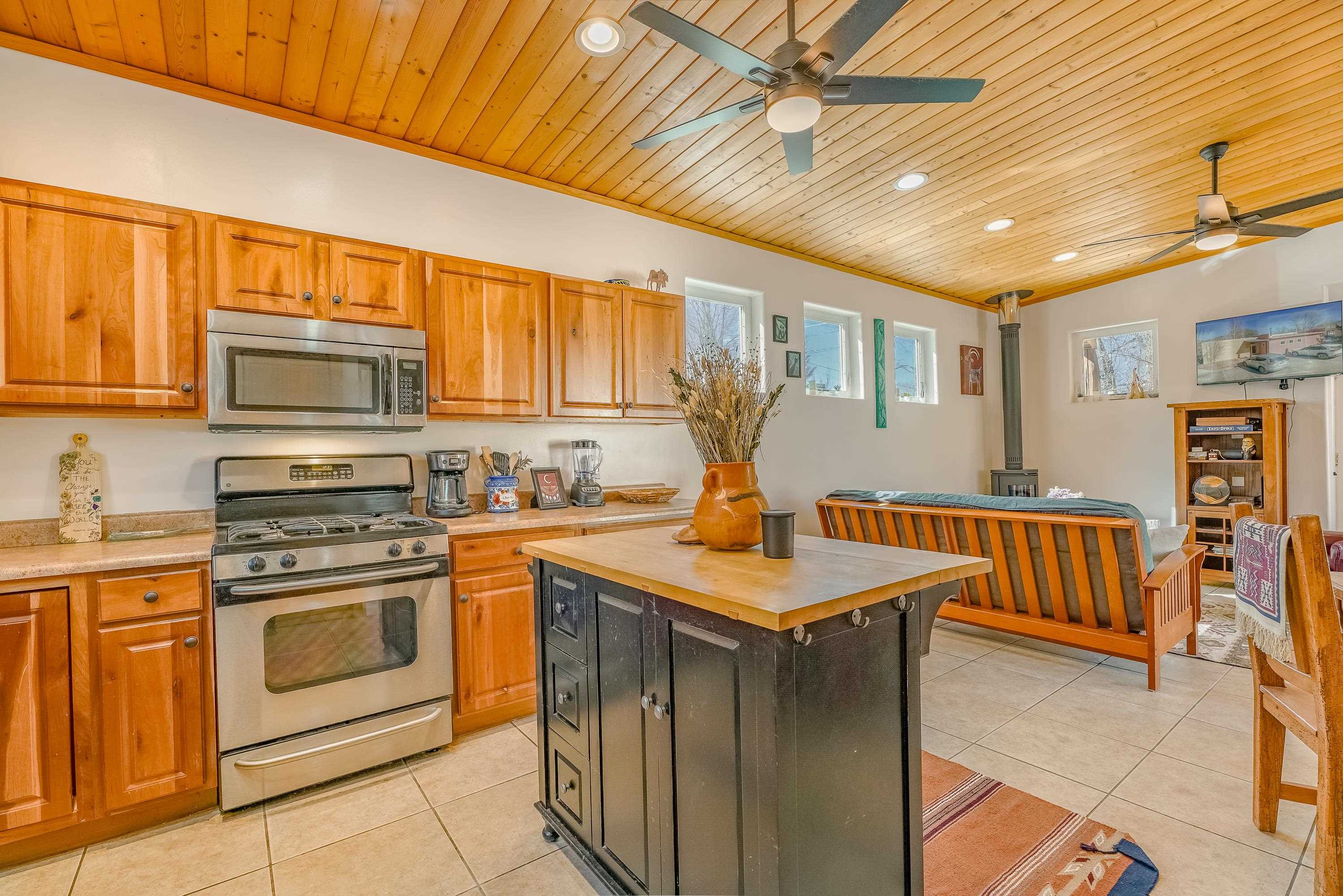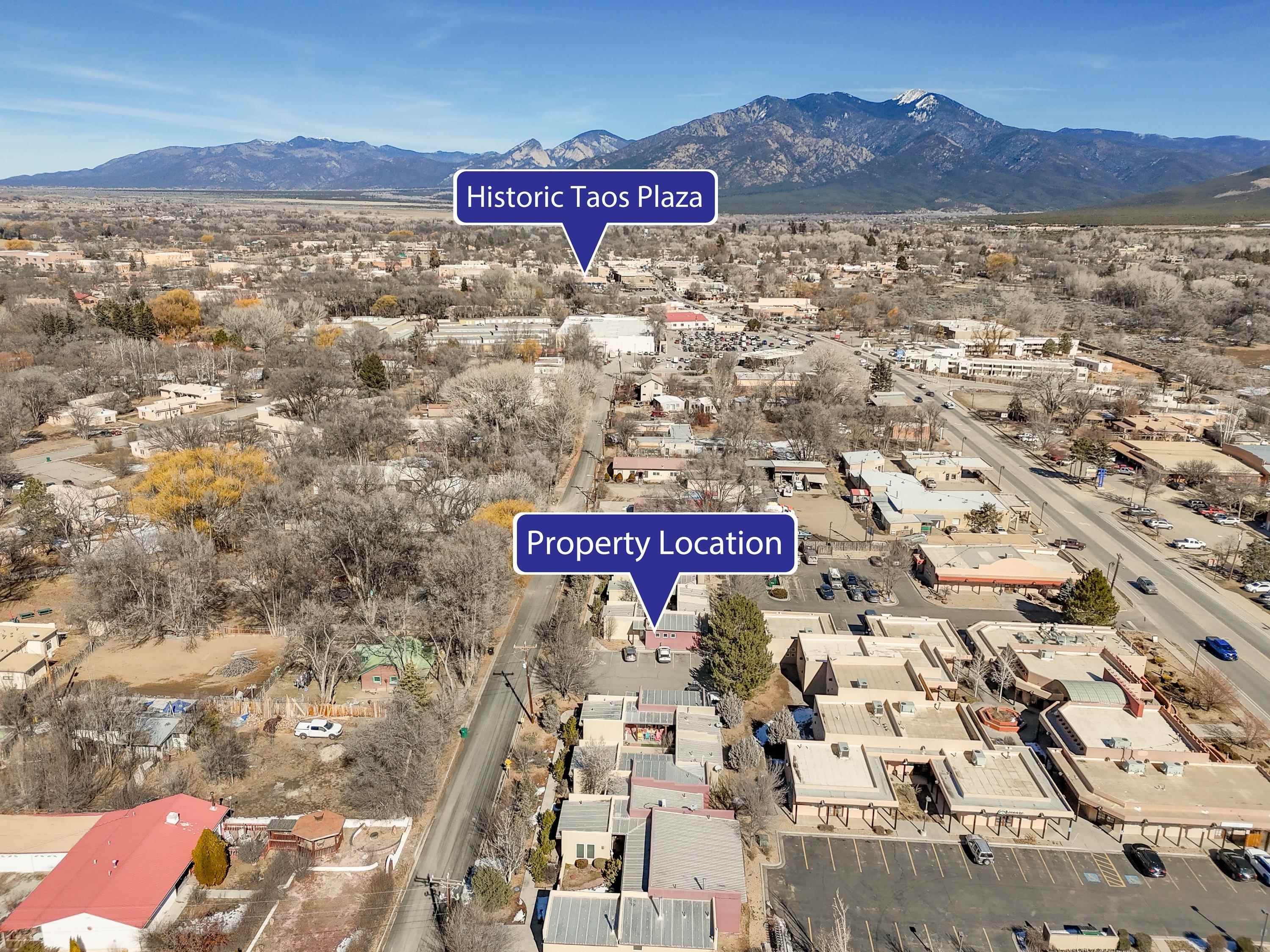 Location, convenience, and the best floor plan you can ask for makes this home stand out! On a quiet dead-end street right in the middle of town, the home is just a few minutes walk away from the plaza, grocery stores, and local shops. Featuring two primary suite bedrooms positioned on opposite sides of the house, each with its own en-suite bathroom, making it ideal for owners and guests to enjoy their own private spaces. Next to both bathrooms there is generous built in cabinetry for all your home goods, clothes, and more. The living room is finished with soft wood touches, properly placed windows to maximize natural light and a sleek wood burning fireplace. Tile throughout the home makes the mud that we so love here in New Mexico easy to clean up! The kitchen is flexible and functional with a movable island that can be adjusted to fit the owner’s needs. An on-demand hot water system provides both domestic hot water and radiant floor heating throughout the home. Natural gas hookup keeps your monthly utility bills lower than the cost of your Sunday brunch. A stacked washer and dryer means no trip to the laundry mat. Out back, the enclosed backyard creates a private outdoor area with aspen trees and plenty enough space for a dining and grilling area under the portal. Mature landscaping around the property is maintained by the HOA, keeping the exterior looking clean and well cared for without the extra work that comes along with maintaining your own yard. Randall Lane is lined with tall drooping willows, elms, and cottonwoods making it a peaceful place to take a walk. Oh! And don't forget that much for the furnishings and kitchen ware in the home will convey at the time of the sale; how about that for easy! Come see why this is a great spot to enjoy everything Taos has to offer just minutes away, while still feeling privately set back on a beautiful street with a winning floor plan.
