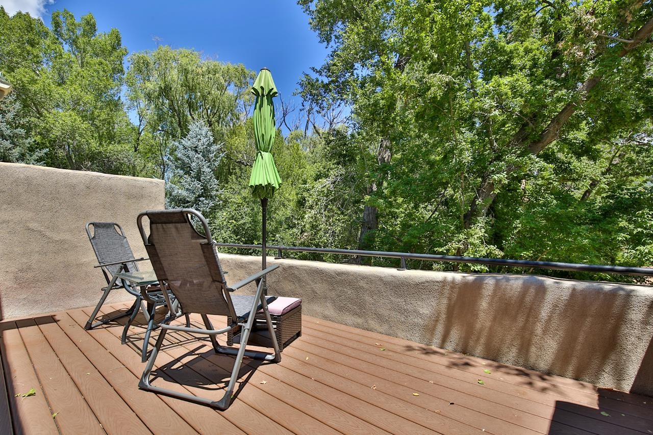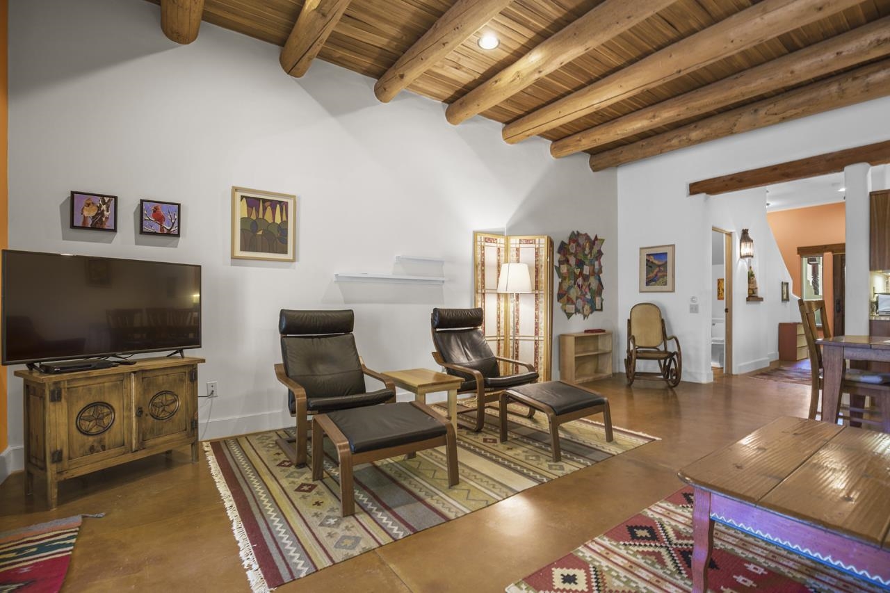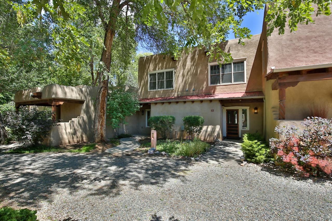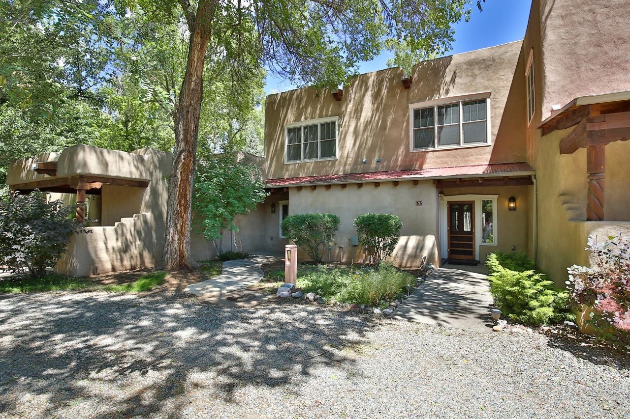 Discover peaceful living in this beautifully maintained 2-bedroom, 2.5-bath condo with a rare private garage, located in the highly sought-after Residencias del Rio Pueblo. Set along the tranquil Rio Pueblo, this serene community is surrounded by mature trees, lush landscaping, and offers the unique benefit of an on-site handyman who keeps the grounds impeccably groomed year-round. Designed by Architect Robert Parker and built by Bob Orner of Upfront Construction. Whether you’re looking for a full-time residence or a perfect ski getaway on the north side of Taos, this home offers both comfort and convenience. The thoughtfully designed main level welcomes you with a spacious coat closet, a gallery-style kitchen with ample cabinetry and a large pantry, and an open-concept dining and living area. A southwest-style fireplace and tall ceilings with traditional vigas and split cedar accents create a warm, inviting atmosphere, while poured concrete floors ensure easy upkeep. Patio doors lead out to a covered portal — ideal for outdoor relaxation and entertaining. A convenient powder room completes the main level. Upstairs, you’ll find two generous bedrooms, each with its own en-suite bathroom and full closet. The primary suite features a private deck perfect for quiet mornings or starlit evenings. Best of all, this condo is being sold mostly furnished except the artwork, making it an easy place to land. Located just minutes from Cid’s Market, the Town of Taos, and with easy access to Arroyo Seco and Taos Ski Valley, this condo offers a prime location in one of the most desirable and well-built communities in town. Come experience the blend of natural beauty, thoughtful design, and everyday ease — and see why Residencias del Rio Pueblo is one of Taos’ finest places to call home.