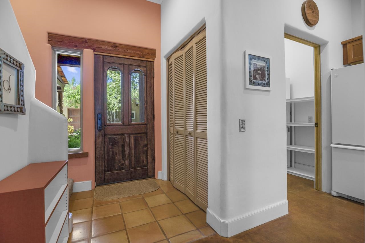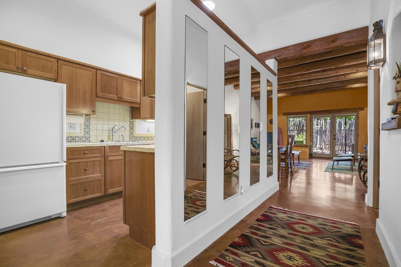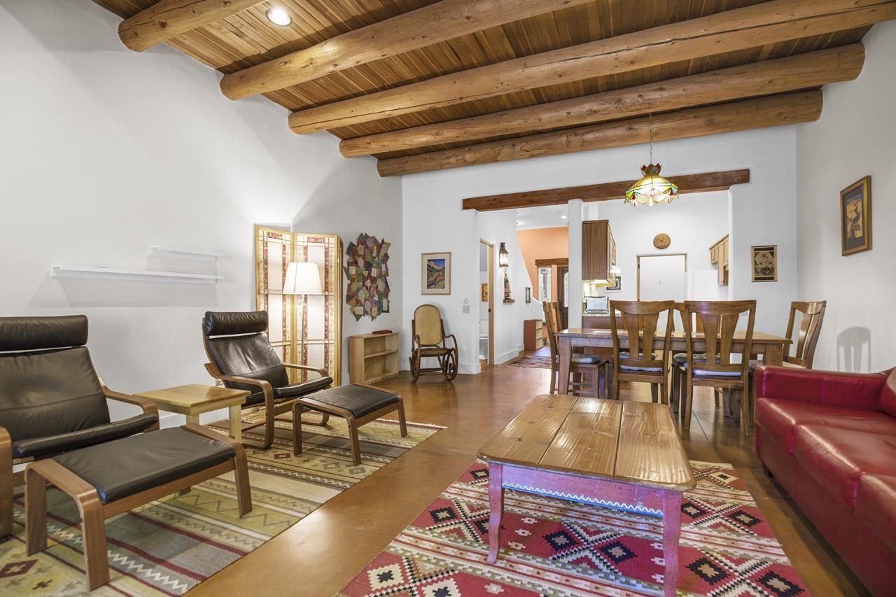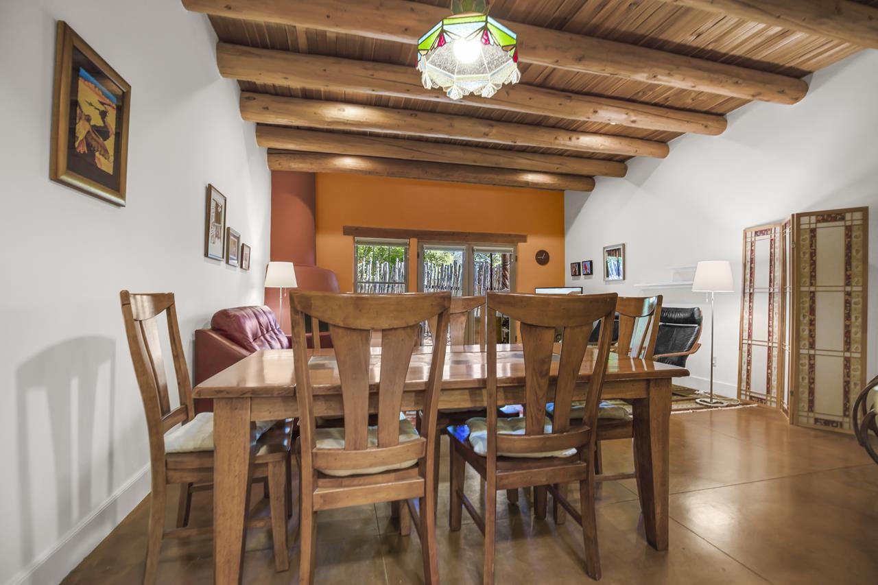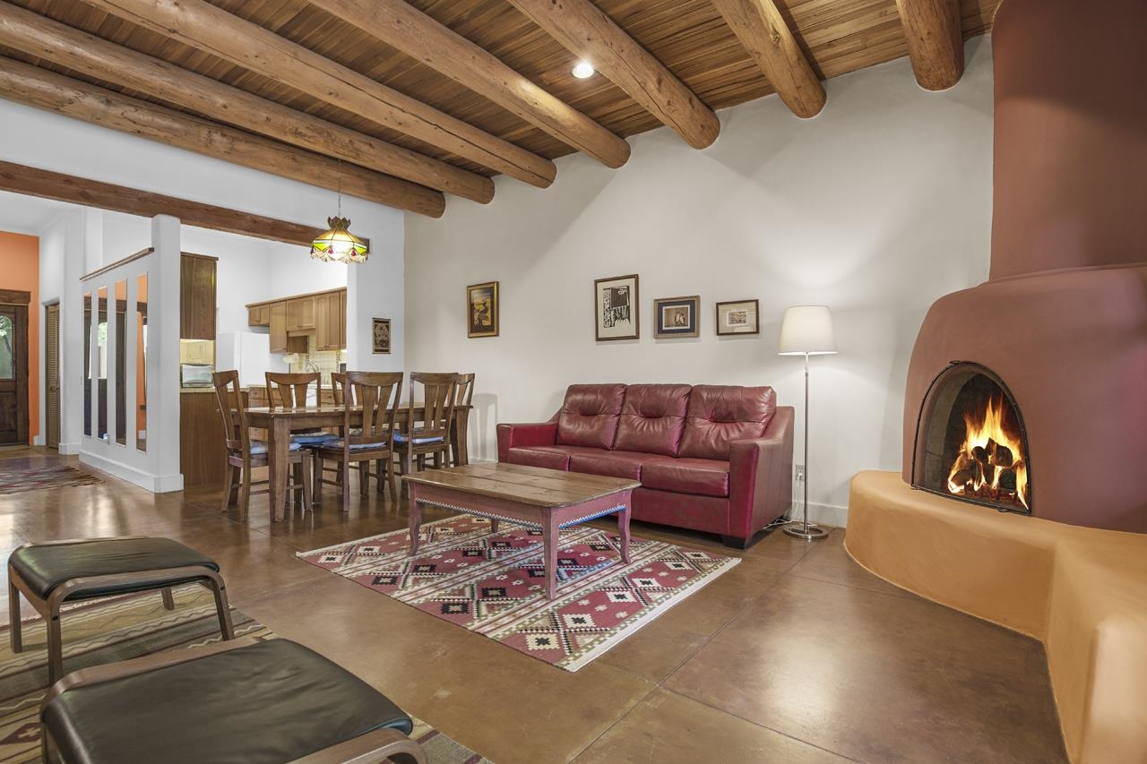 Discover peaceful living in this beautifully maintained 2-bedroom, 2.5-bath condo with a rare private garage, located in the highly sought-after Residencias del Rio Pueblo. Set along the tranquil Rio Pueblo, this serene community is surrounded by mature trees, lush landscaping, and offers the unique benefit of an on-site handyman who keeps the grounds impeccably groomed year-round. Designed by Architect Robert Parker and built by Bob Orner of Upfront Construction. Whether you’re looking for a full-time residence or a perfect ski getaway on the north side of Taos, this home offers both comfort and convenience. The thoughtfully designed main level welcomes you with a spacious coat closet, a gallery-style kitchen with ample cabinetry and a large pantry, and an open-concept dining and living area. A southwest-style fireplace and tall ceilings with traditional vigas and split cedar accents create a warm, inviting atmosphere, while poured concrete floors ensure easy upkeep. Patio doors lead out to a covered portal — ideal for outdoor relaxation and entertaining. A convenient powder room completes the main level. Upstairs, you’ll find two generous bedrooms, each with its own en-suite bathroom and full closet. The primary suite features a private deck perfect for quiet mornings or starlit evenings. Best of all, this condo is being sold mostly furnished except the artwork, making it an easy place to land. Located just minutes from Cid’s Market, the Town of Taos, and with easy access to Arroyo Seco and Taos Ski Valley, this condo offers a prime location in one of the most desirable and well-built communities in town. Come experience the blend of natural beauty, thoughtful design, and everyday ease — and see why Residencias del Rio Pueblo is one of Taos’ finest places to call home.