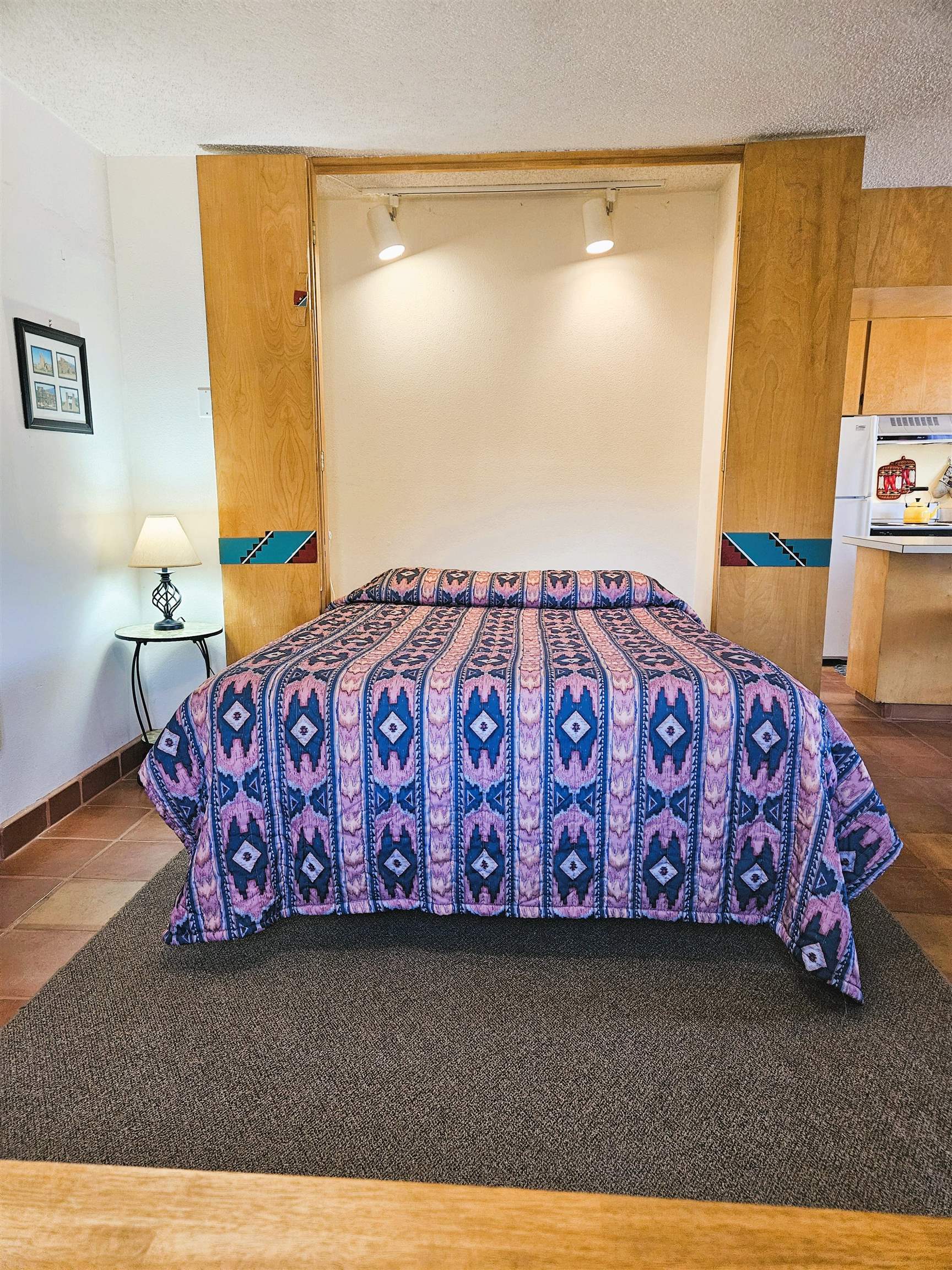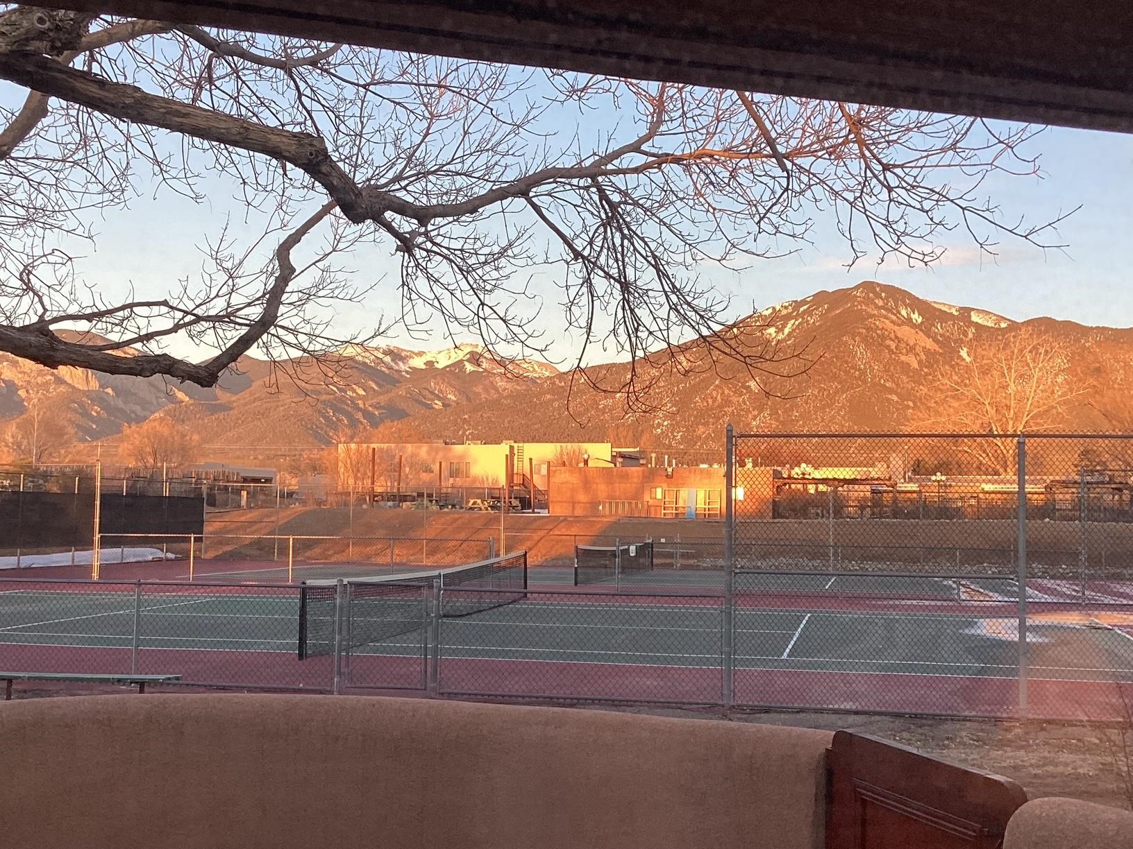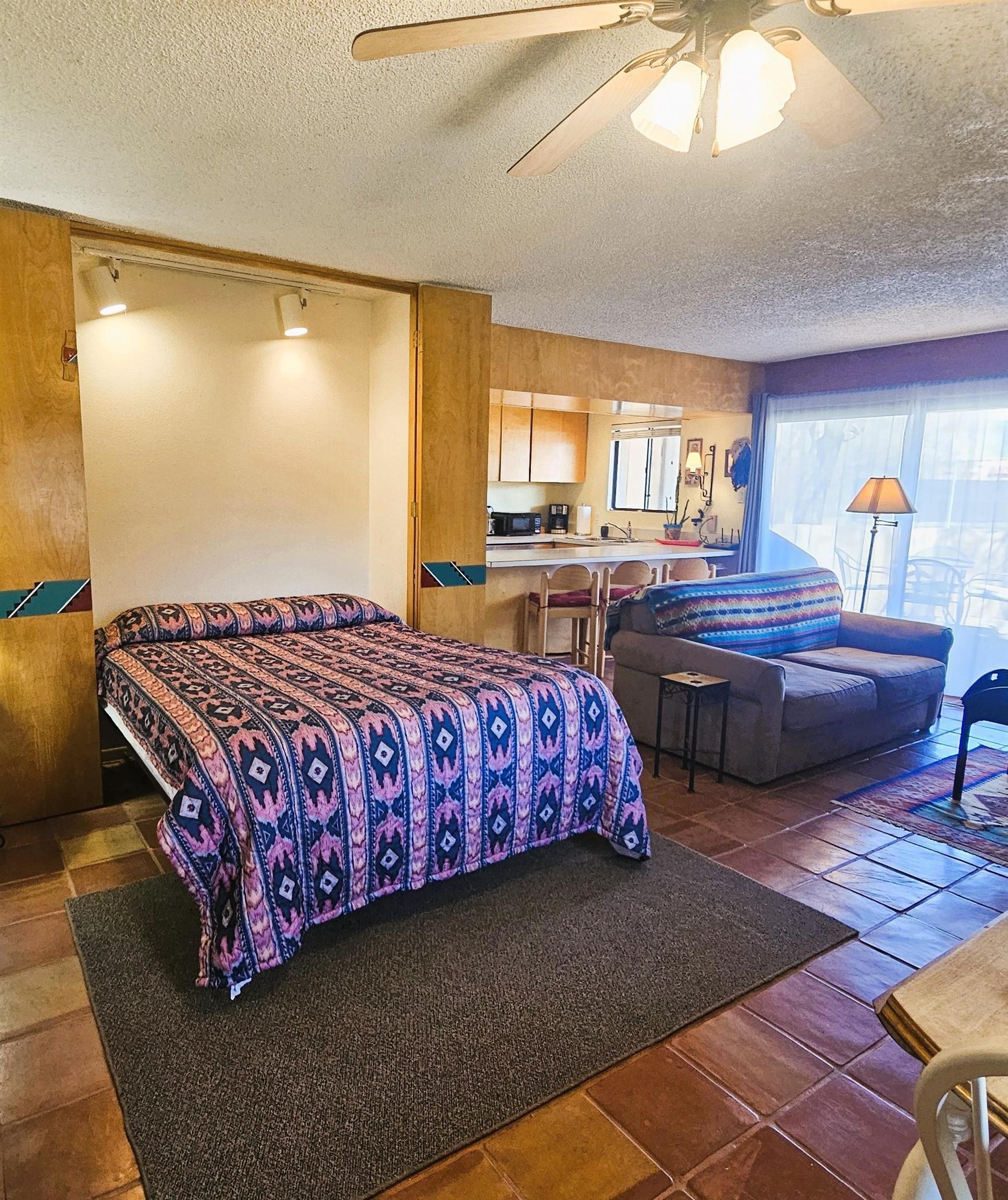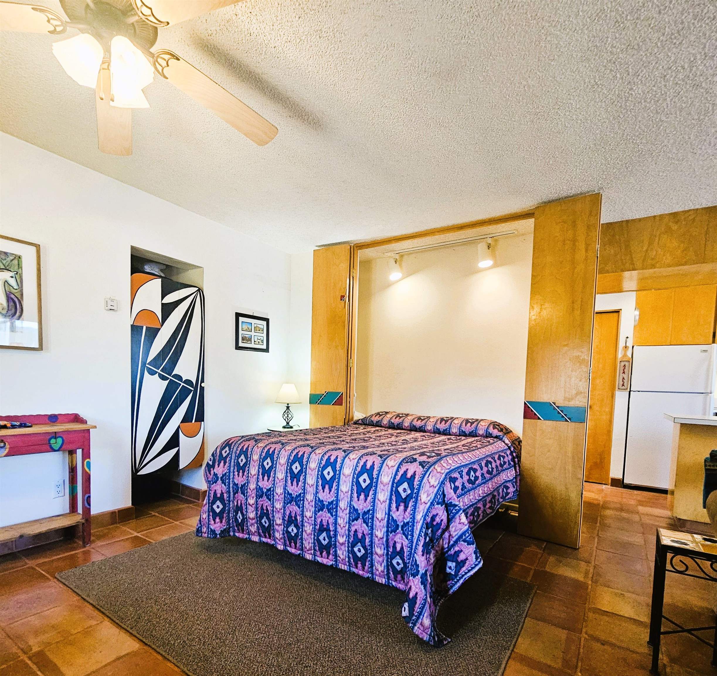 Warm and inviting 488 square foot studio single story condo with a wood burning fireplace and panoramic Taos Mountain views. This unit features tile flooring, natural light, a full kitchen and bath, and glass sliders opening to a spacious private patio with great views of the tennis courts and Sangre de Cristo Mountains. Queen size Murphy bed and sofa sleeper comfortably accommodate four people. Three closets provide excellent storage for seasonal gear. Sold furnished and equipped, the condo is turnkey and ready for personal use or rental, no short term restrictions. Located in the Quail Ridge Inn/Taos Tennis Club, ownership includes access to top rated tennis facilities, a seasonal pool, hot tub, onsite dining, and well maintained common areas. Ideally situated between the Town of Taos and Taos Ski Valley, this condo combines style, location, and ease of living. A rare opportunity to own a resort style getaway with outstanding amenities and exceptional mountain views.