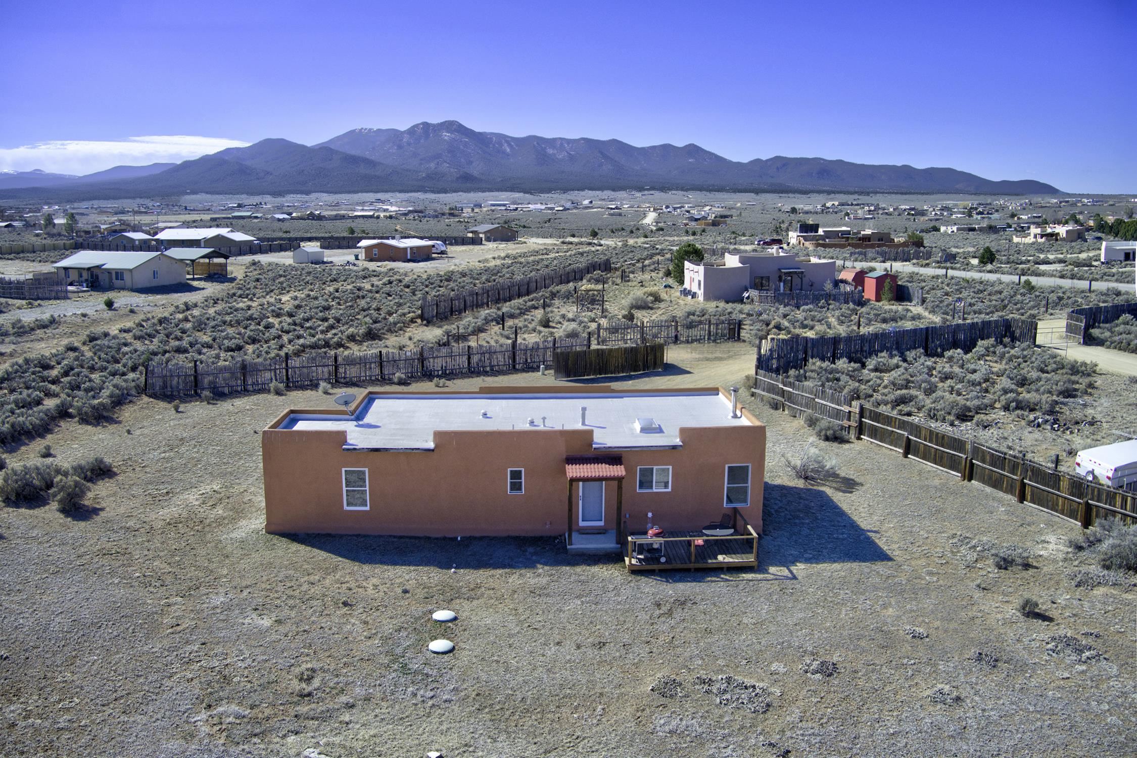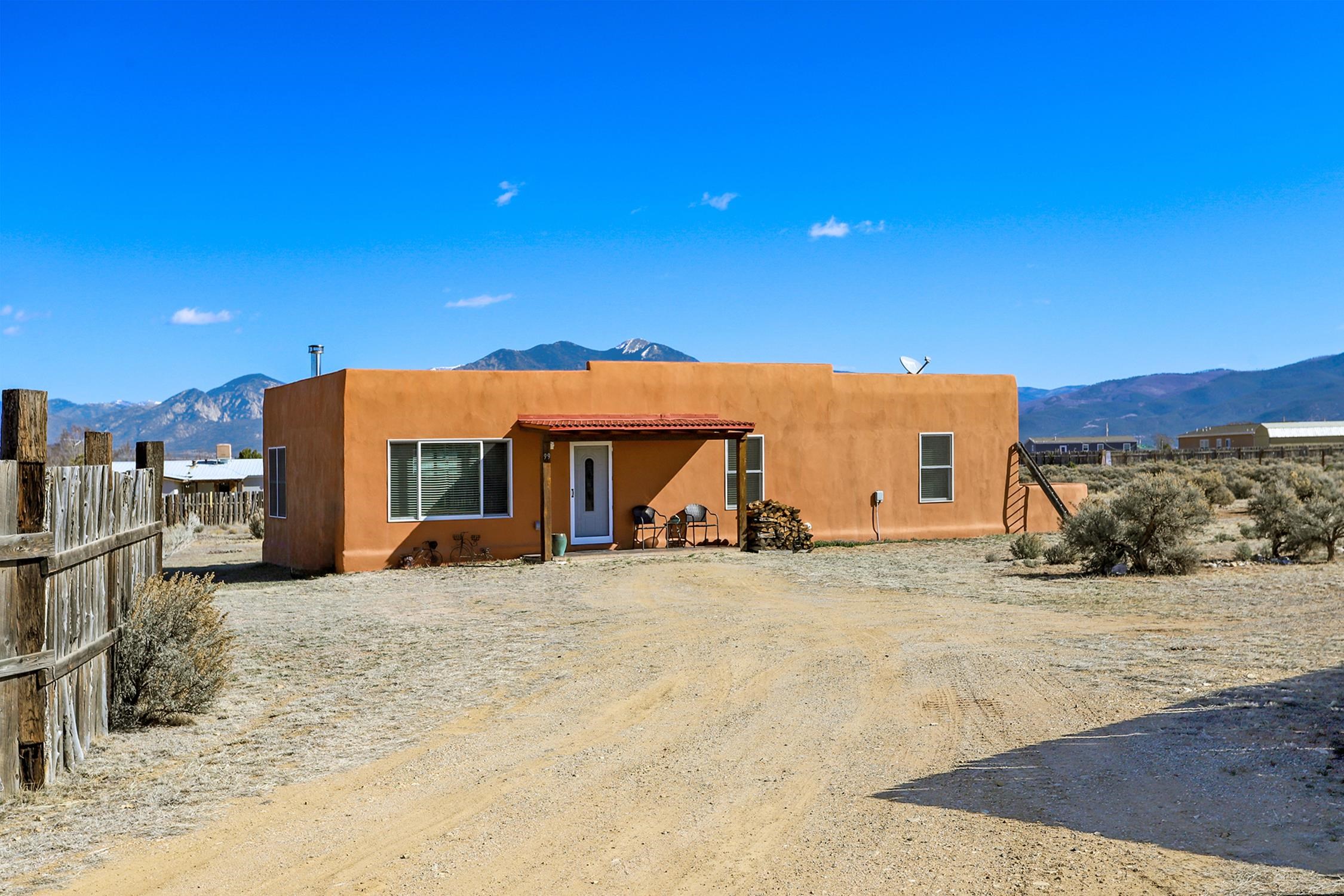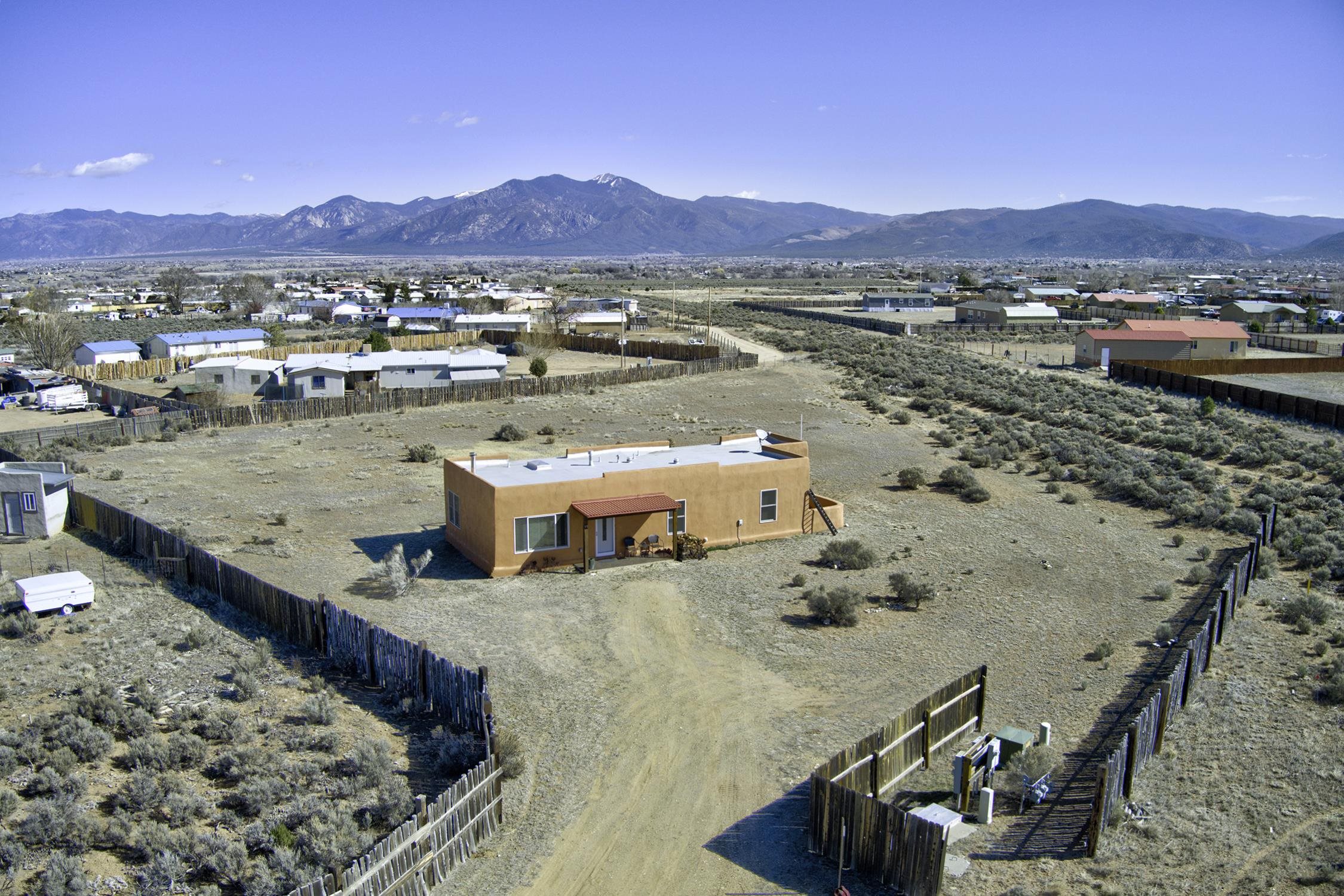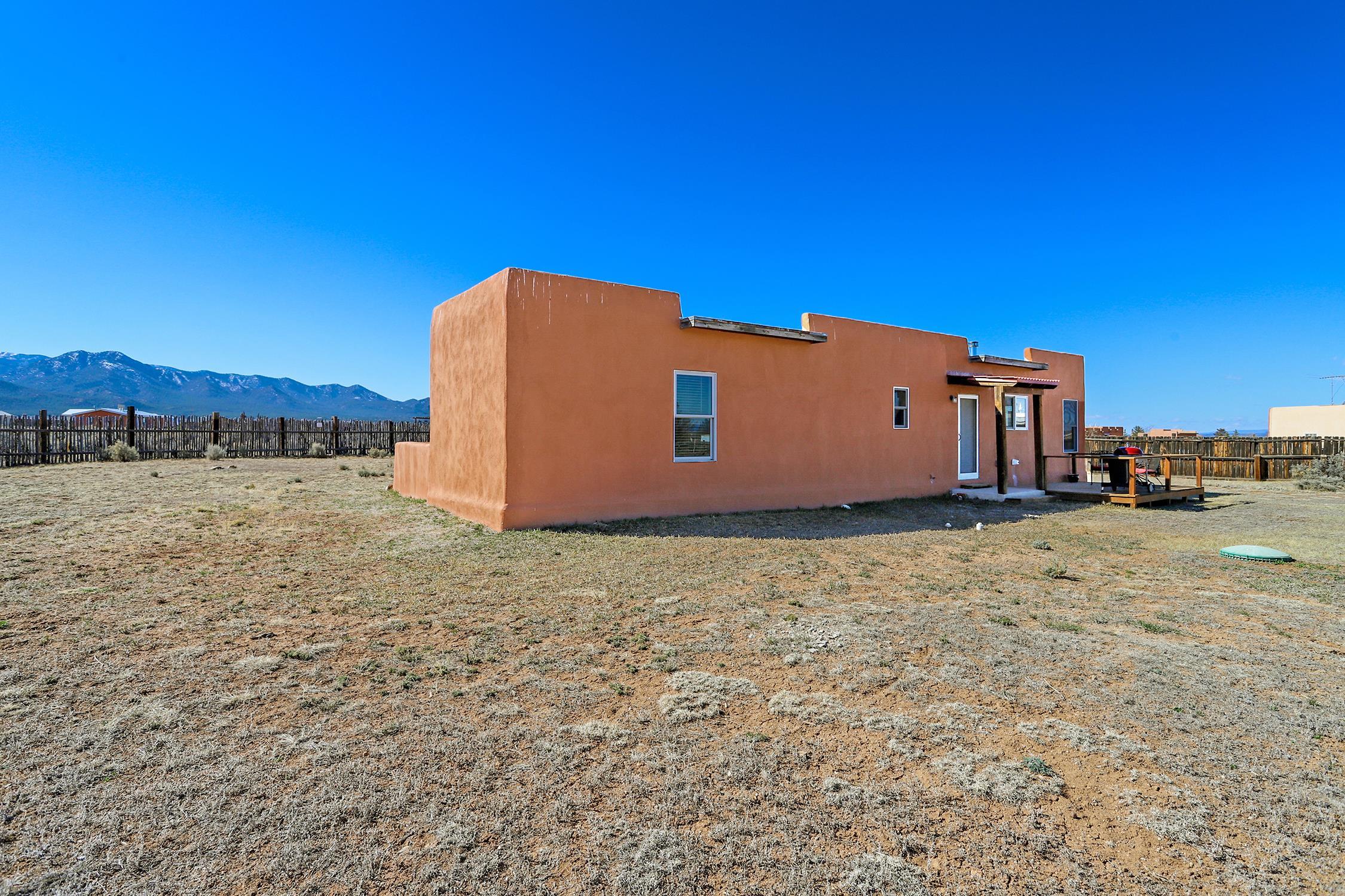 Enjoy the beauty and lifestyle of Ranchos de Taos from this charming 1,309 sq ft home set on 1.21 acres with beautiful views of Taos Mountain. The home offers a warm and inviting feel with a cozy living area and wood stove, perfect for crisp mountain evenings, along with hot water radiant floor heat that keeps the home comfortable year-round and even extends onto the front patio. Step outside to a lovely back deck where you can relax and take in the big skies and stunning Taos Mountain views. The primary bedroom features a walk-in shower and a private exterior door that leads to a sweet walled patio, creating a peaceful spot for morning coffee or quiet evenings. Additional features include tile floors throughout, natural gas, and a practical layout designed for comfortable living. The property is served by a shared well and septic system and offers the space and tranquility that make Ranchos de Taos so desirable. Located just minutes from the Rift Trail, the Taos Country Club golf course, and the shops, dining, and galleries of town, this home offers easy access to both outdoor adventure and Taos culture.