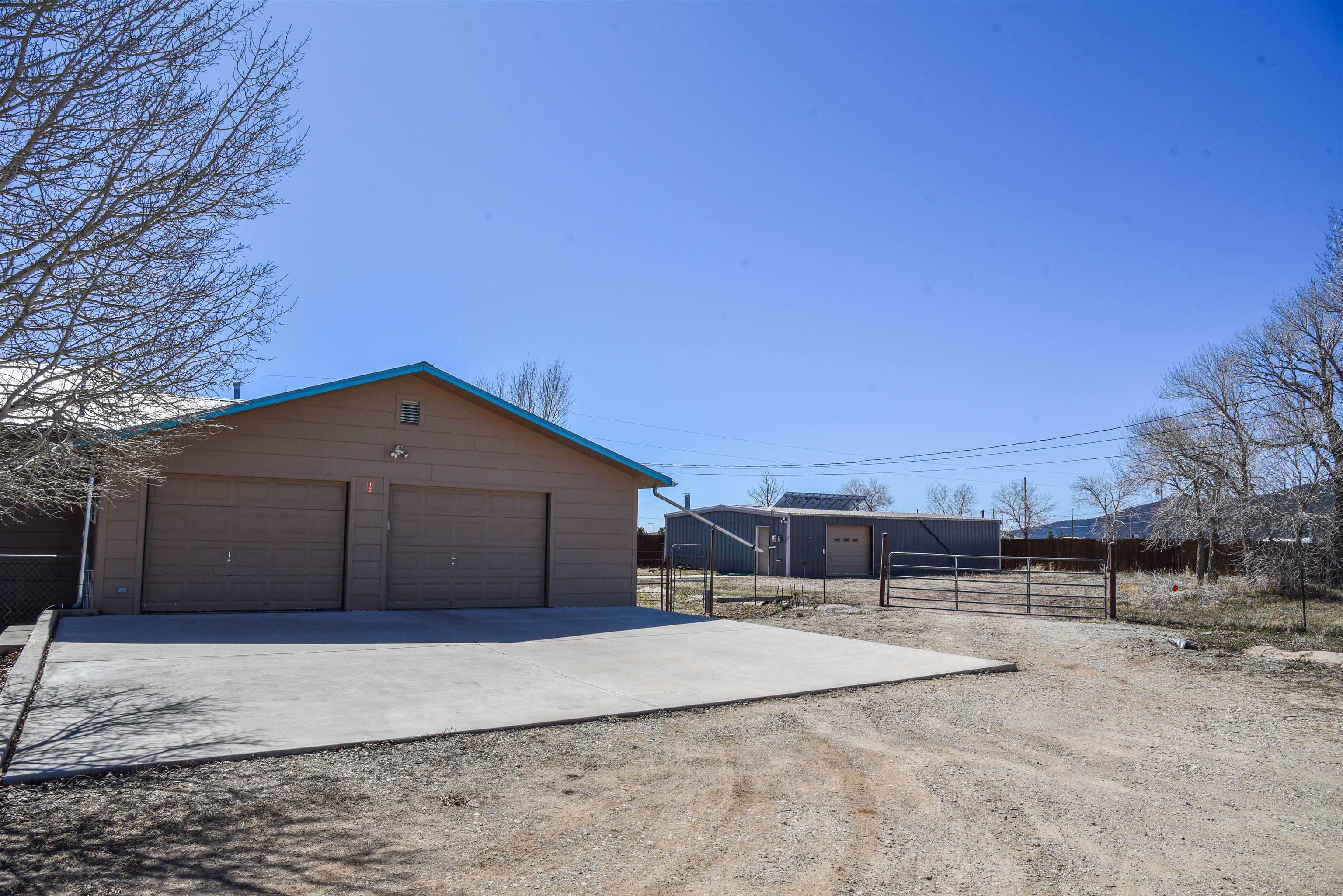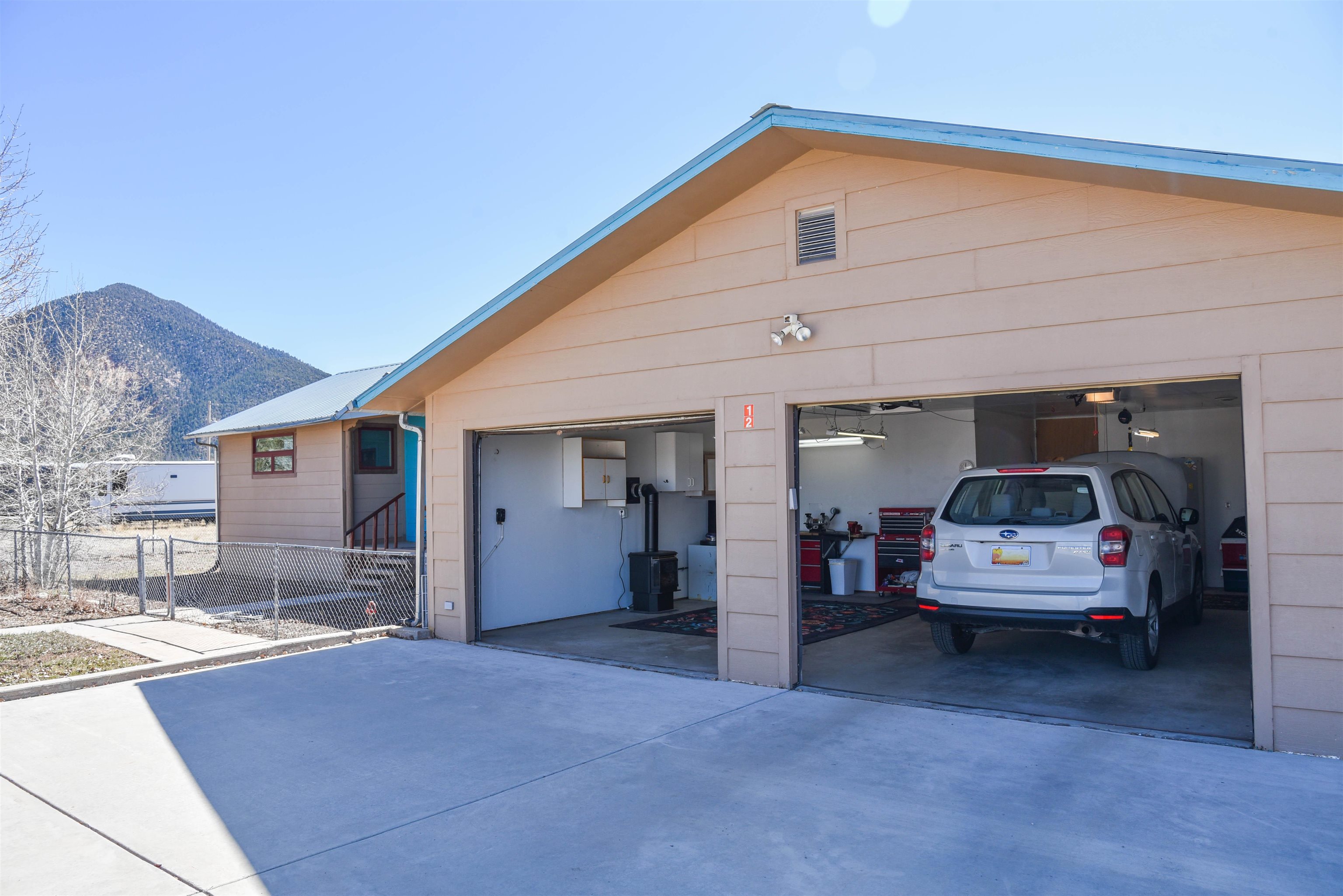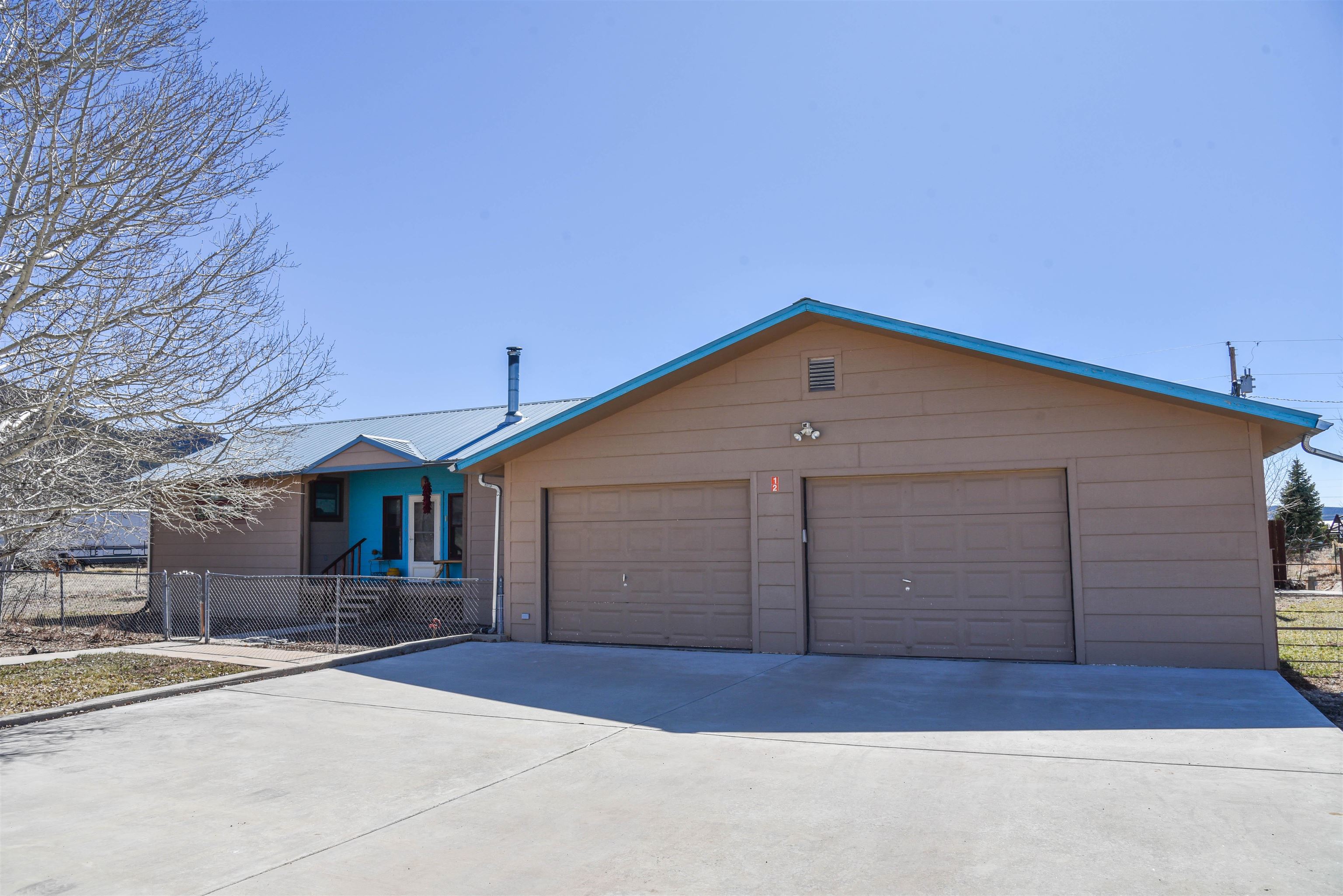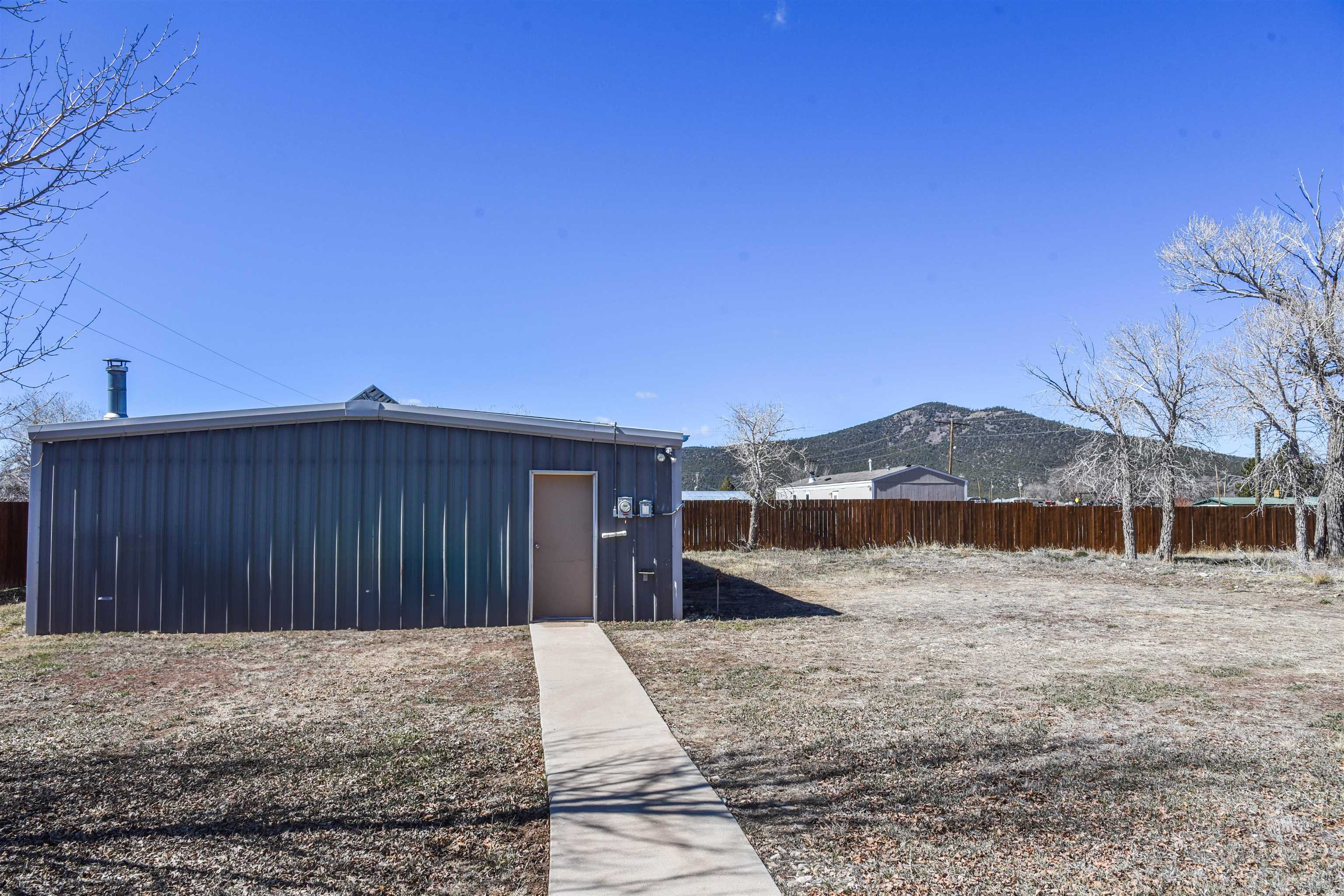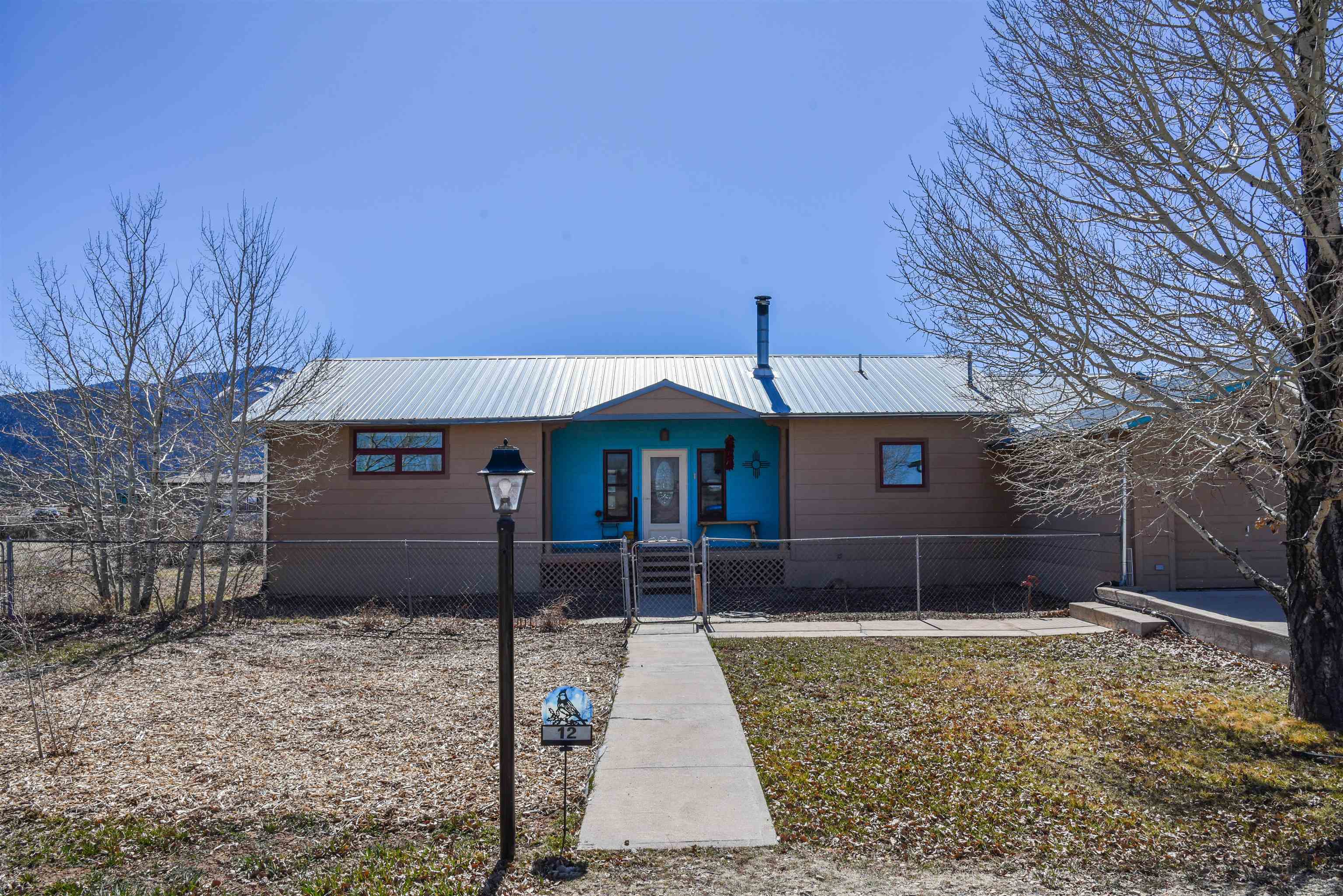 Upon entry into this charming, quaint single-level southwestern style home is the welcoming living room featuring a comfortable seating area, wood stove, gas stove, beautiful vigas and warm well-sought after saltilla tile throughout most of the home. Up the steps to your left is the bright well equipped kitchen with lots of storage and counterspace, a microwave, dishwasher, island, gas stove, new refrigerator (less than 1 yr old) and dining area/work space. Beyond the living room you'll find the ever so warm and inviting sunroom/workout area that overlooks the Eastern mountains and the door leading to the back partially covered sunning deck. Deck is made of composite materials. To the right of the living area you'll find the laundry room complete with a newer water-heater (less than 5 yrs old, a new washer/dryer set (less than 1 yr old), wash tub/sink and a great folding countertop area with plenty of cabinetry for storage. Continuing down the hallway to the left you'll find the first guest bedroom with a futon that folds down into a full-sized bed, closet area and built in drawers for clothing/linen storage. Directly after, you'll find the second bedroom currently used as another workout space also furnished with a closet space and built in drawers. Meanwhile across the hallway, you'll find the full bath complete with a shower/tub combo, linen knook, vanity, and throne. Towards the back of the home, you will come across the TV room/sitting area, the door leading out the attached heated 2-car garage and the master bedroom suite. The master bedroom is large enough to house a king sized bed and nightstands with room to space! Special features are the gas stove, walk-in closet with plenty of hanging space, the large bathroom with walk-in shower, large vanity, throne. And a door leading to the covered portion of the backyard deck (composite) and backyard. Following the sidewath path to the West side of the property you'll find a gate, and the 1500 sq ft. workshop with a single bay door and side entrance ready and willing for projects! On the roof of workshop is where the 6 paid off solar panels live. The yard of this home is completely fenced all the way around. Back at the house in the 2-car garage you'll find a gas stove to heat the garage as well as a pantry/storage knook for any additional storage needs. This home is is currently on Fiber Optic Wi-Fi, Satellite TV and Solar. This home has gorgeous mountain views all around! Perfect for anyone looking to relocate or as an investment property whether short-term or long-rental!!! Selling mostly furnished. Priced to sell fast! Best deal on the market, schedule your showing today!!!