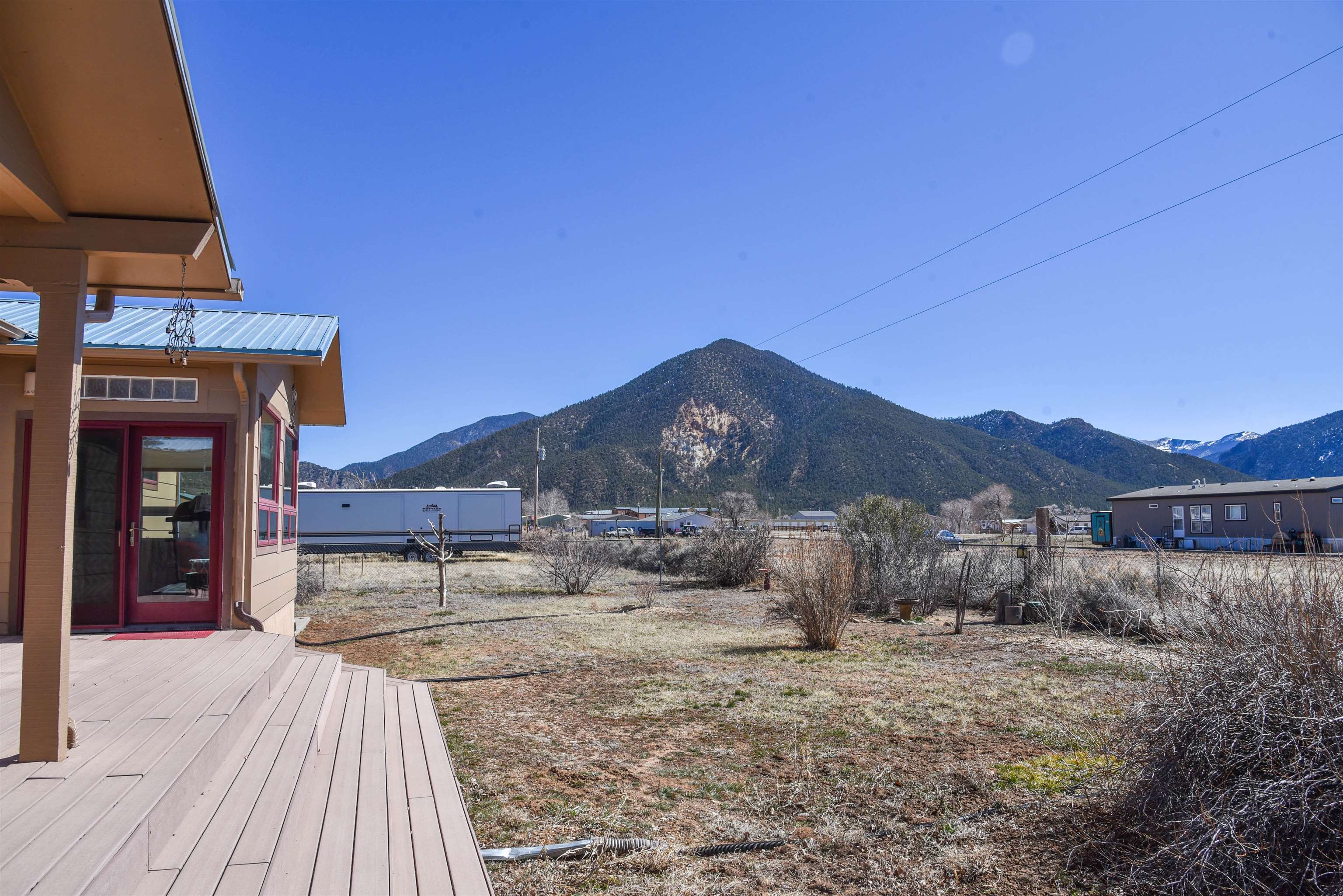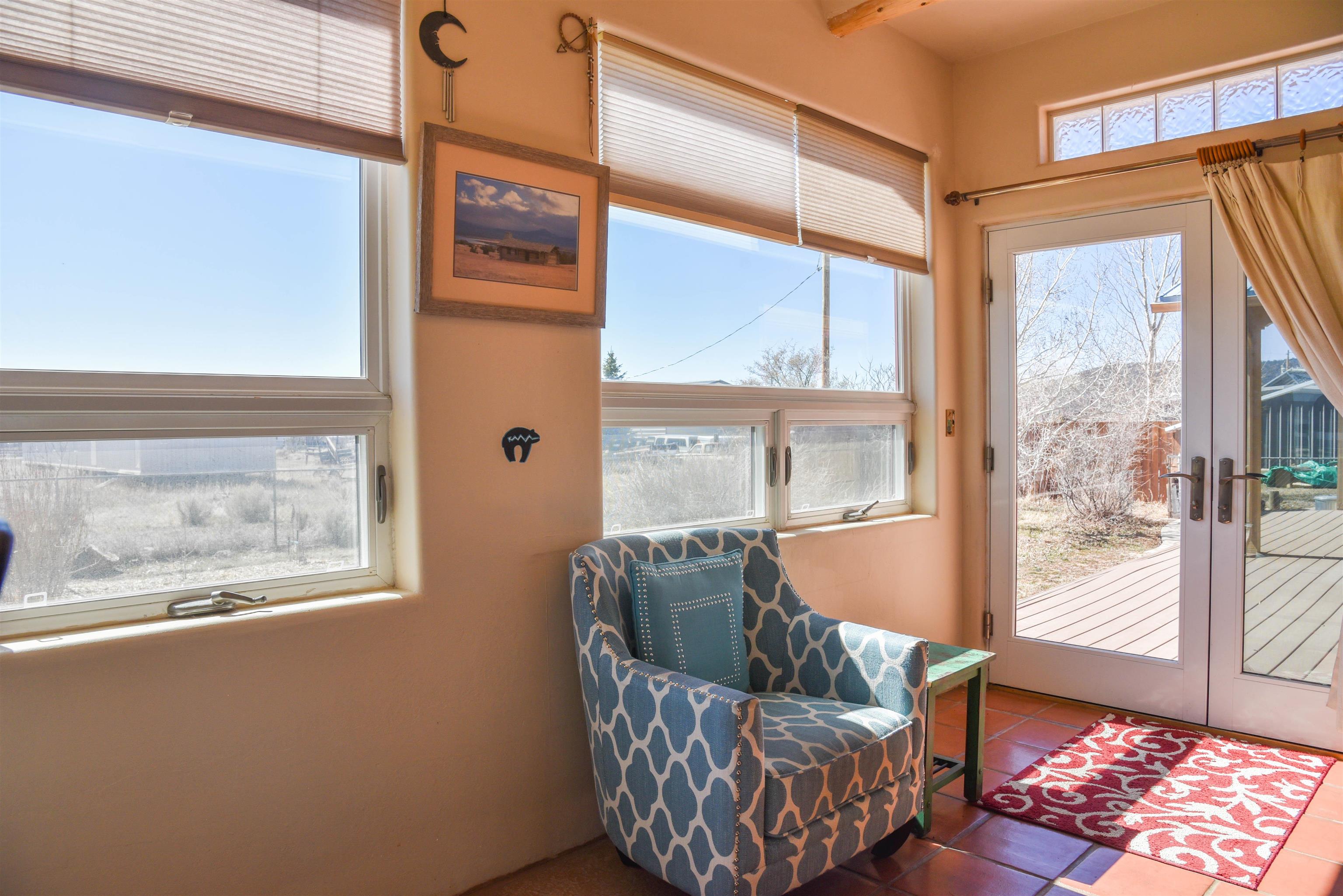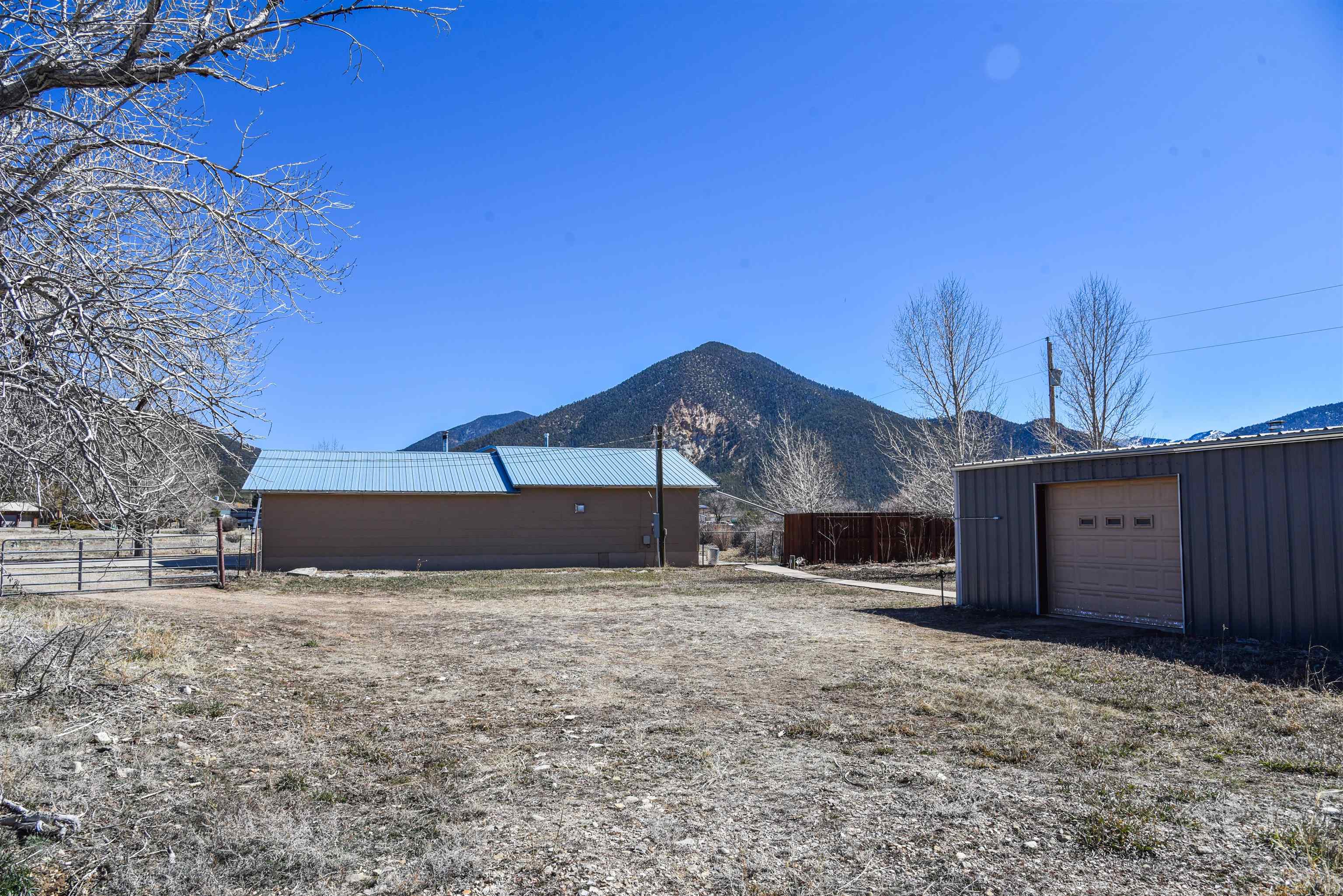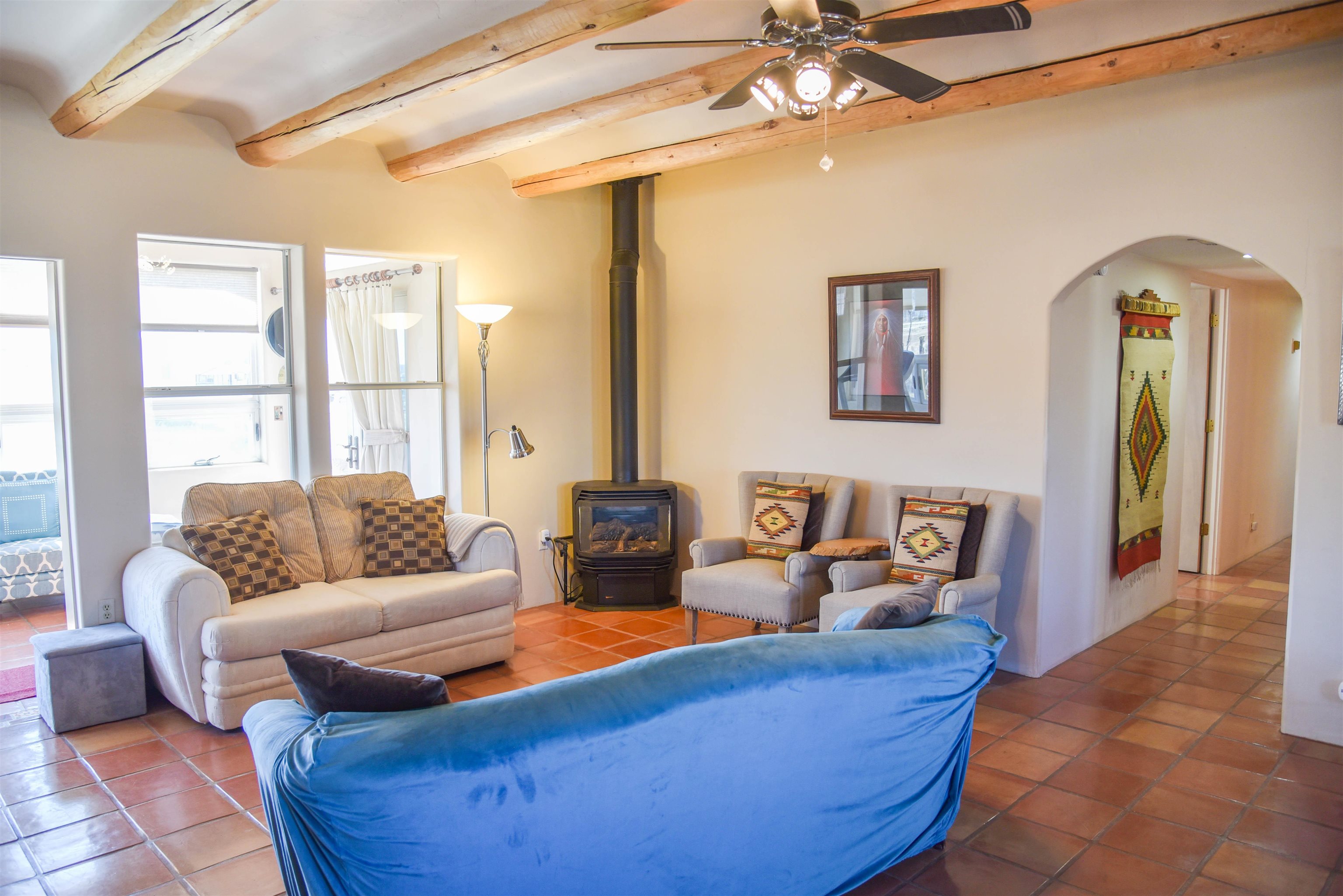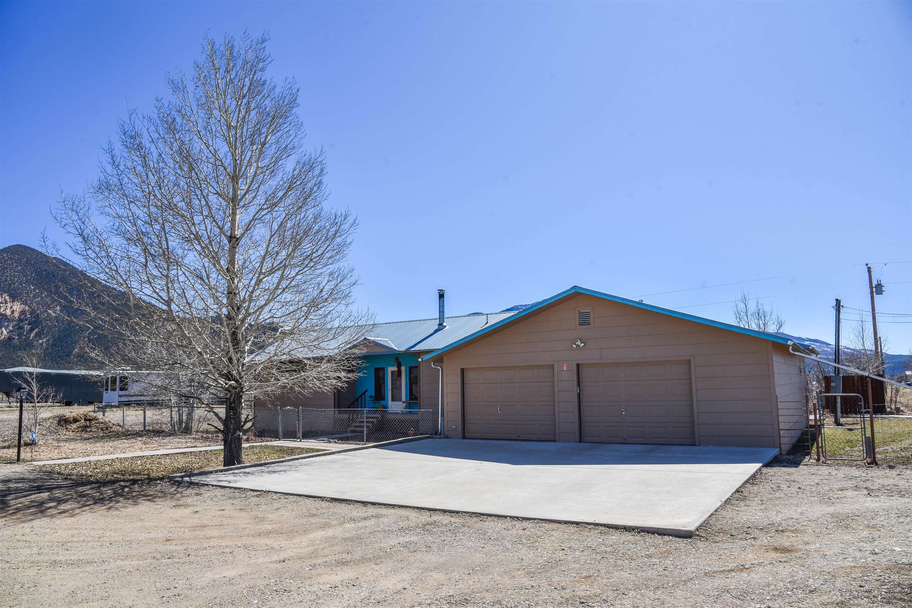 Upon entry into this charming, quaint single-level southwestern style home is the welcoming living room featuring a comfortable seating area, wood stove, gas stove, beautiful vigas and warm well-sought after saltilla tile throughout most of the home. Up the steps to your left is the bright well equipped kitchen with lots of storage and counterspace, a microwave, dishwasher, island, gas stove, new refrigerator (less than 1 yr old) and dining area/work space. Beyond the living room you'll find the ever so warm and inviting sunroom/workout area that overlooks the Eastern mountains and the door leading to the back partially covered sunning deck. Deck is made of composite materials. To the right of the living area you'll find the laundry room complete with a newer water-heater (less than 5 yrs old, a new washer/dryer set (less than 1 yr old), wash tub/sink and a great folding countertop area with plenty of cabinetry for storage. Continuing down the hallway to the left you'll find the first guest bedroom with a futon that folds down into a full-sized bed, closet area and built in drawers for clothing/linen storage. Directly after, you'll find the second bedroom currently used as another workout space also furnished with a closet space and built in drawers. Meanwhile across the hallway, you'll find the full bath complete with a shower/tub combo, linen knook, vanity, and throne. Towards the back of the home, you will come across the TV room/sitting area, the door leading out the attached heated 2-car garage and the master bedroom suite. The master bedroom is large enough to house a king sized bed and nightstands with room to space! Special features are the gas stove, walk-in closet with plenty of hanging space, the large bathroom with walk-in shower, large vanity, throne. And a door leading to the covered portion of the backyard deck (composite) and backyard. Following the sidewath path to the West side of the property you'll find a gate, and the 1500 sq ft. workshop with a single bay door and side entrance ready and willing for projects! On the roof of workshop is where the 6 paid off solar panels live. The yard of this home is completely fenced all the way around. Back at the house in the 2-car garage you'll find a gas stove to heat the garage as well as a pantry/storage knook for any additional storage needs. This home is is currently on Fiber Optic Wi-Fi, Satellite TV and Solar. This home has gorgeous mountain views all around! Perfect for anyone looking to relocate or as an investment property whether short-term or long-rental!!! Selling mostly furnished. Priced to sell fast! Best deal on the market, schedule your showing today!!!