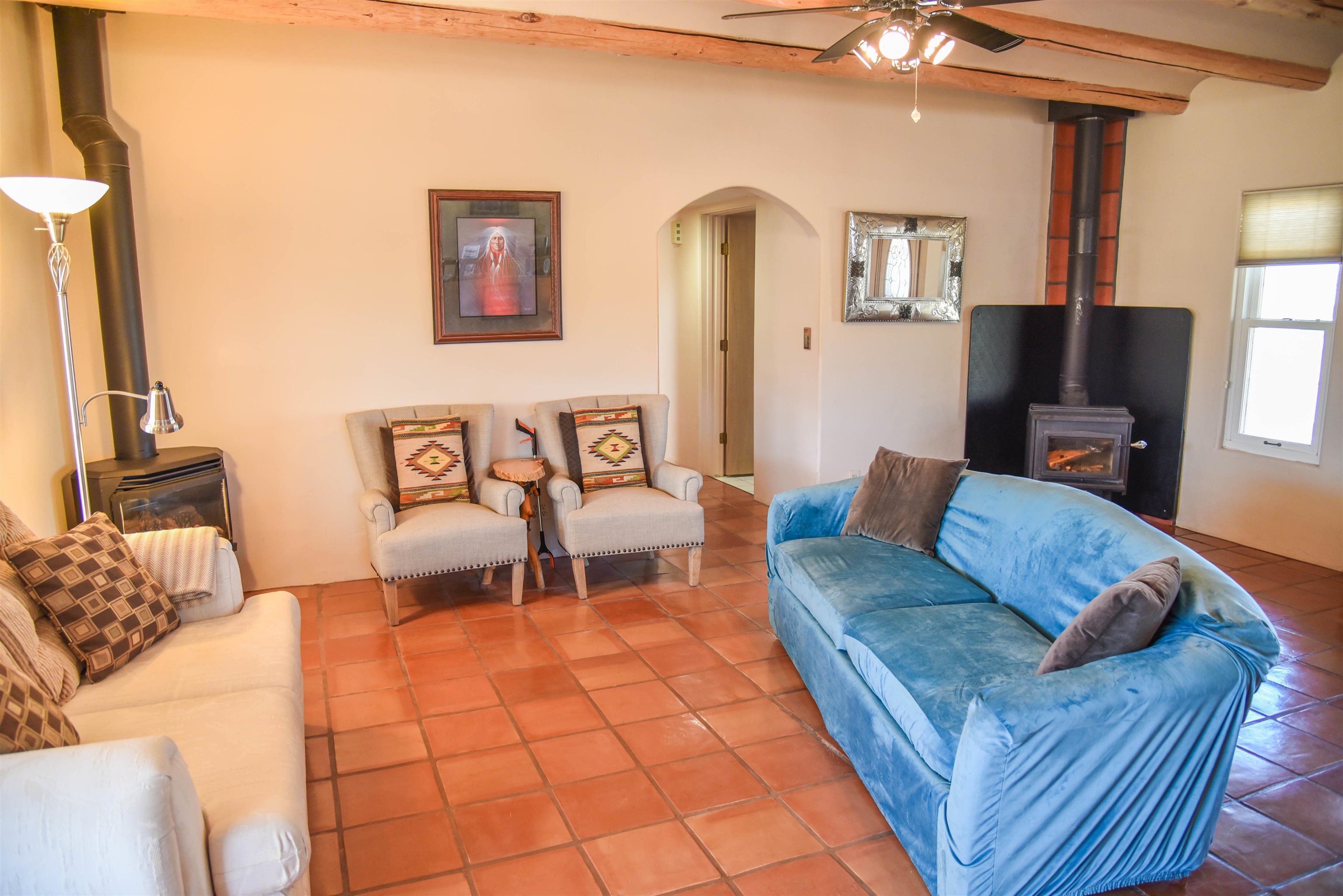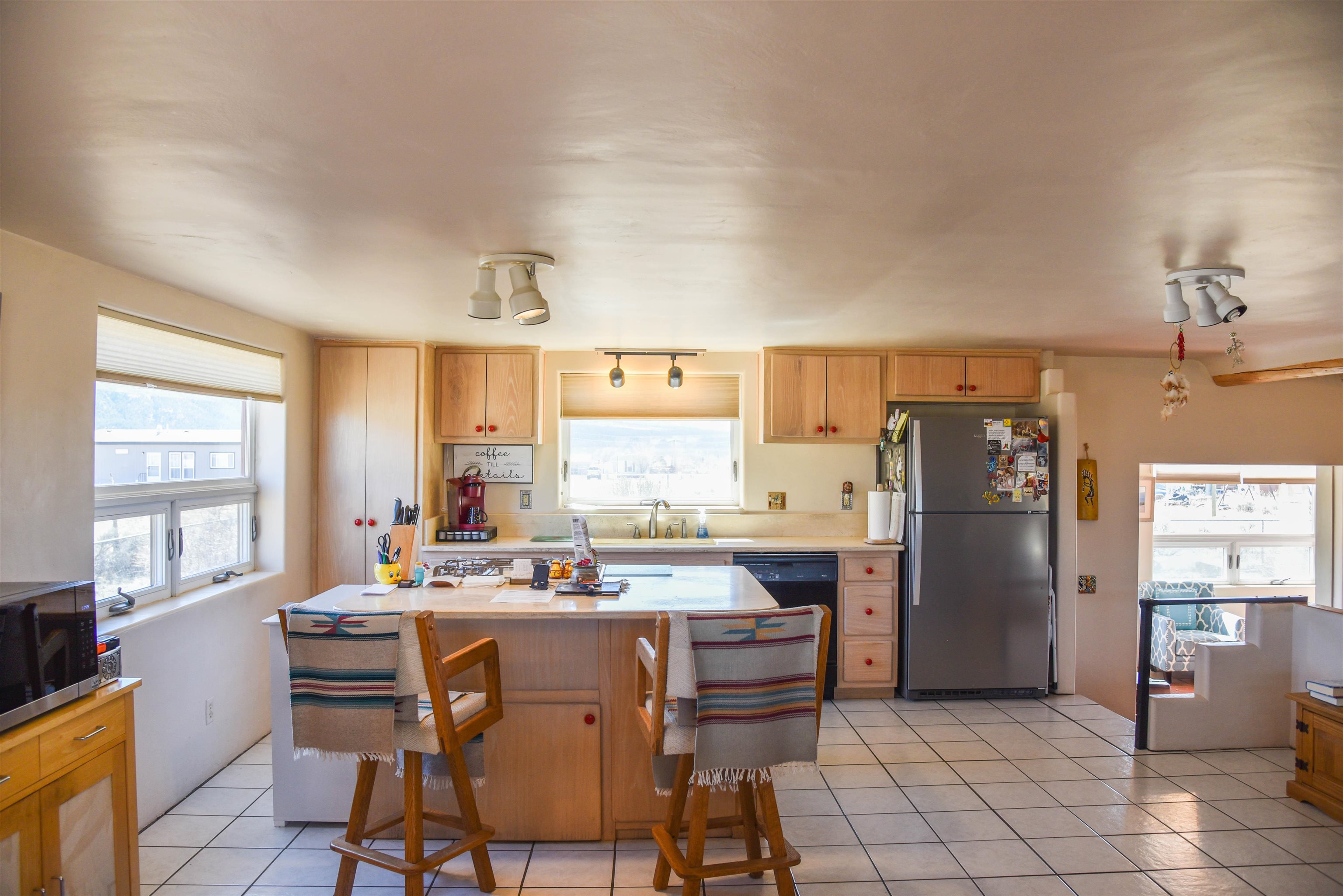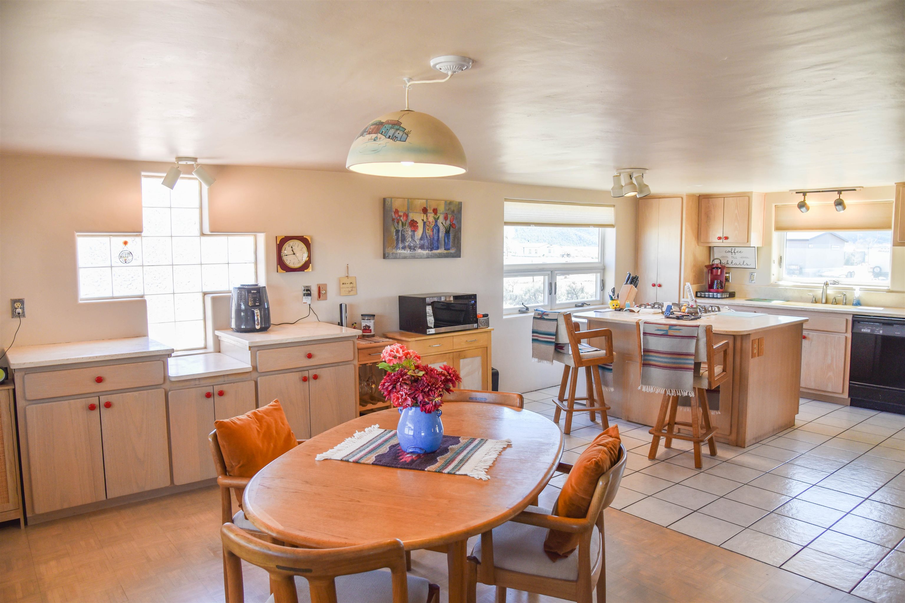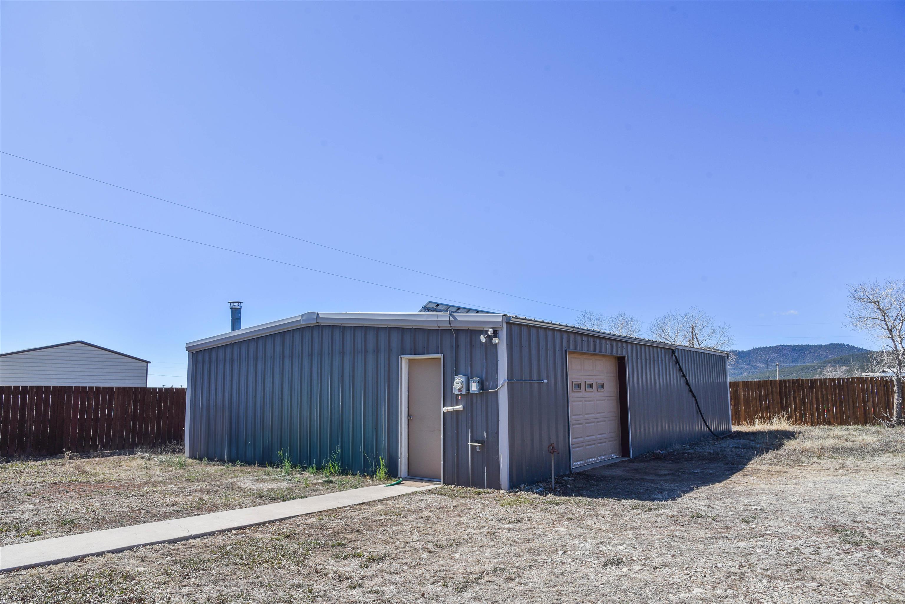 Upon entry into this charming, quaint single-level southwestern style home is the welcoming living room featuring a comfortable seating area, wood stove, gas stove, beautiful vigas and warm well-sought after saltilla tile throughout most of the home. Up the steps to your left is the bright well equipped kitchen with lots of storage and counterspace, a microwave, dishwasher, island, gas stove, new refrigerator (less than 1 yr old) and dining area/work space. Beyond the living room you'll find the ever so warm and inviting sunroom/workout area that overlooks the Eastern mountains and the door leading to the back partially covered sunning deck. Deck is made of composite materials. To the right of the living area you'll find the laundry room complete with a newer water-heater (less than 5 yrs old, a new washer/dryer set (less than 1 yr old), wash tub/sink and a great folding countertop area with plenty of cabinetry for storage. Continuing down the hallway to the left you'll find the first guest bedroom with a futon that folds down into a full-sized bed, closet area and built in drawers for clothing/linen storage. Directly after, you'll find the second bedroom currently used as another workout space also furnished with a closet space and built in drawers. Meanwhile across the hallway, you'll find the full bath complete with a shower/tub combo, linen knook, vanity, and throne. Towards the back of the home, you will come across the TV room/sitting area, the door leading out the attached heated 2-car garage and the master bedroom suite. The master bedroom is large enough to house a king sized bed and nightstands with room to space! Special features are the gas stove, walk-in closet with plenty of hanging space, the large bathroom with walk-in shower, large vanity, throne. And a door leading to the covered portion of the backyard deck (composite) and backyard. Following the sidewath path to the West side of the property you'll find a gate, and the 1500 sq ft. workshop with a single bay door and side entrance ready and willing for projects! On the roof of workshop is where the 6 paid off solar panels live. The yard of this home is completely fenced all the way around. Back at the house in the 2-car garage you'll find a gas stove to heat the garage as well as a pantry/storage knook for any additional storage needs. This home is is currently on Fiber Optic Wi-Fi, Satellite TV and Solar. This home has gorgeous mountain views all around! Perfect for anyone looking to relocate or as an investment property whether short-term or long-rental!!! Selling mostly furnished. Priced to sell fast! Best deal on the market, schedule your showing today!!!