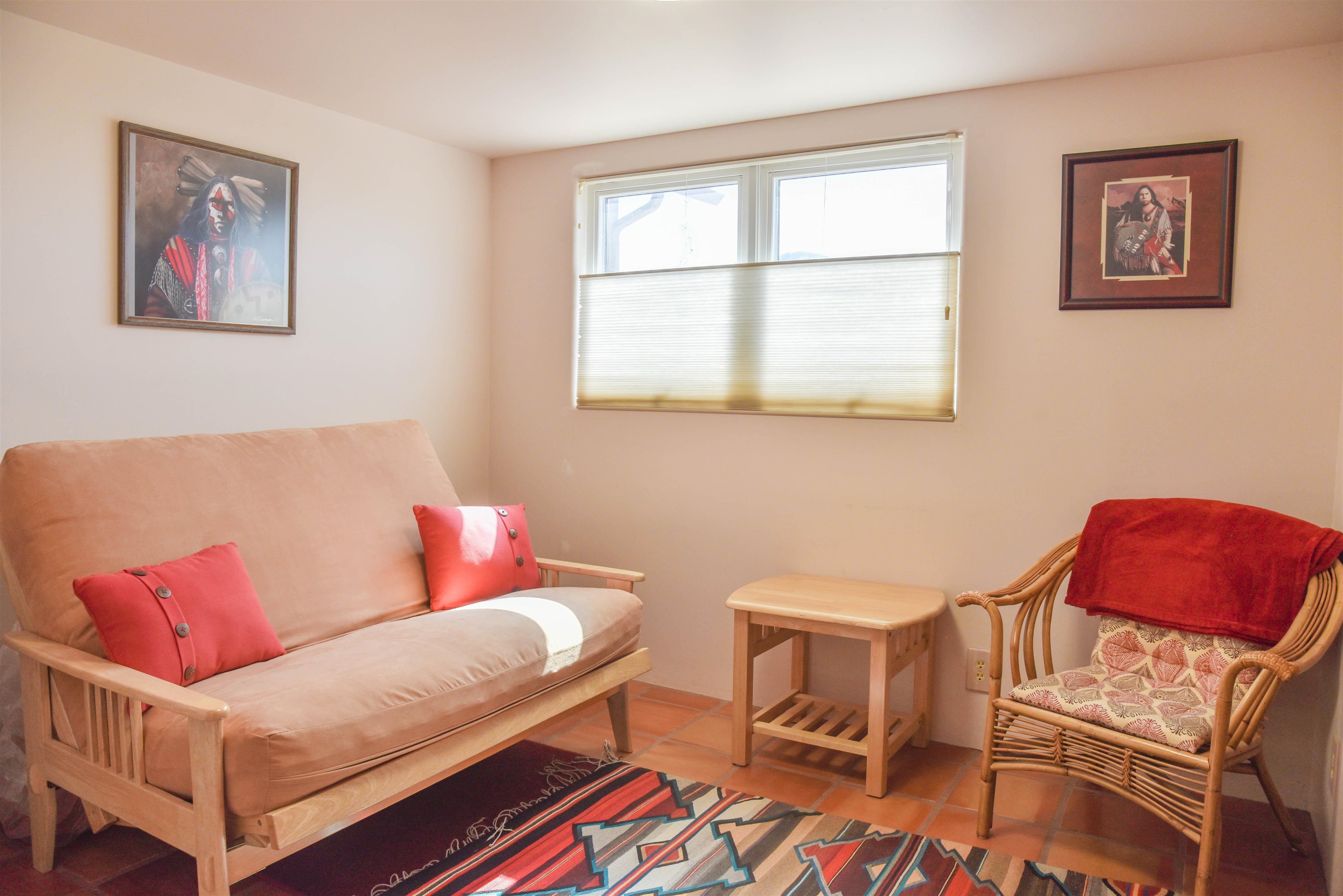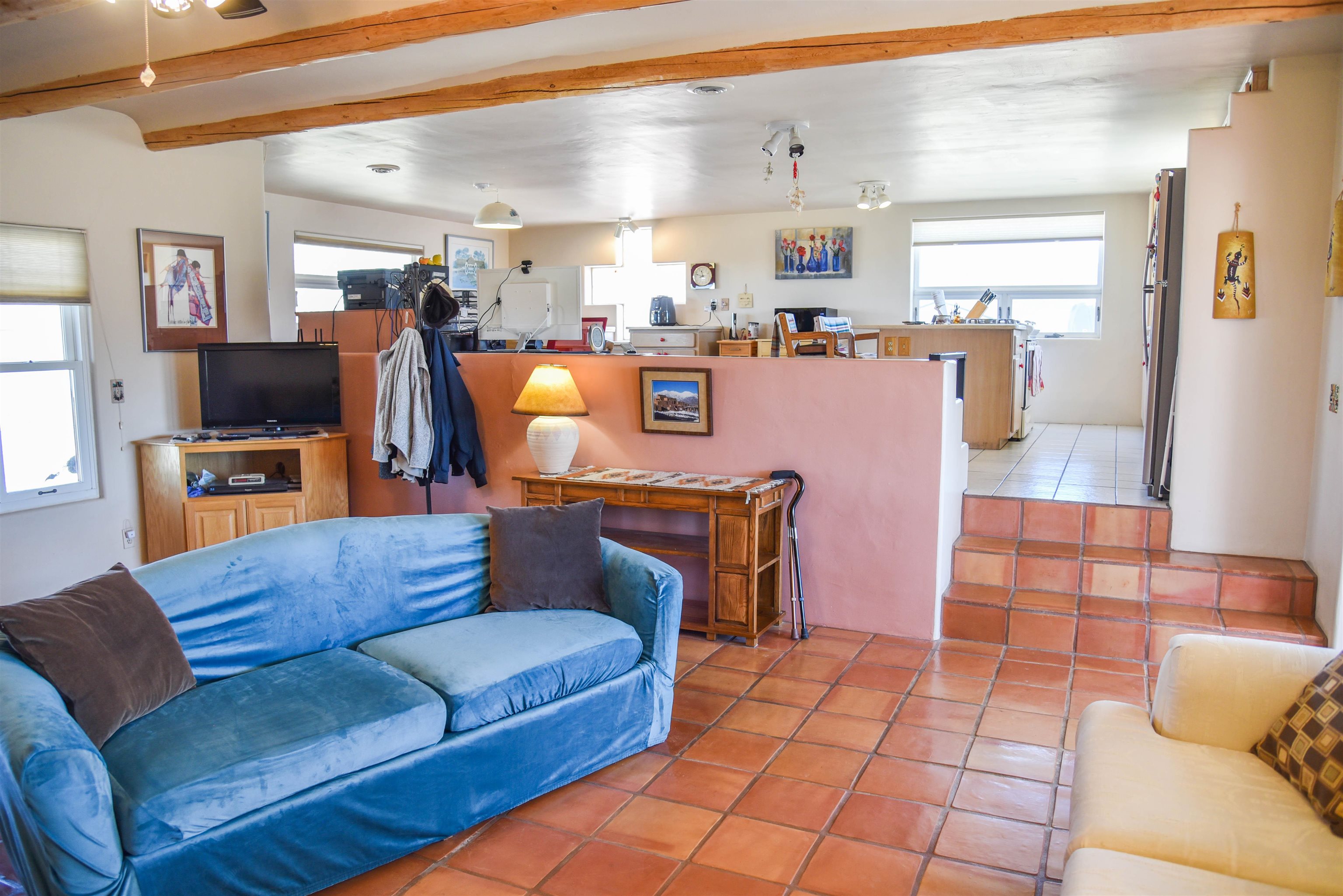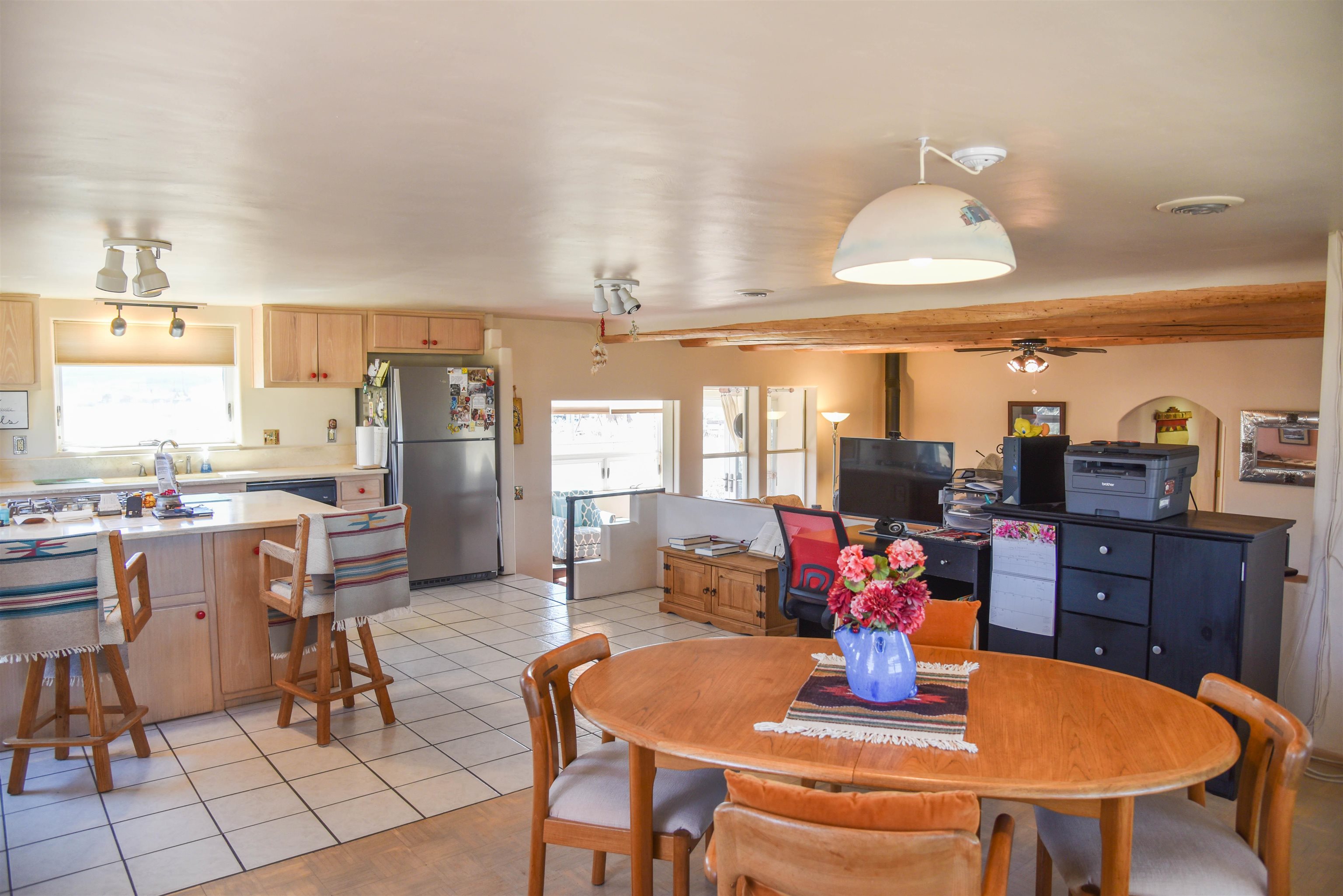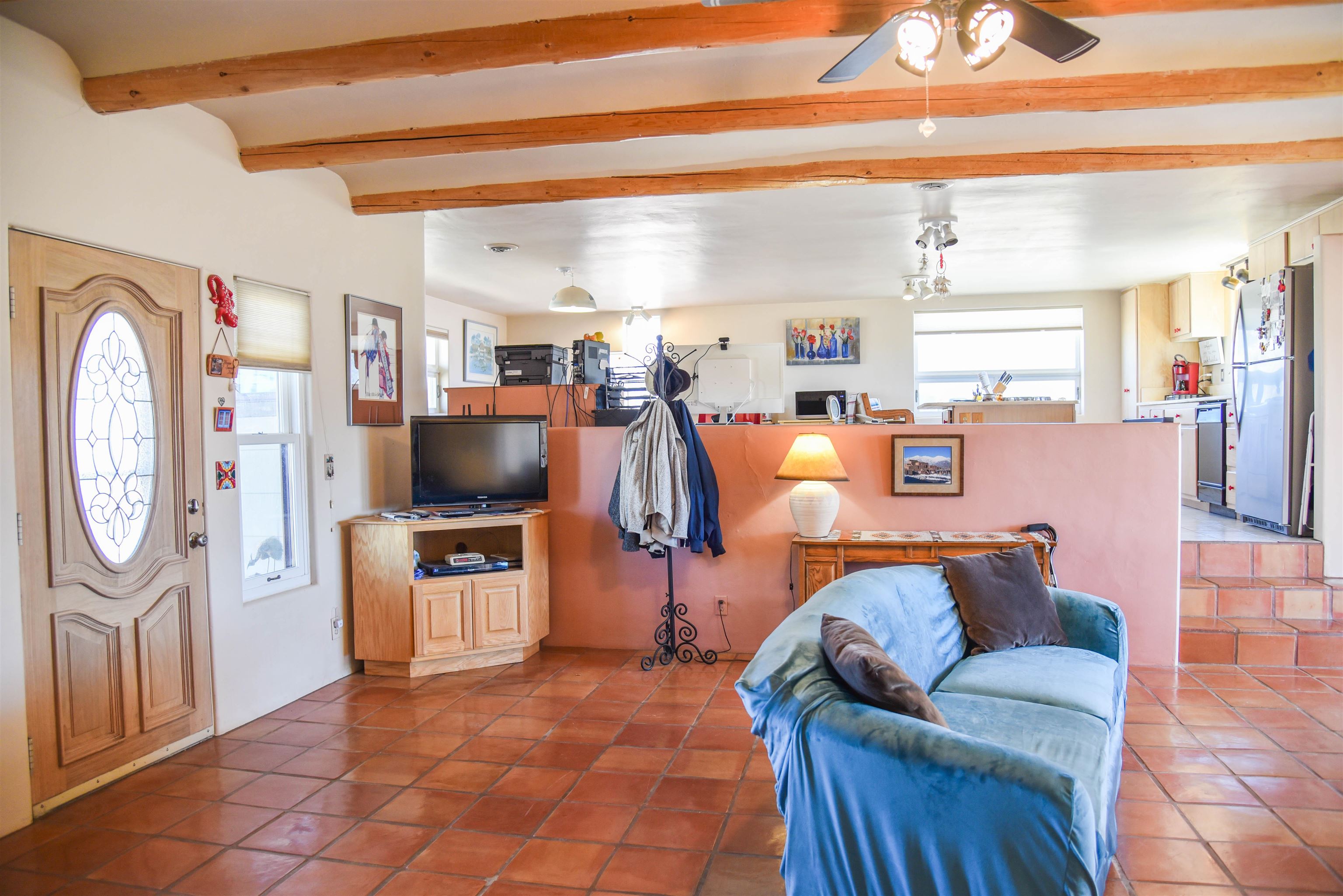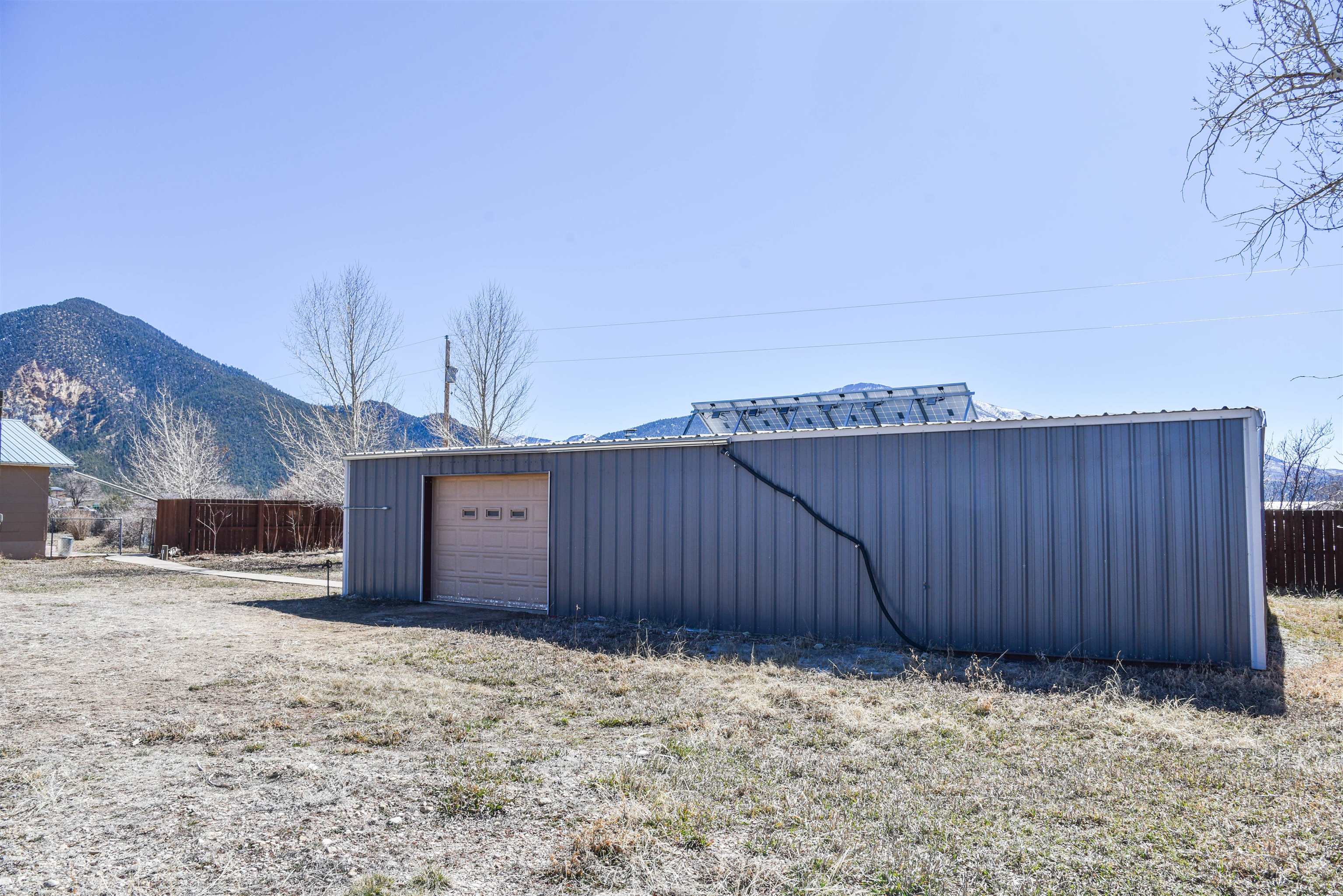 Upon entry into this charming, quaint single-level southwestern style home is the welcoming living room featuring a comfortable seating area, wood stove, gas stove, beautiful vigas and warm well-sought after saltilla tile throughout most of the home. Up the steps to your left is the bright well equipped kitchen with lots of storage and counterspace, a microwave, dishwasher, island, gas stove, new refrigerator (less than 1 yr old) and dining area/work space. Beyond the living room you'll find the ever so warm and inviting sunroom/workout area that overlooks the Eastern mountains and the door leading to the back partially covered sunning deck. Deck is made of composite materials. To the right of the living area you'll find the laundry room complete with a newer water-heater (less than 5 yrs old, a new washer/dryer set (less than 1 yr old), wash tub/sink and a great folding countertop area with plenty of cabinetry for storage. Continuing down the hallway to the left you'll find the first guest bedroom with a futon that folds down into a full-sized bed, closet area and built in drawers for clothing/linen storage. Directly after, you'll find the second bedroom currently used as another workout space also furnished with a closet space and built in drawers. Meanwhile across the hallway, you'll find the full bath complete with a shower/tub combo, linen knook, vanity, and throne. Towards the back of the home, you will come across the TV room/sitting area, the door leading out the attached heated 2-car garage and the master bedroom suite. The master bedroom is large enough to house a king sized bed and nightstands with room to space! Special features are the gas stove, walk-in closet with plenty of hanging space, the large bathroom with walk-in shower, large vanity, throne. And a door leading to the covered portion of the backyard deck (composite) and backyard. Following the sidewath path to the West side of the property you'll find a gate, and the 1500 sq ft. workshop with a single bay door and side entrance ready and willing for projects! On the roof of workshop is where the 6 paid off solar panels live. The yard of this home is completely fenced all the way around. Back at the house in the 2-car garage you'll find a gas stove to heat the garage as well as a pantry/storage knook for any additional storage needs. This home is is currently on Fiber Optic Wi-Fi, Satellite TV and Solar. This home has gorgeous mountain views all around! Perfect for anyone looking to relocate or as an investment property whether short-term or long-rental!!! Selling mostly furnished. Priced to sell fast! Best deal on the market, schedule your showing today!!!