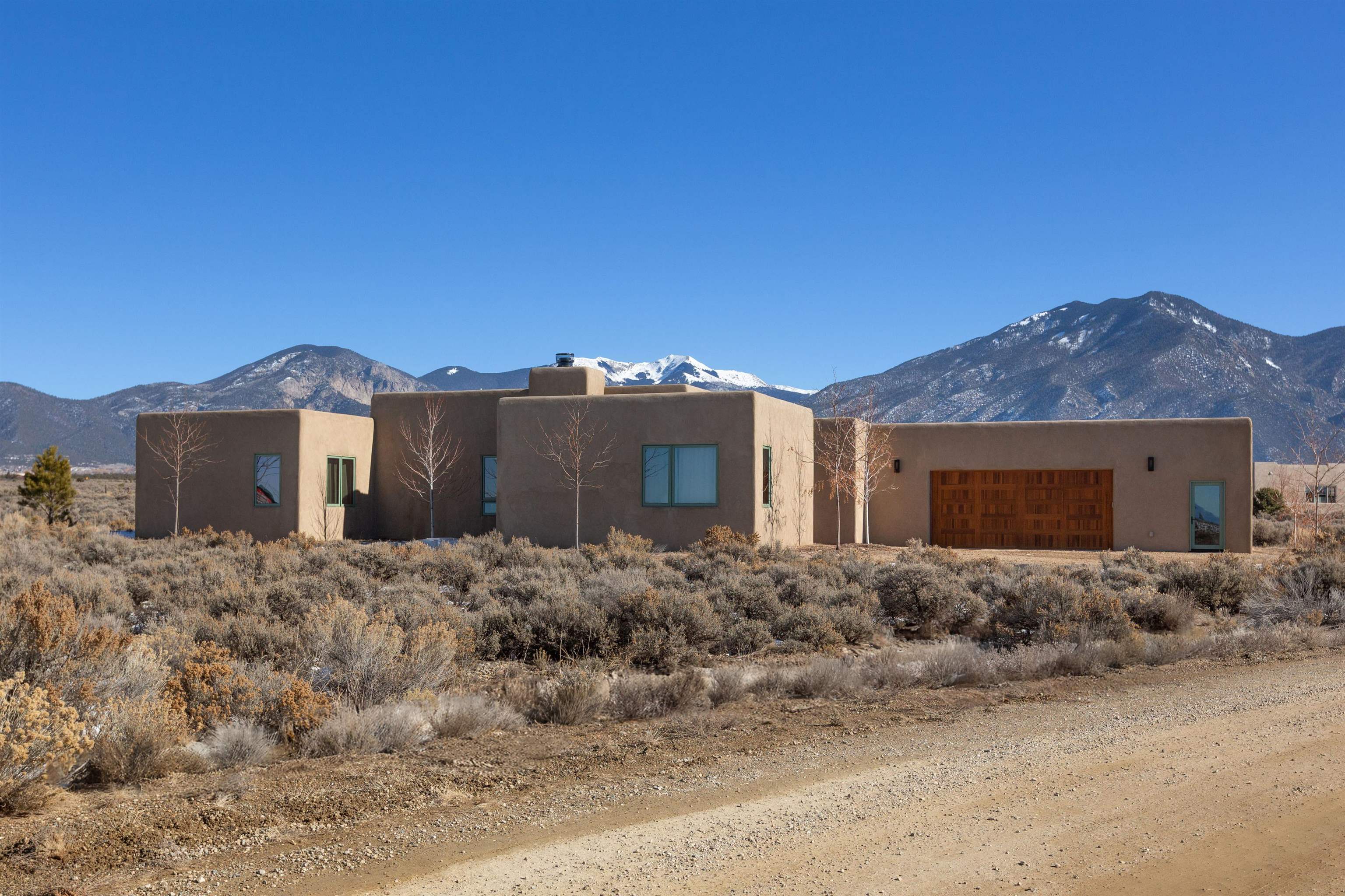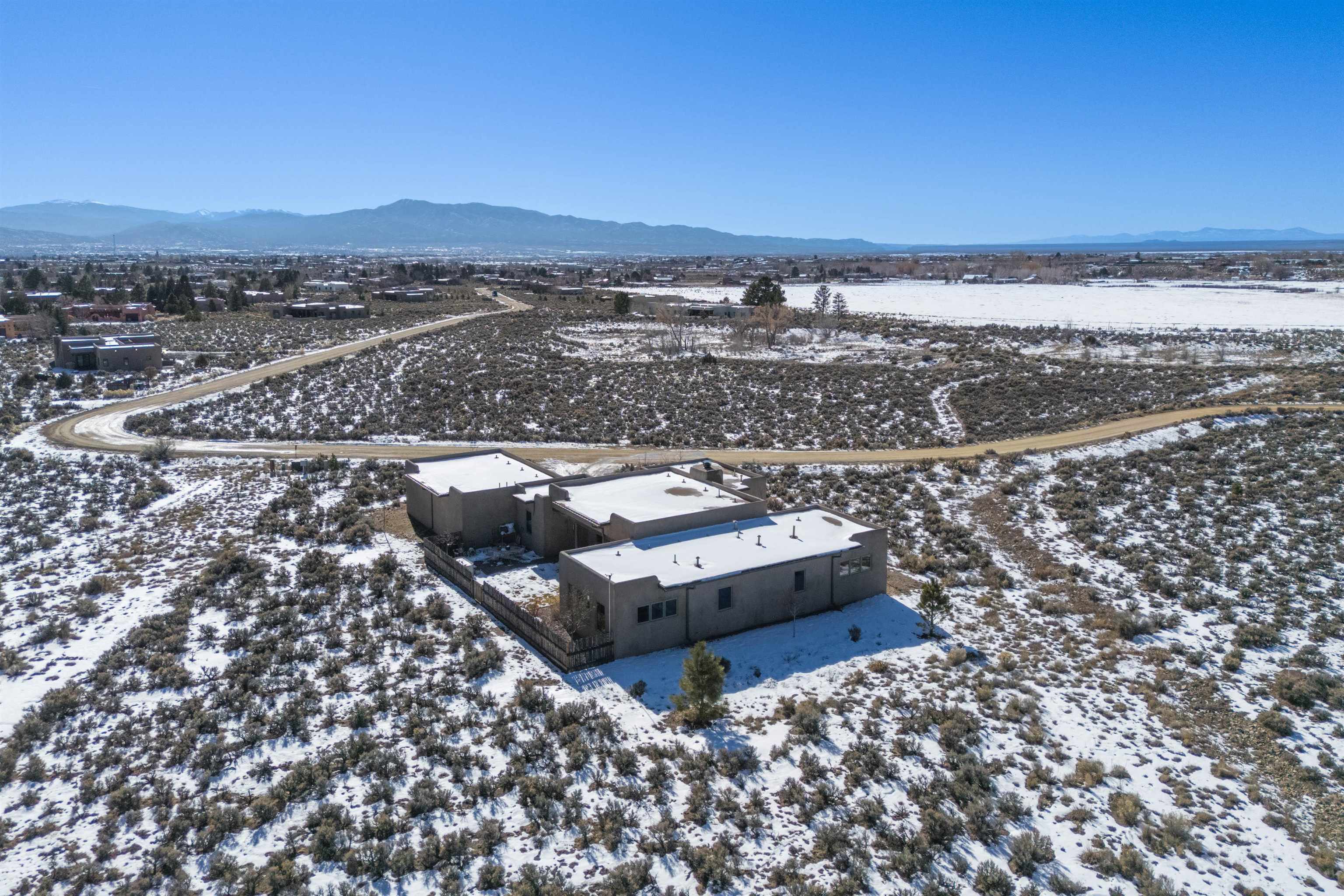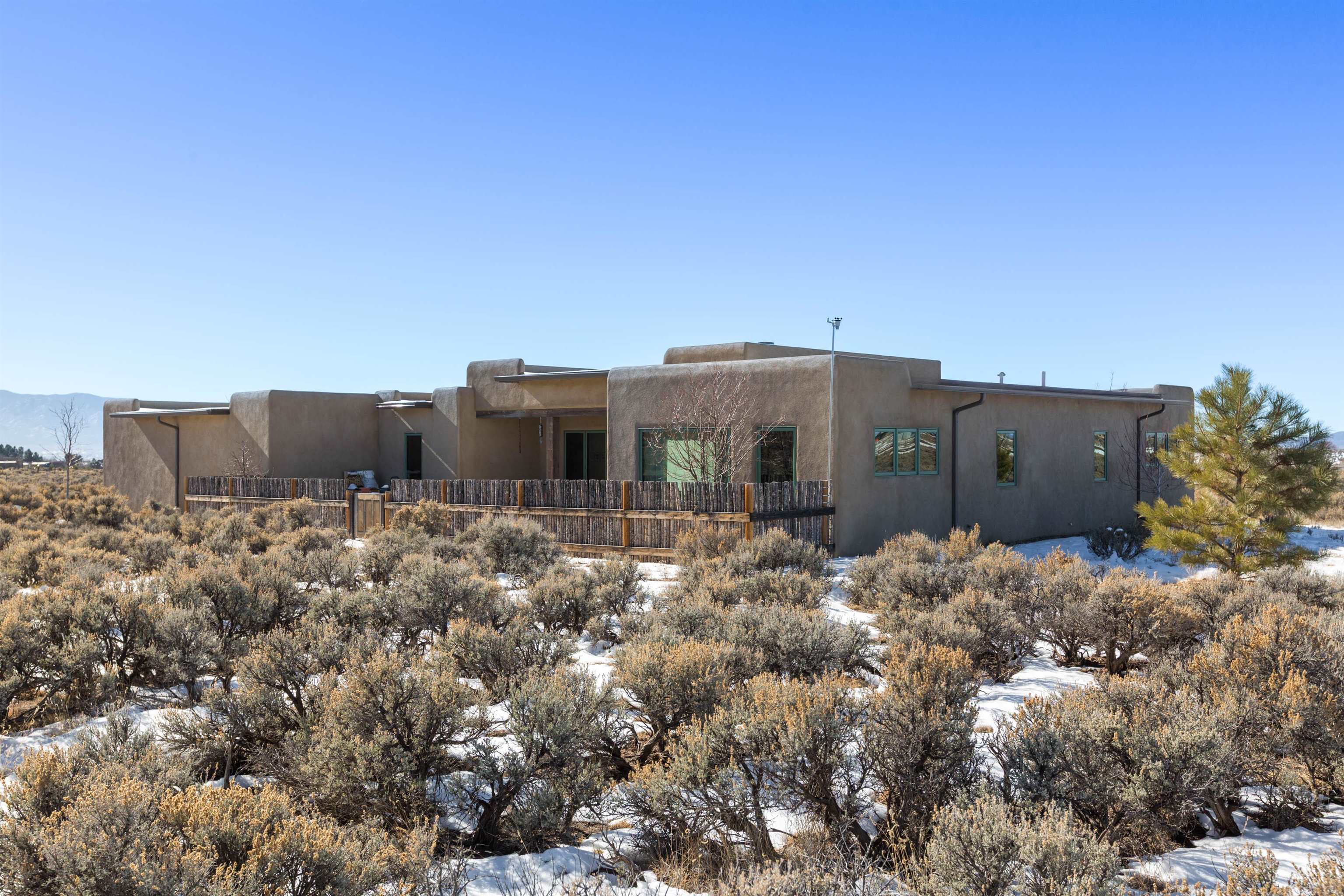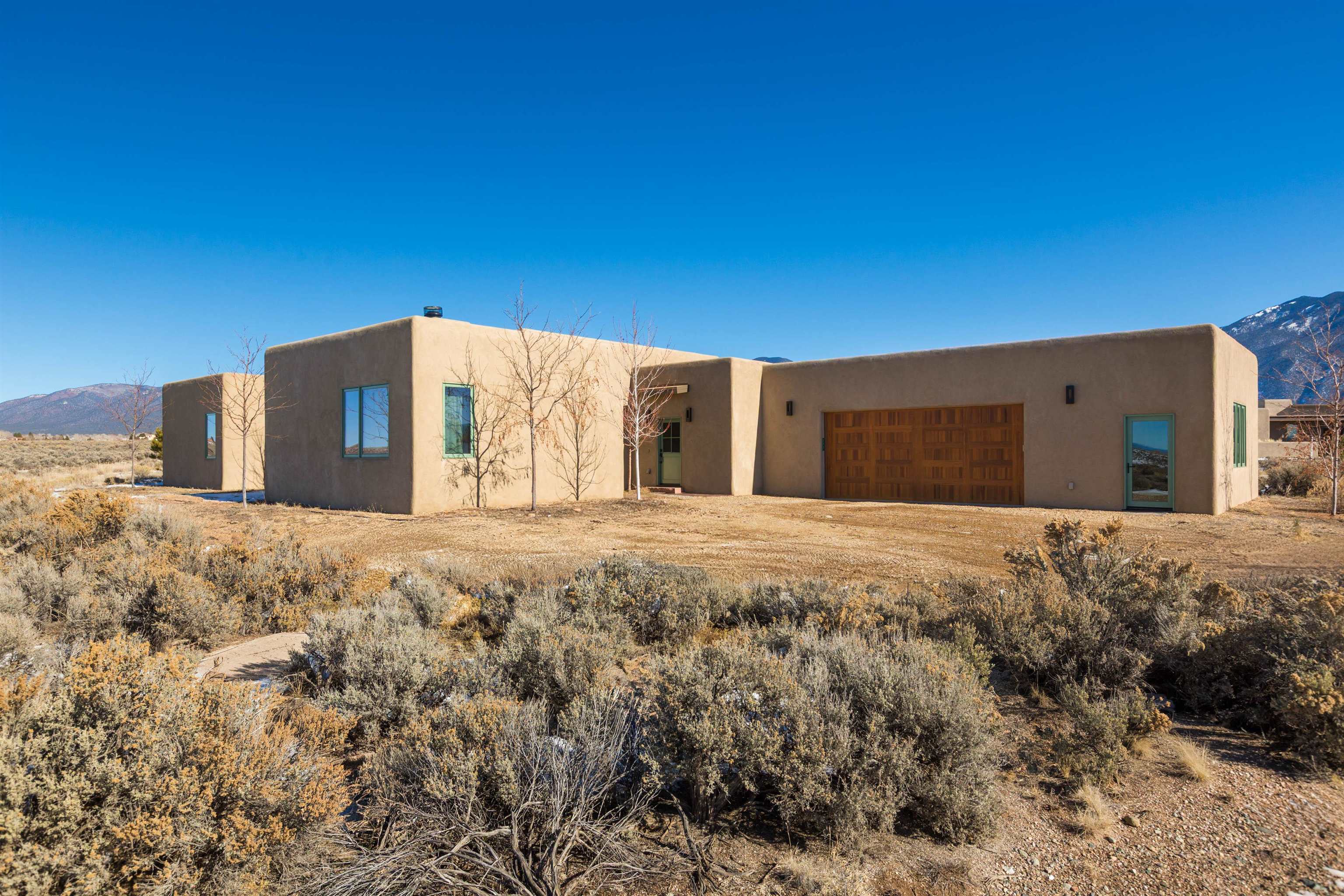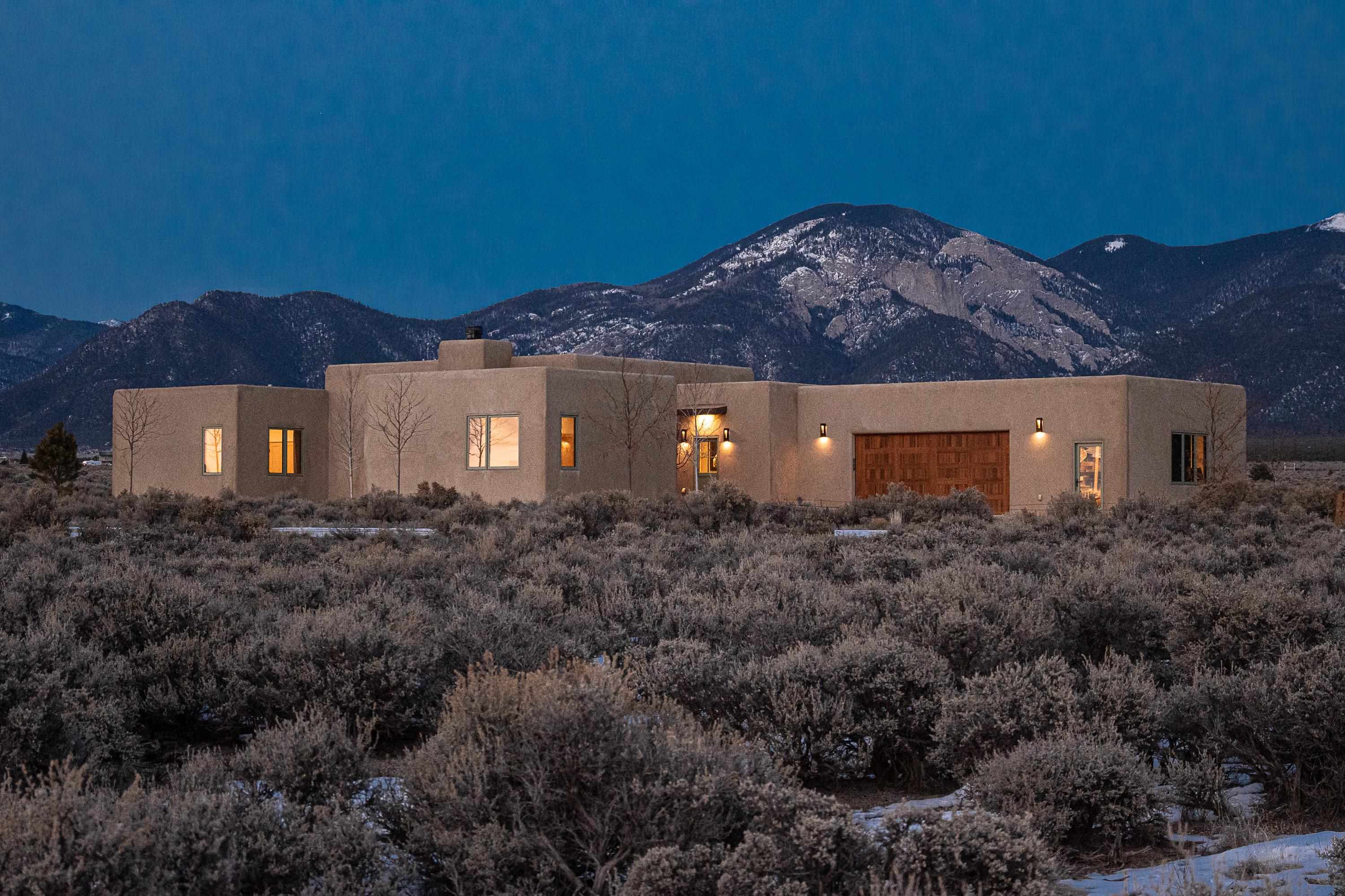 Set in a coveted northside location with expansive views of Taos Mountain, this beautifully crafted contemporary Southwestern home by Edelman Enterprises offers an effortless blend of comfort, quality, and style. Thoughtfully designed with wonderful natural light throughout, the home features three bedrooms and three baths with a spacious, flowing layout ideal for both everyday living and entertaining. The open great room and kitchen serve as the heart of the home, seamlessly connecting to a covered portal that opens onto a lush grassy lawn—perfect for morning coffee, evening gatherings, or simply taking in the mountain air. Clean architectural lines and warm Southwestern finishes create an inviting yet refined atmosphere. A gigantic oversized heated, attached two-car garage (equipped with EV Charging) provides abundant space for vehicles, storage, or gear for all your Taos adventures. With its sought-after northside setting, quality construction, and easy indoor-outdoor living, this property offers a rare opportunity to enjoy the very best of Taos living.