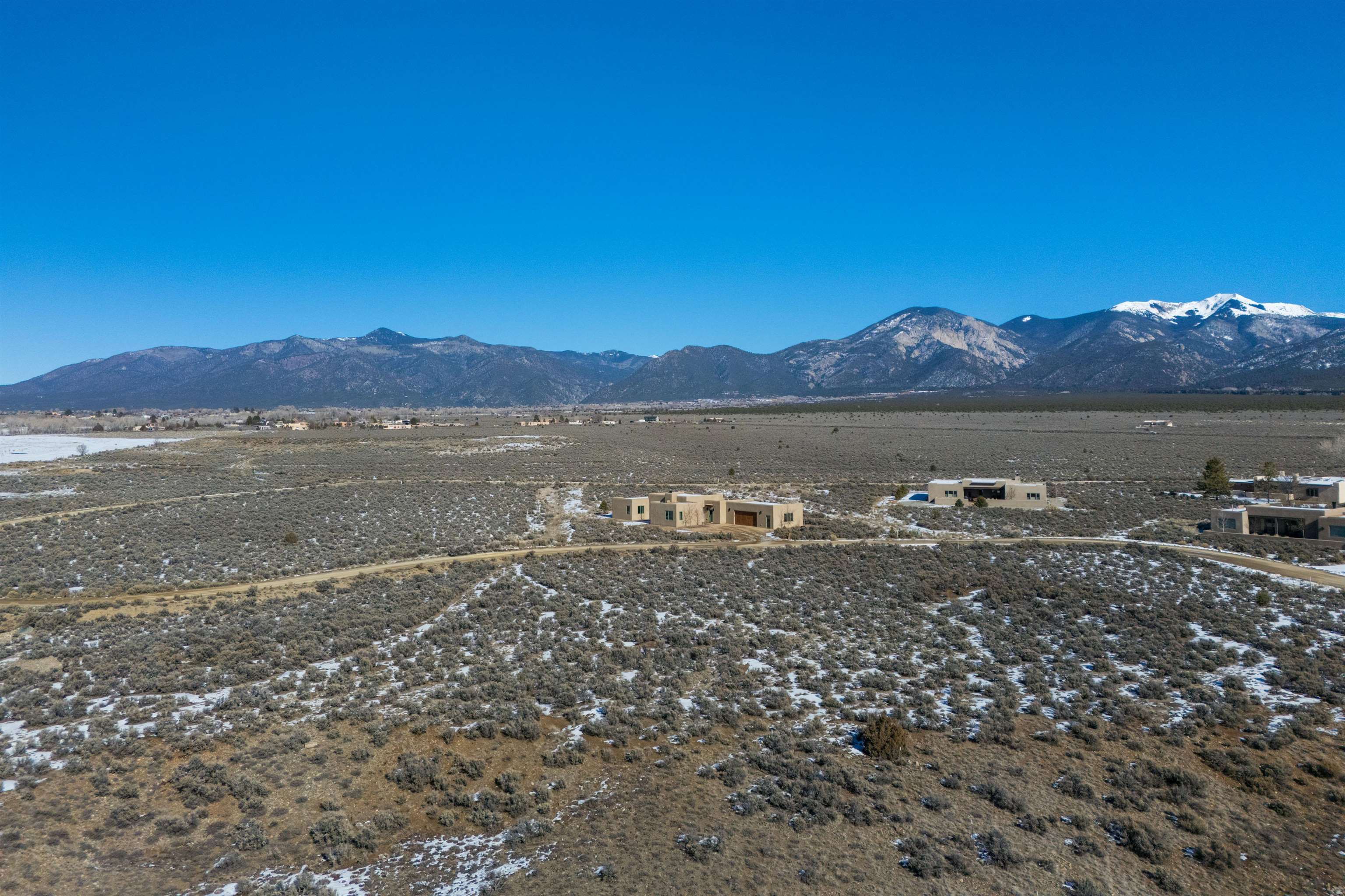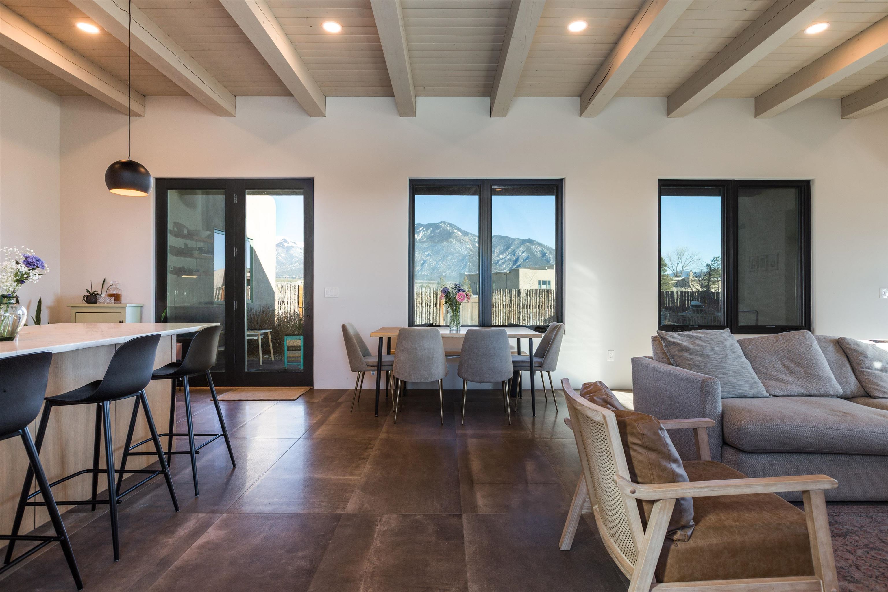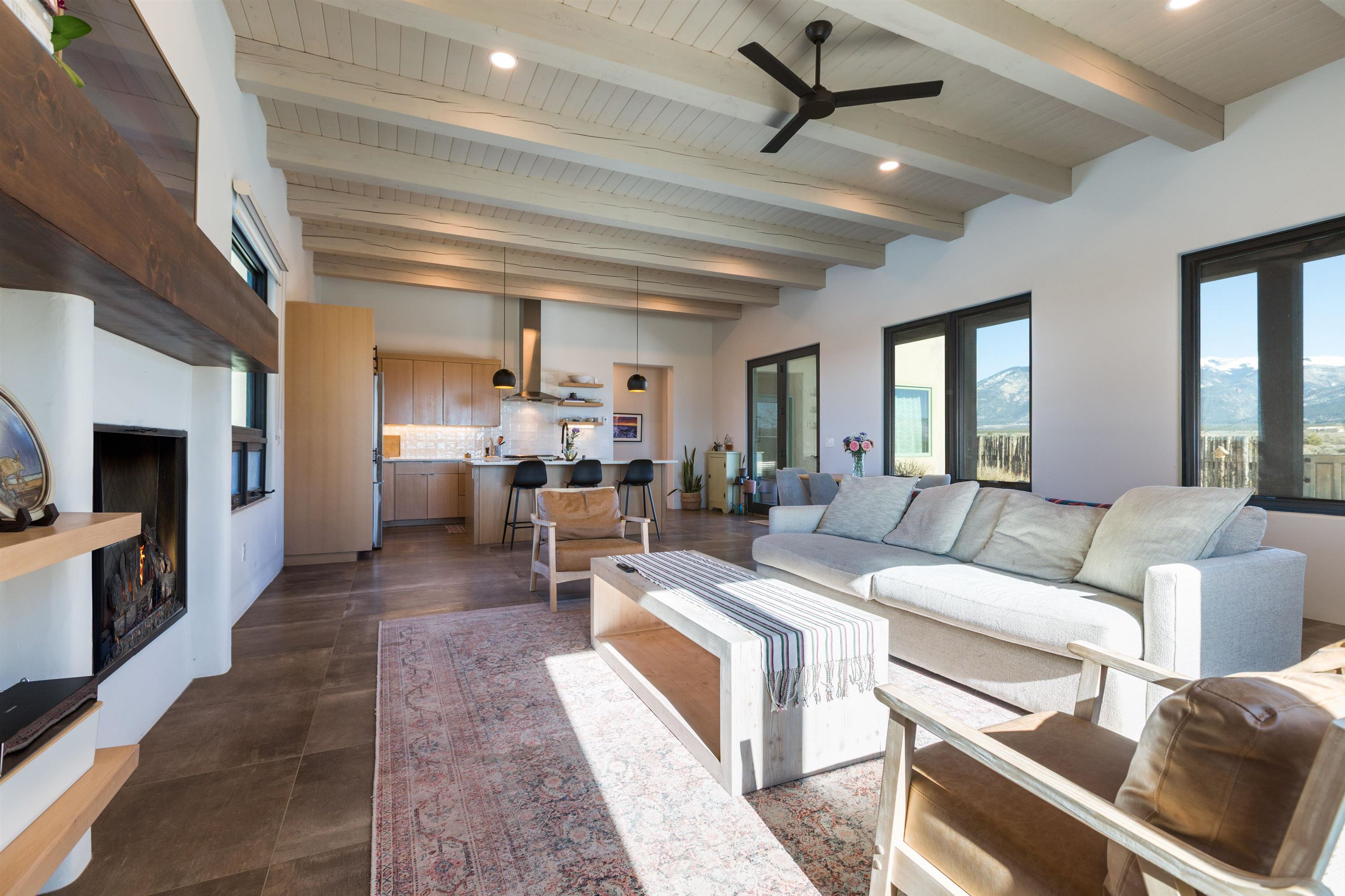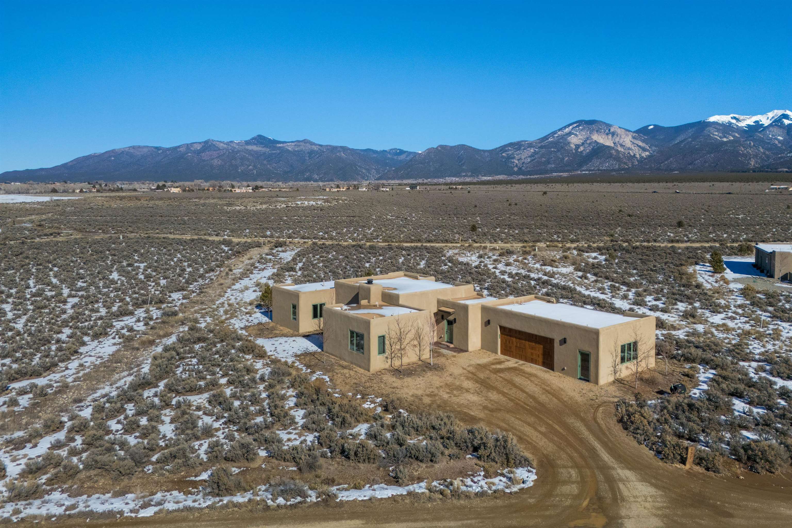 Set in a coveted northside location with expansive views of Taos Mountain, this beautifully crafted contemporary Southwestern home by Edelman Enterprises offers an effortless blend of comfort, quality, and style. Thoughtfully designed with wonderful natural light throughout, the home features three bedrooms and three baths with a spacious, flowing layout ideal for both everyday living and entertaining. The open great room and kitchen serve as the heart of the home, seamlessly connecting to a covered portal that opens onto a lush grassy lawn—perfect for morning coffee, evening gatherings, or simply taking in the mountain air. Clean architectural lines and warm Southwestern finishes create an inviting yet refined atmosphere. A gigantic oversized heated, attached two-car garage (equipped with EV Charging) provides abundant space for vehicles, storage, or gear for all your Taos adventures. With its sought-after northside setting, quality construction, and easy indoor-outdoor living, this property offers a rare opportunity to enjoy the very best of Taos living.
