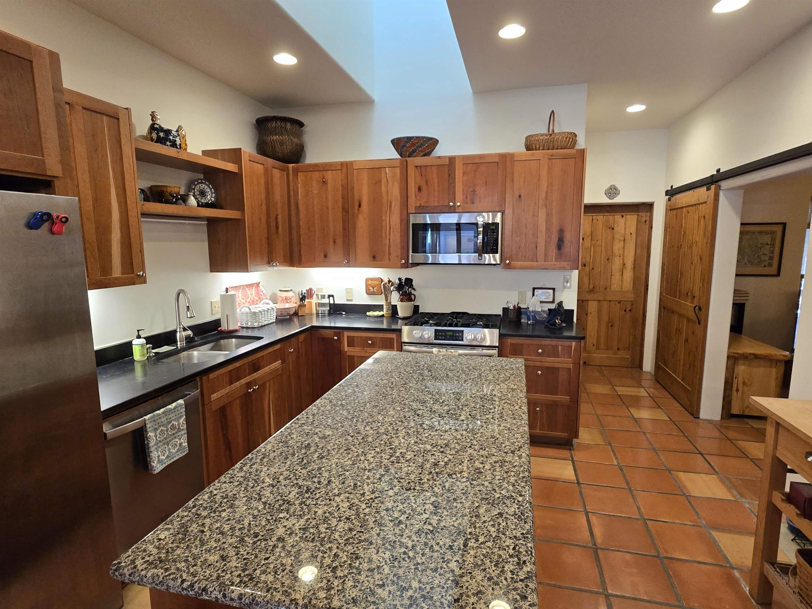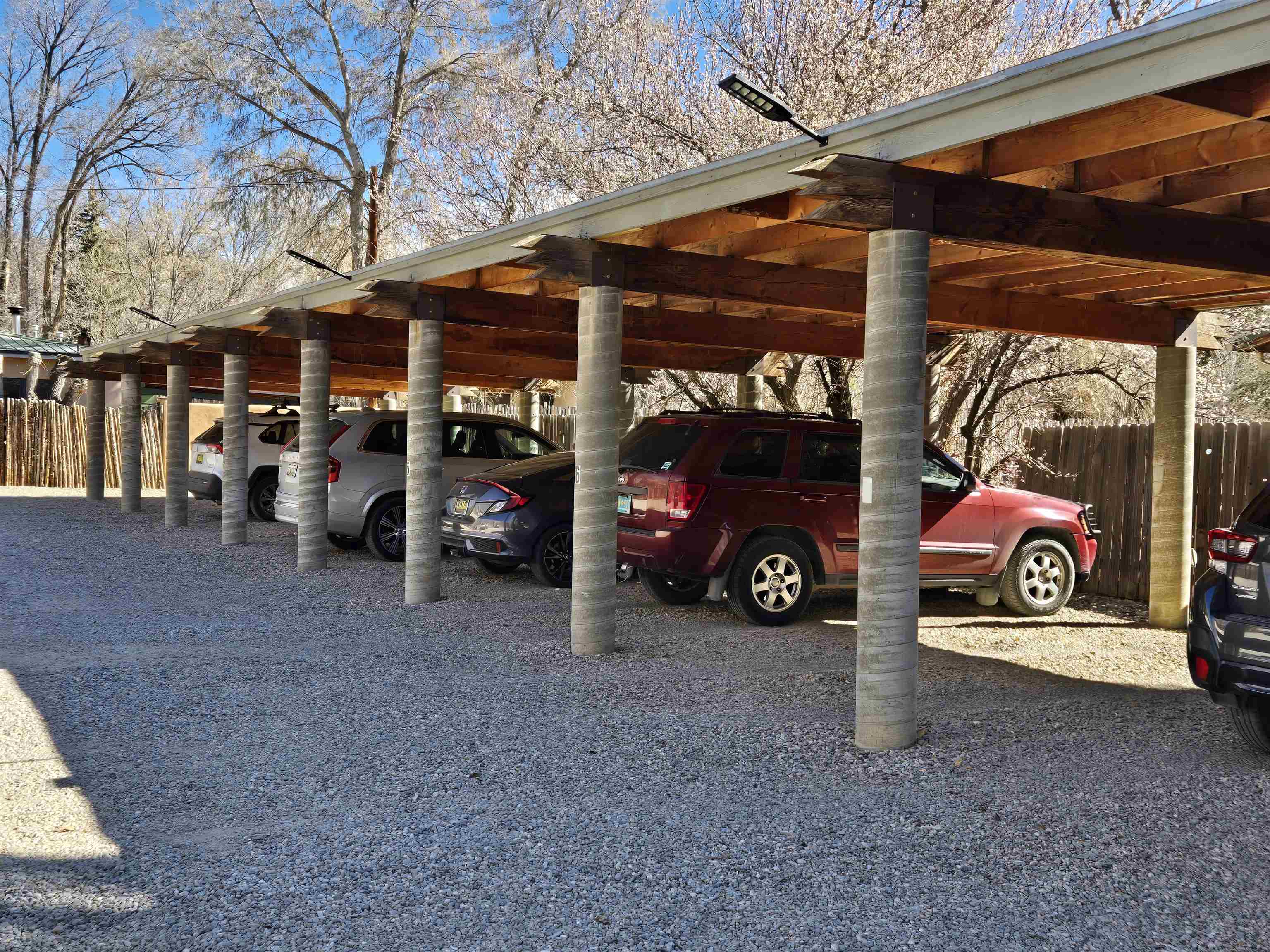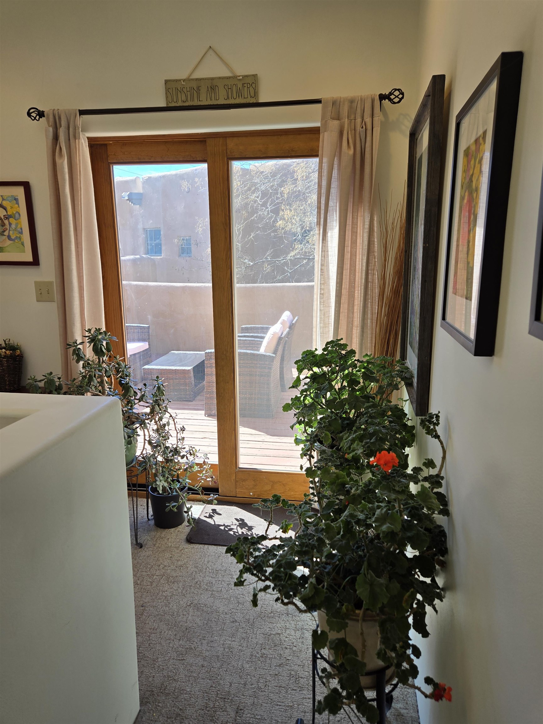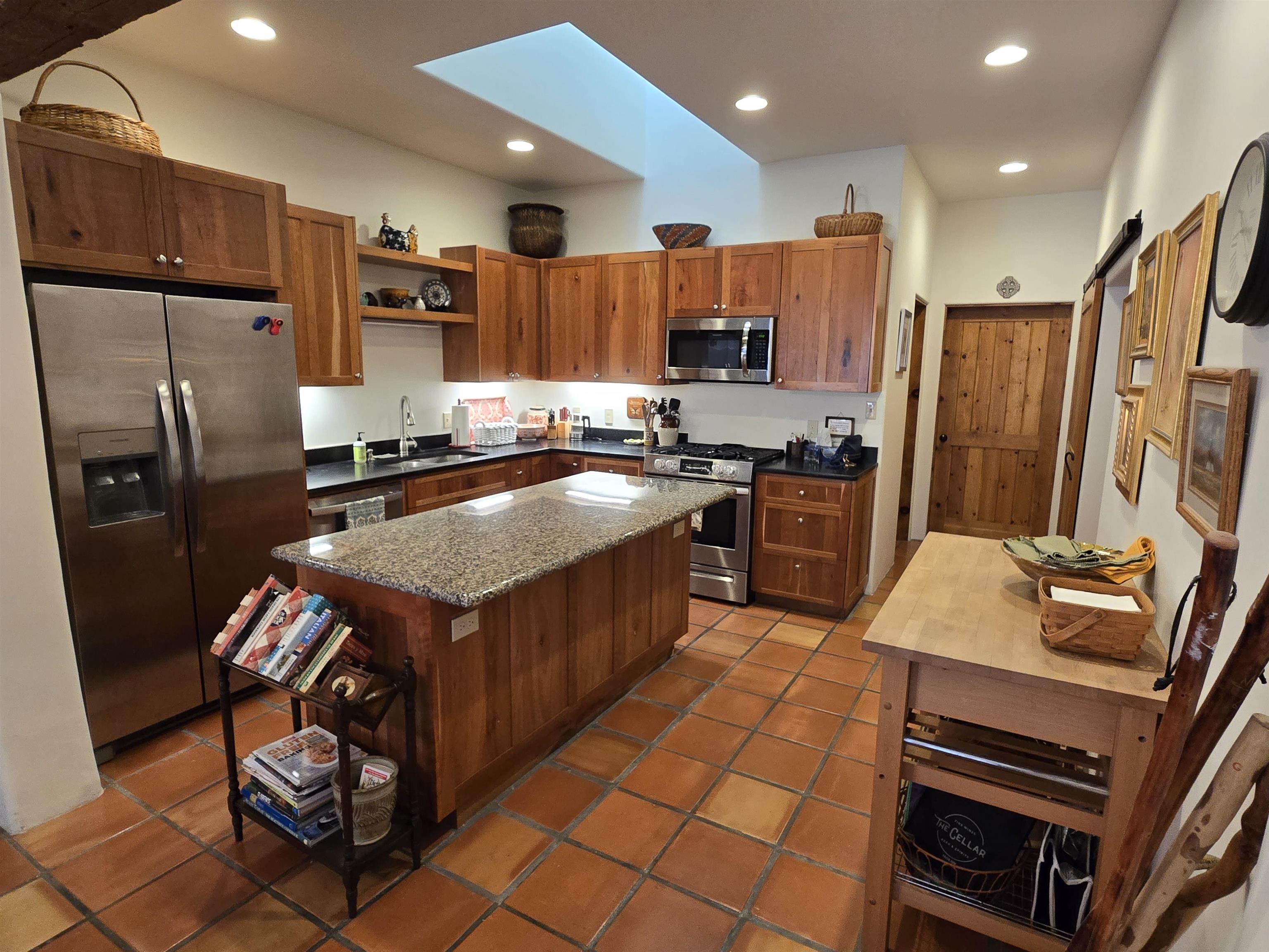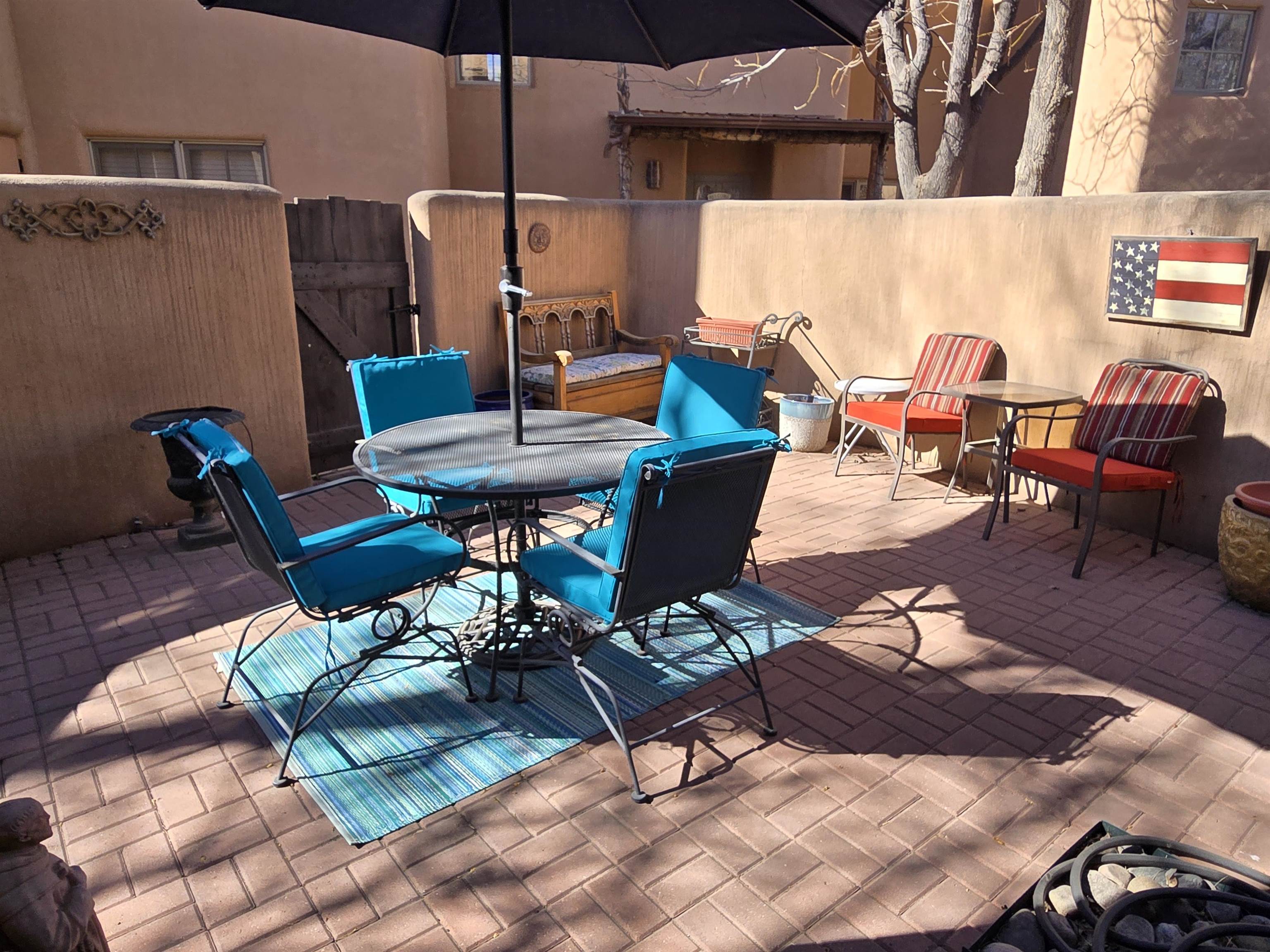 This Kit Carson Road two bedroom two and a half bath condominium location is the place you need to be, within walking distance of dining, shopping, music and galleries downtown in Taos. This quiet compound is home to just nineteen units on a shady street. The two-story condominium has a lovely open floorplan that expands out onto a private courtyard where your potted flowers will glow. Remodeled in 2022, this unit saw top quality upgrades of cabinetry, stainless appliances, new Saltillo tile flooring throughout the ground floor and an on demand water heater for endless showers! Granite countertops sparkle under the two-story skylight. The kitchen supplies ample storage in the rich wood cabinets and island. The owners love to entertain, and the space worked beautifully for many functions throughout the seasons. The large LIVING ROOM is so cozy with handsome vigas, the Pueblo-style gas fireplace and wood frame windows. The warmth of wood flows through the home with pretty raised panel wood doors. Ceiling fans circulate fresh air in handsome fashion. The quality Hunter blinds work seamlessly, opening from top or bottom to control the streaming sunlight or privacy. Large sliding patio doors open out to the private courtyard from the dining room. The main floor also features a BEDROOM / OFFICE with ensuite bath, large closet, a powder room with laundry closet and large under staircase storage area. Upstairs a LARGE PRIMARY BEDROOM is spacious enough to share an art studio area. It features a lovely bath with a large tub, linen cabinets and sunny glass block corner to spread the sky light around. The upper level has its own deck with space for seating overlooking a sunny southern exposure and fresh mountain air. These units do not stay on the market long, so call to request a showing today.