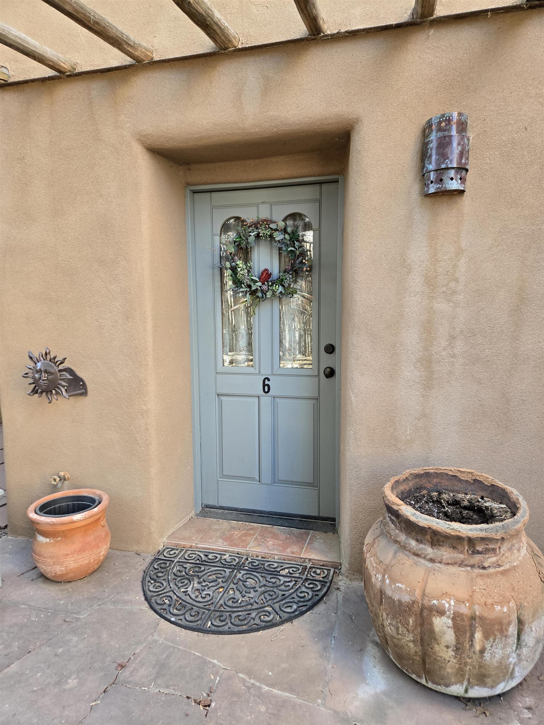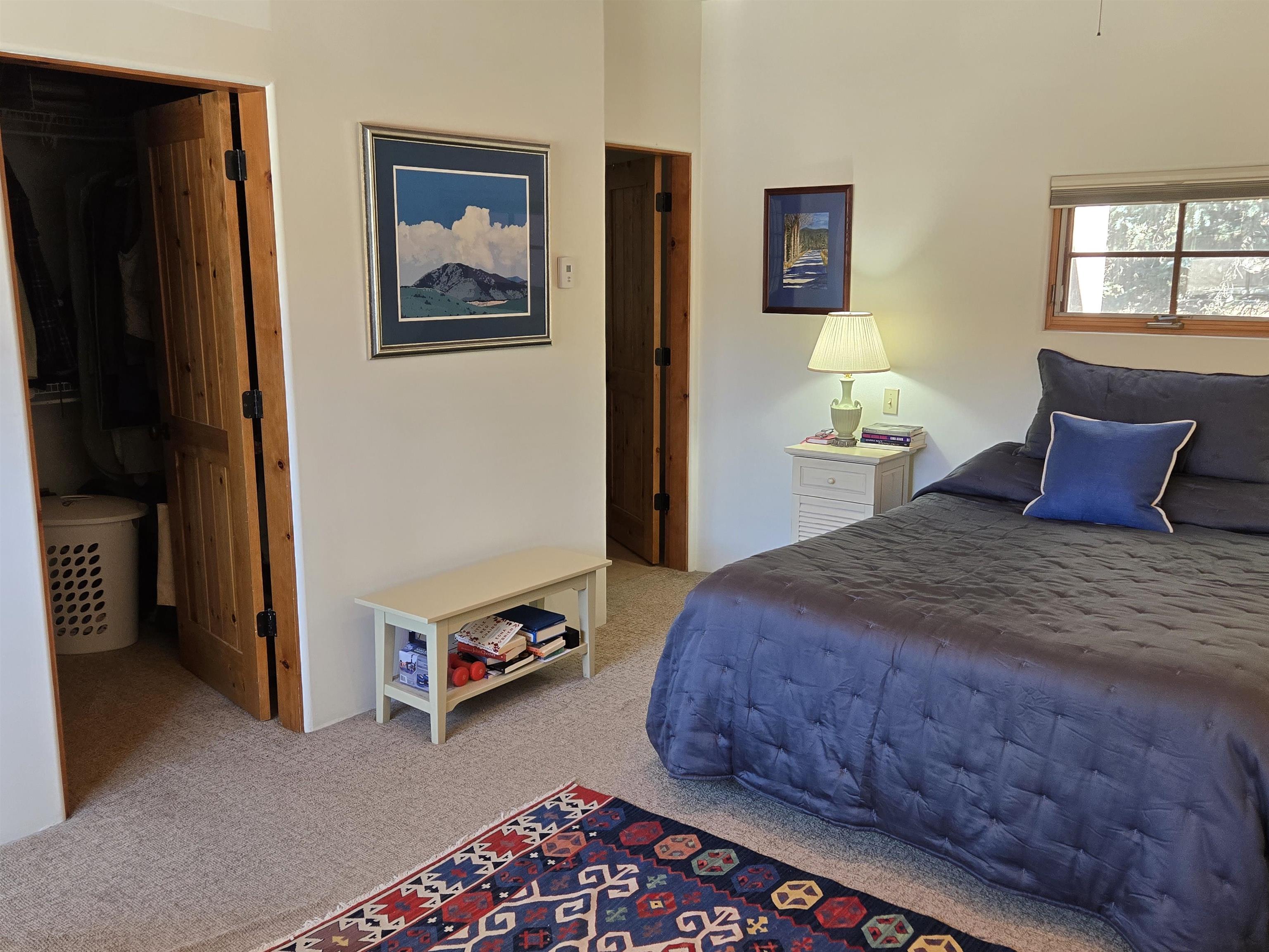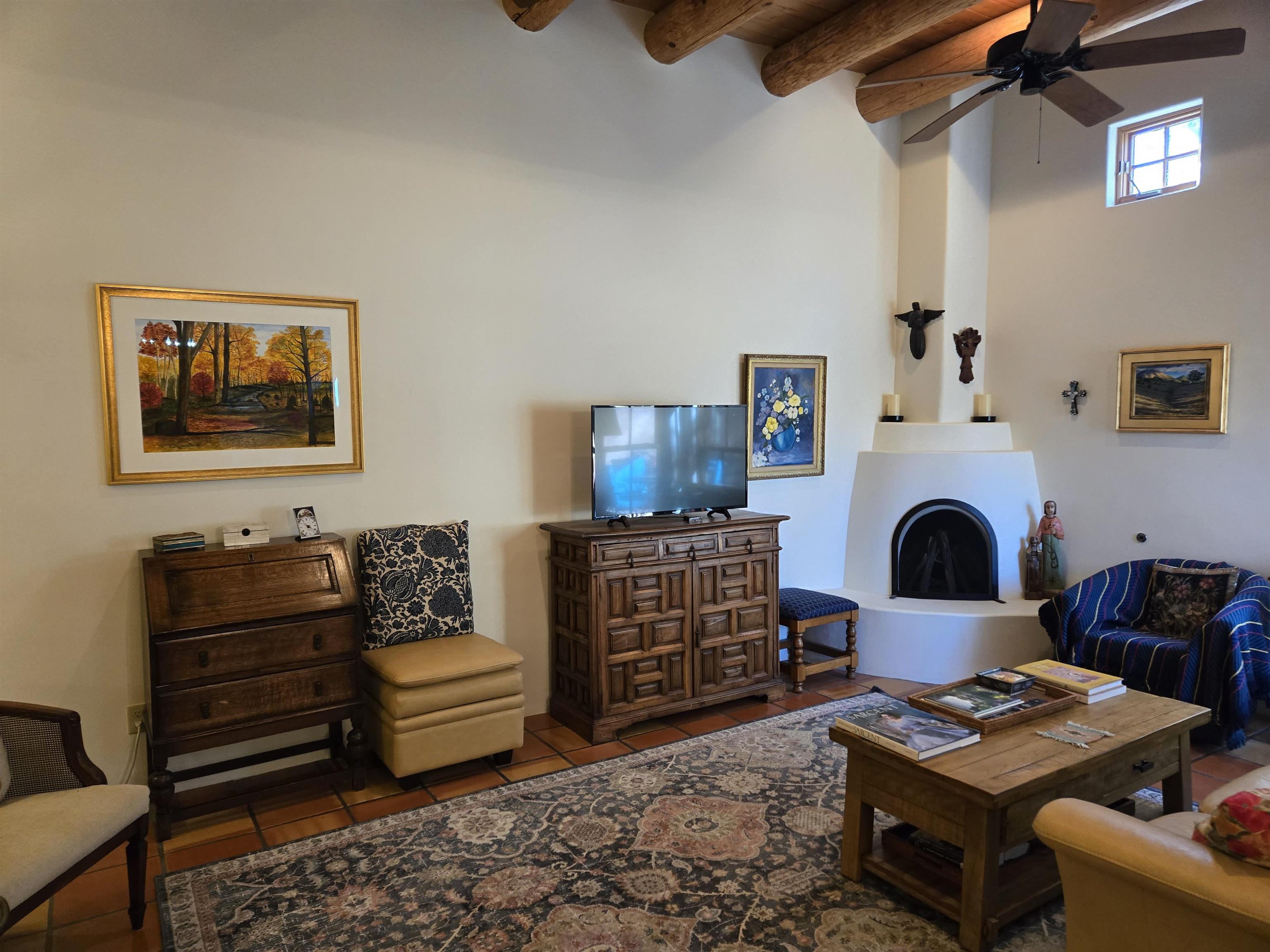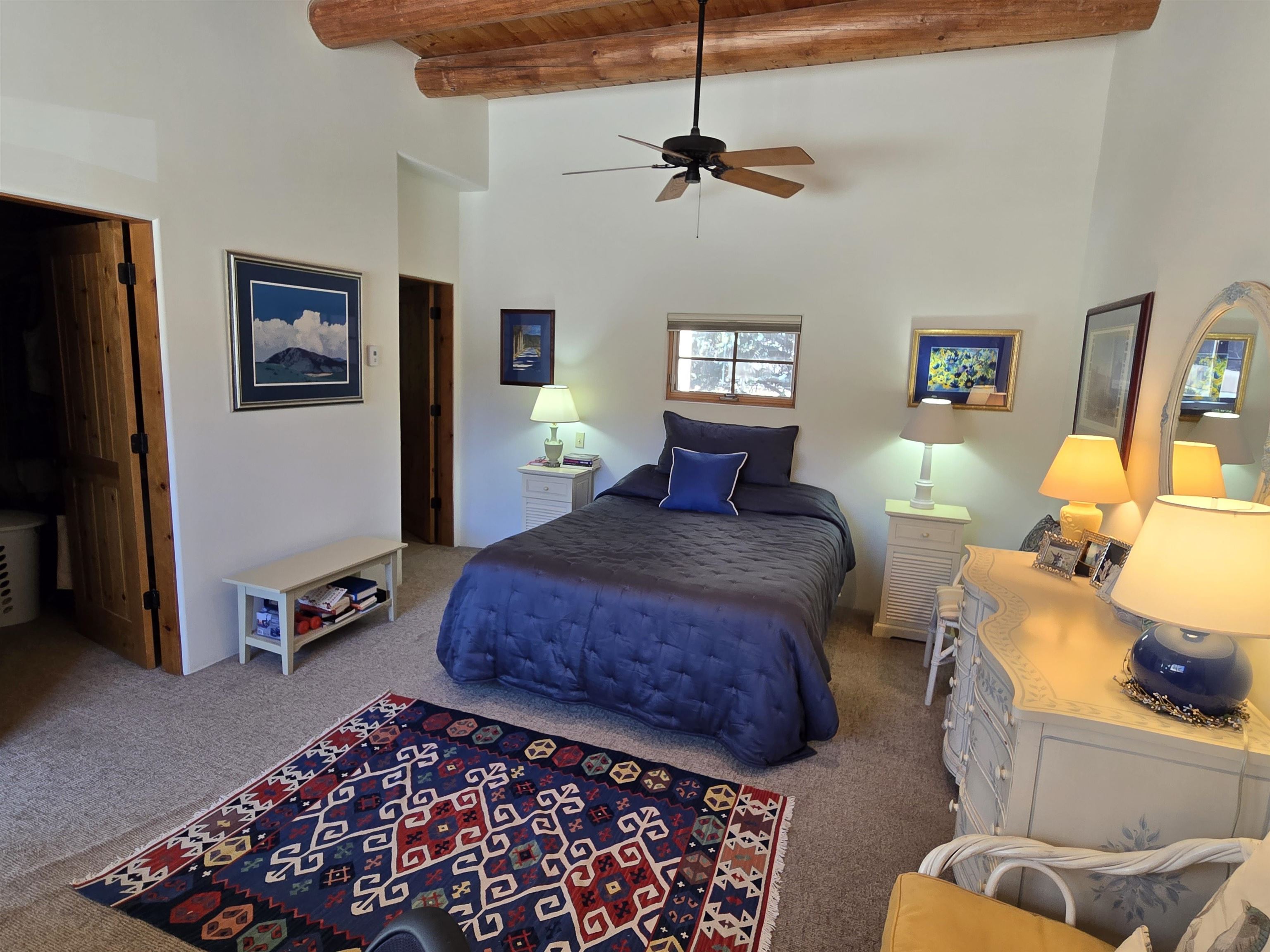 This Kit Carson Road two bedroom two and a half bath condominium location is the place you need to be, within walking distance of dining, shopping, music and galleries downtown in Taos. This quiet compound is home to just nineteen units on a shady street. The two-story condominium has a lovely open floorplan that expands out onto a private courtyard where your potted flowers will glow. Remodeled in 2022, this unit saw top quality upgrades of cabinetry, stainless appliances, new Saltillo tile flooring throughout the ground floor and an on demand water heater for endless showers! Granite countertops sparkle under the two-story skylight. The kitchen supplies ample storage in the rich wood cabinets and island. The owners love to entertain, and the space worked beautifully for many functions throughout the seasons. The large LIVING ROOM is so cozy with handsome vigas, the Pueblo-style gas fireplace and wood frame windows. The warmth of wood flows through the home with pretty raised panel wood doors. Ceiling fans circulate fresh air in handsome fashion. The quality Hunter blinds work seamlessly, opening from top or bottom to control the streaming sunlight or privacy. Large sliding patio doors open out to the private courtyard from the dining room. The main floor also features a BEDROOM / OFFICE with ensuite bath, large closet, a powder room with laundry closet and large under staircase storage area. Upstairs a LARGE PRIMARY BEDROOM is spacious enough to share an art studio area. It features a lovely bath with a large tub, linen cabinets and sunny glass block corner to spread the sky light around. The upper level has its own deck with space for seating overlooking a sunny southern exposure and fresh mountain air. These units do not stay on the market long, so call to request a showing today.