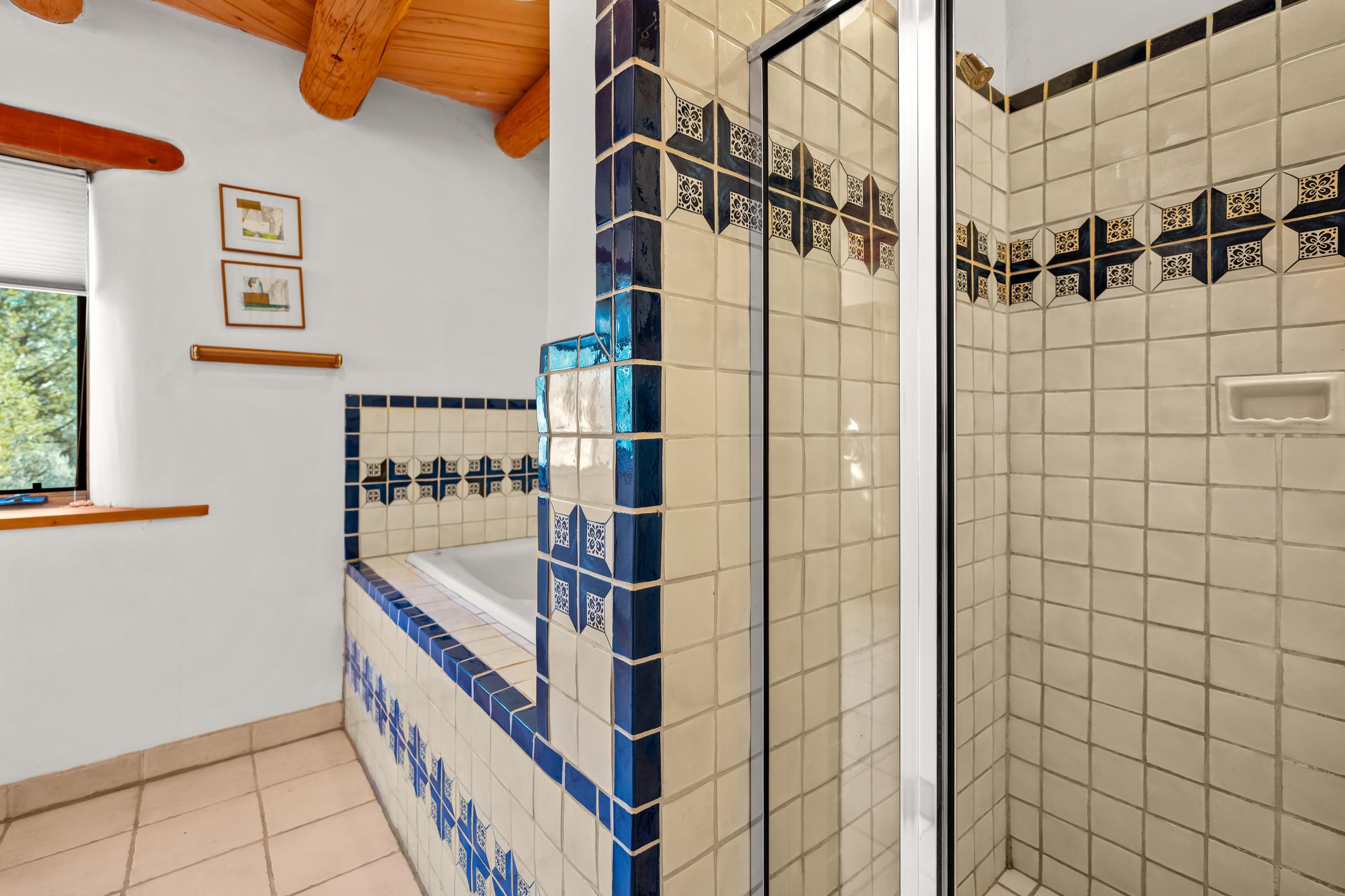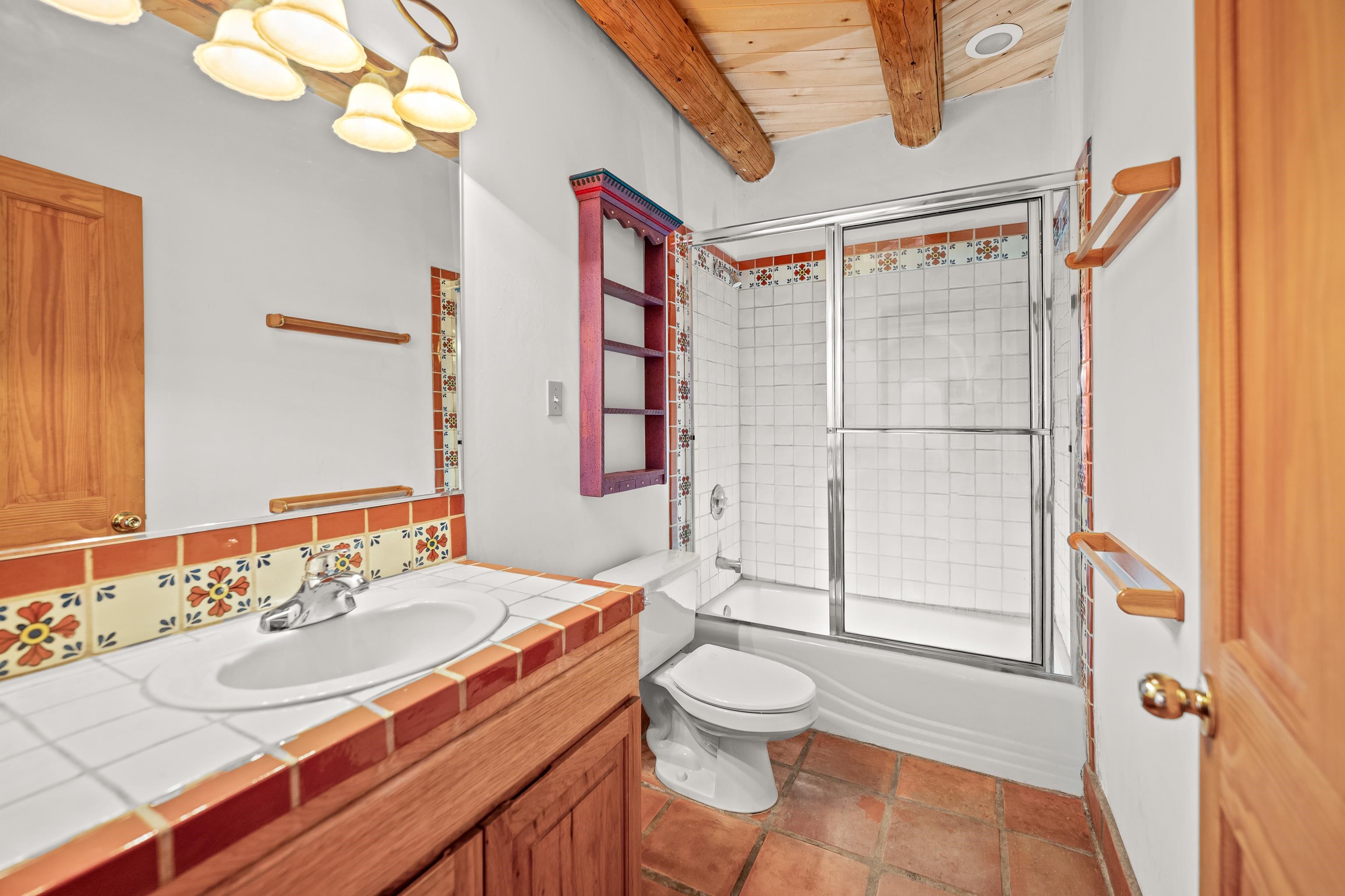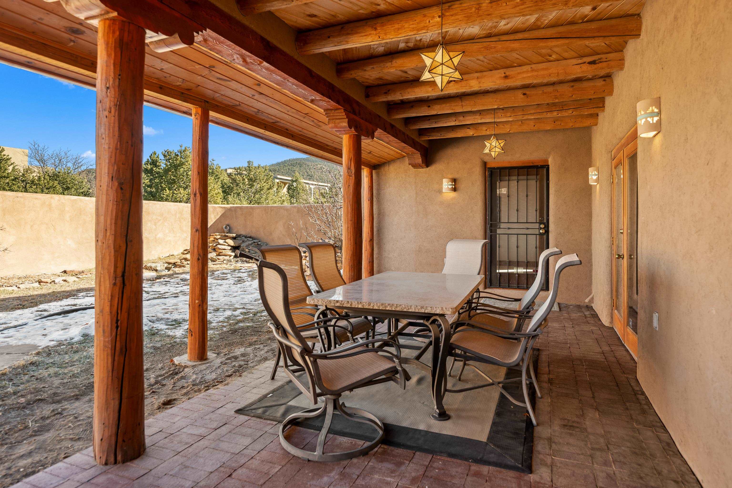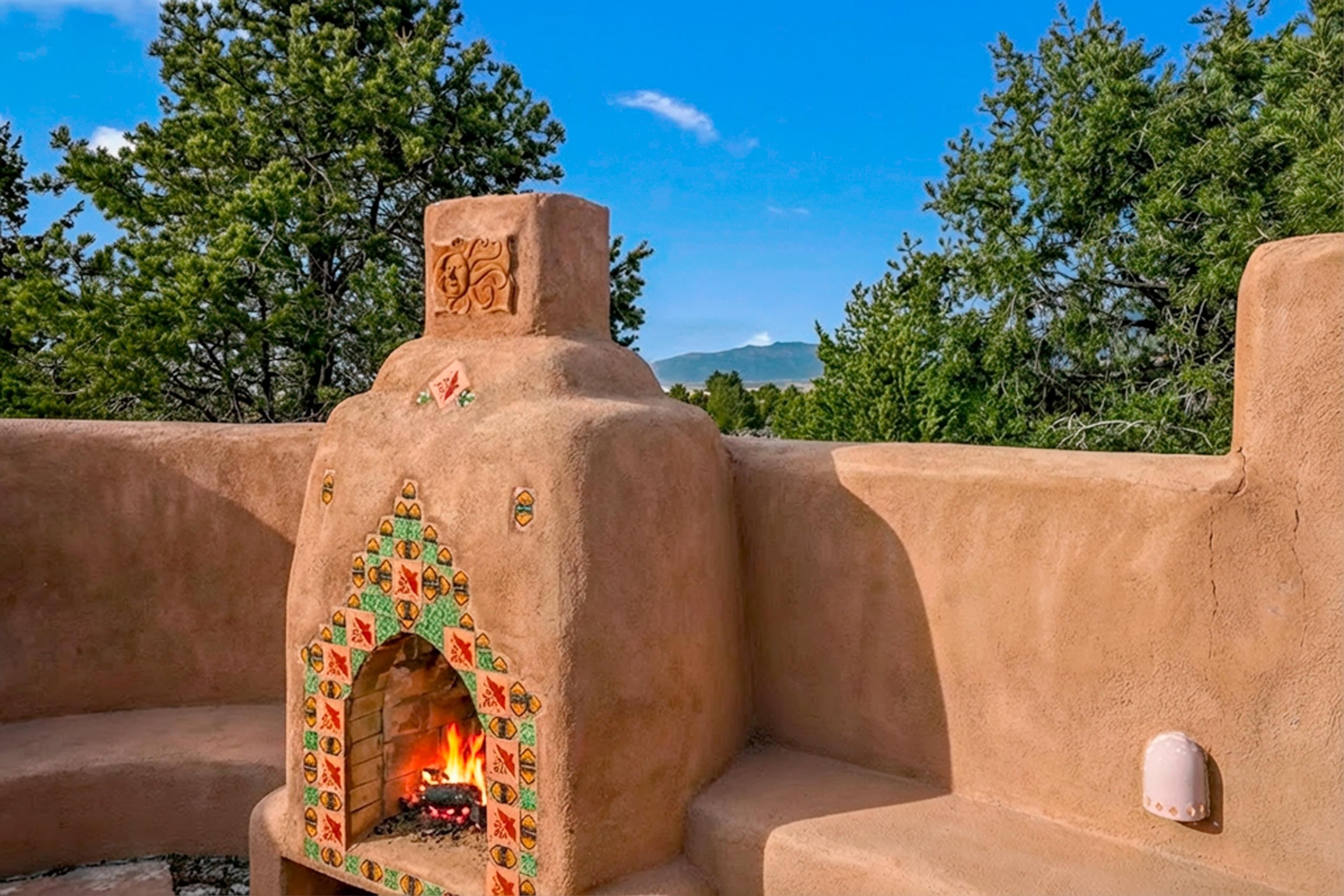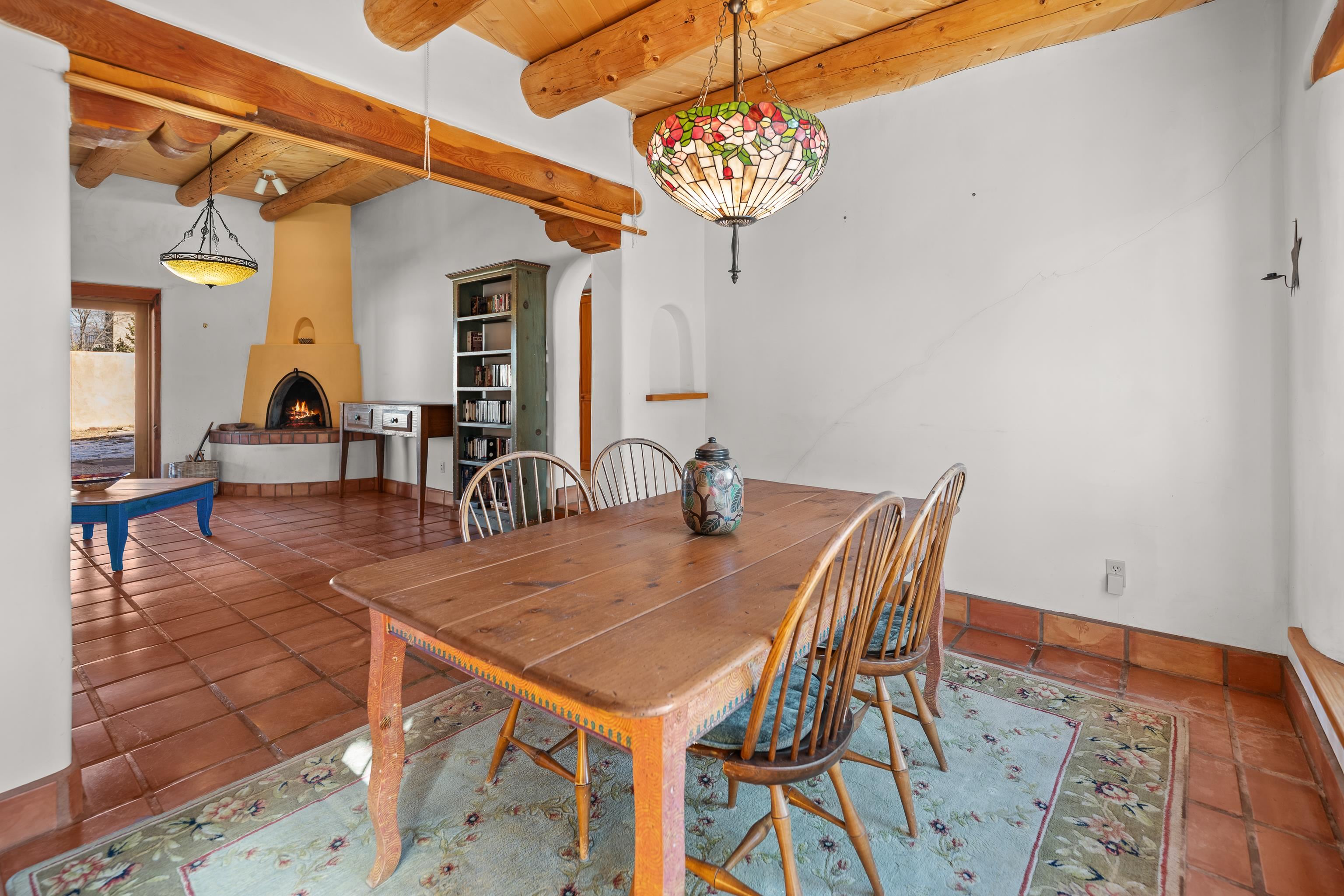 Southwest-style home offering classic New Mexico character with warm wood accents and flexible living spaces. Exposed vigas and wood-plank ceilings create architectural interest throughout, complemented by saltillo tile and carpeted areas for comfort. The open living and dining areas are anchored by a traditional kiva fireplace, providing a cozy focal point and seamless flow for everyday living or entertaining. The kitchen features custom wood cabinetry, tiled countertops, a center island with seating, and abundant natural light. Bedrooms are generously sized with wood-beamed ceilings and ample closet space. Bathrooms include colorful tile accents and well-laid-out vanities. A dedicated laundry/mechanical room adds functionality. Additional highlights include an attached garage/workshop space with storage potential, multiple exterior access points, and a classic adobe-style exterior set against a scenic Northern New Mexico backdrop. This property offers a solid foundation for a primary residence, second home, or creative retreat.