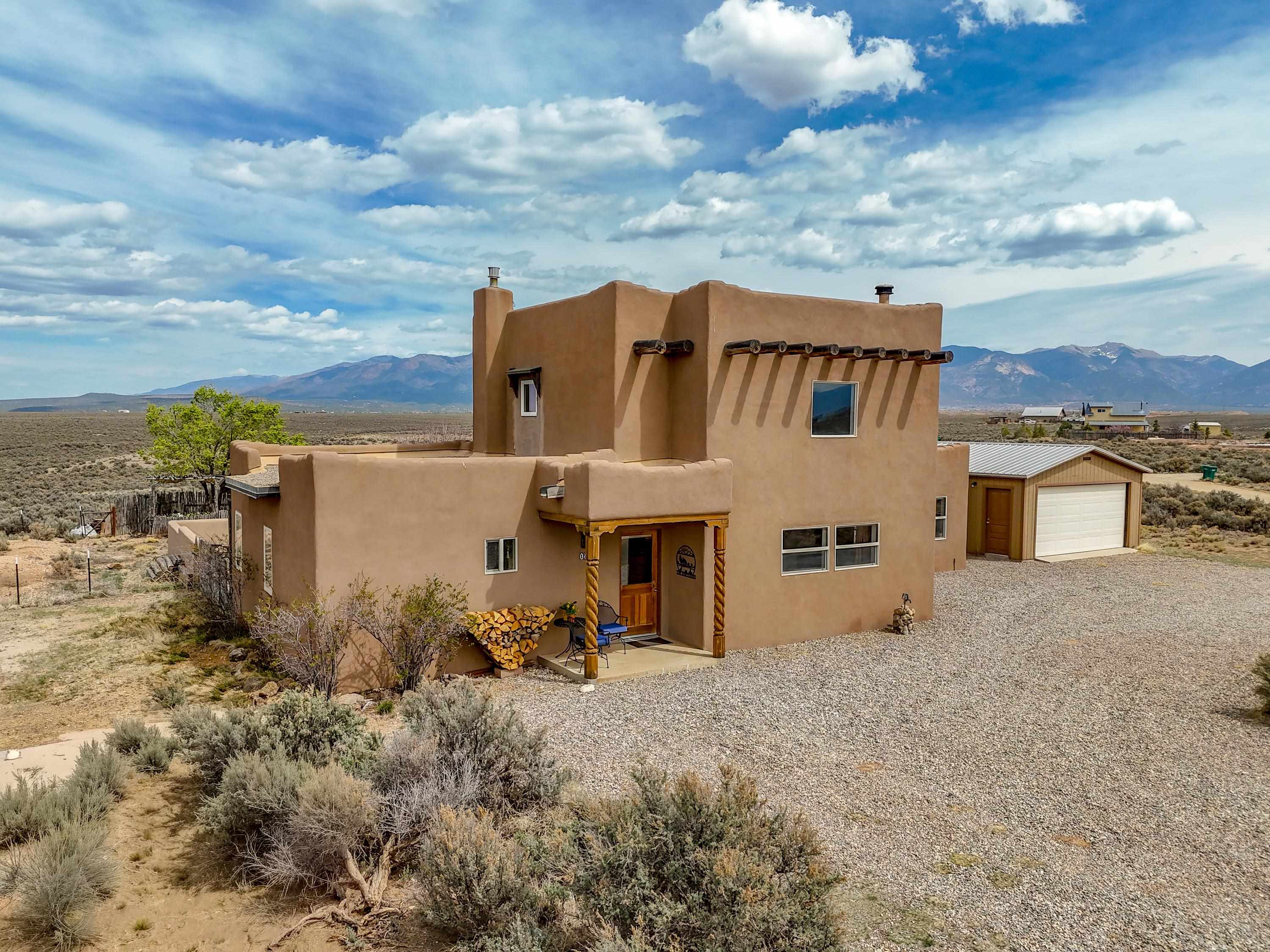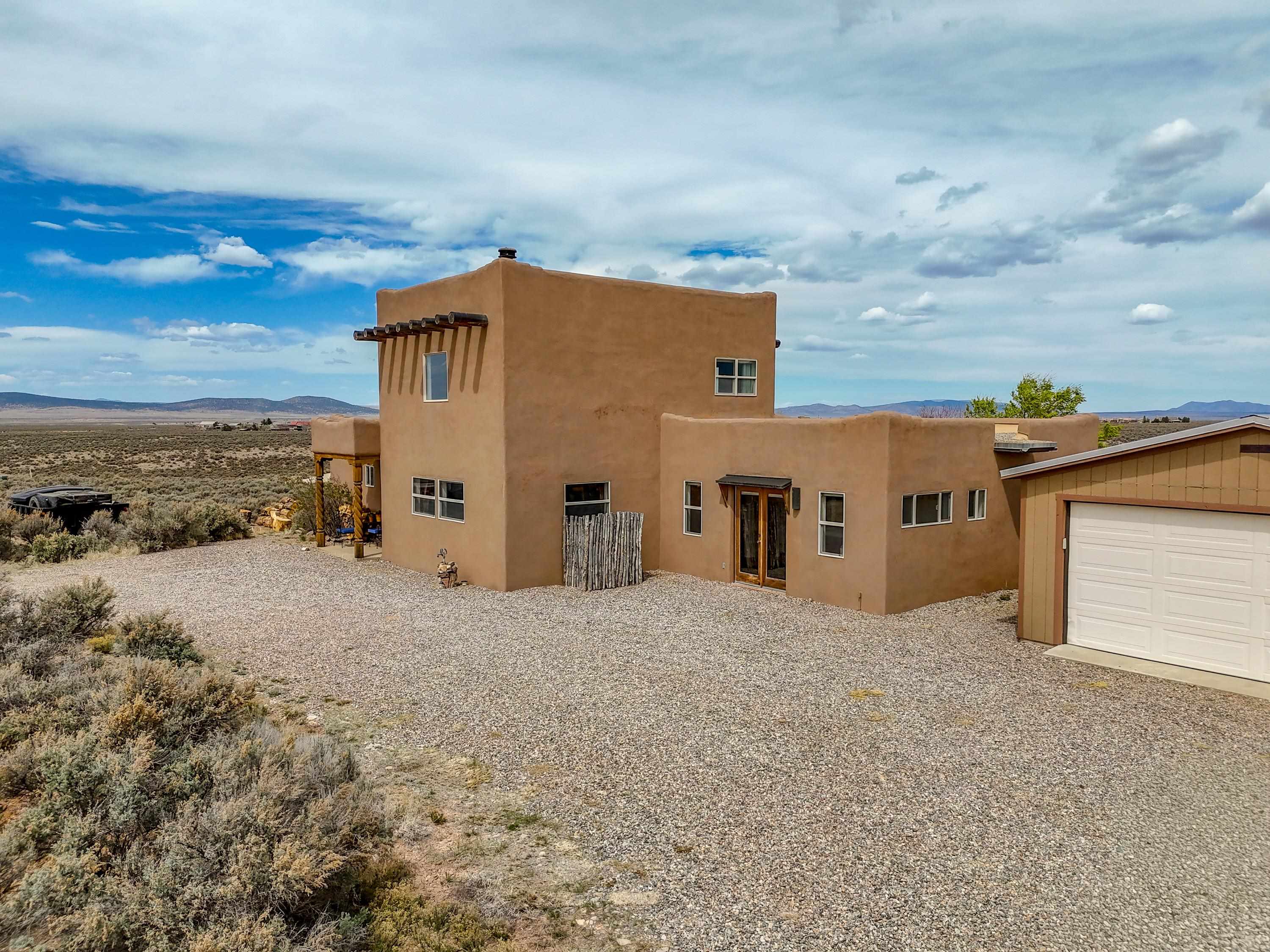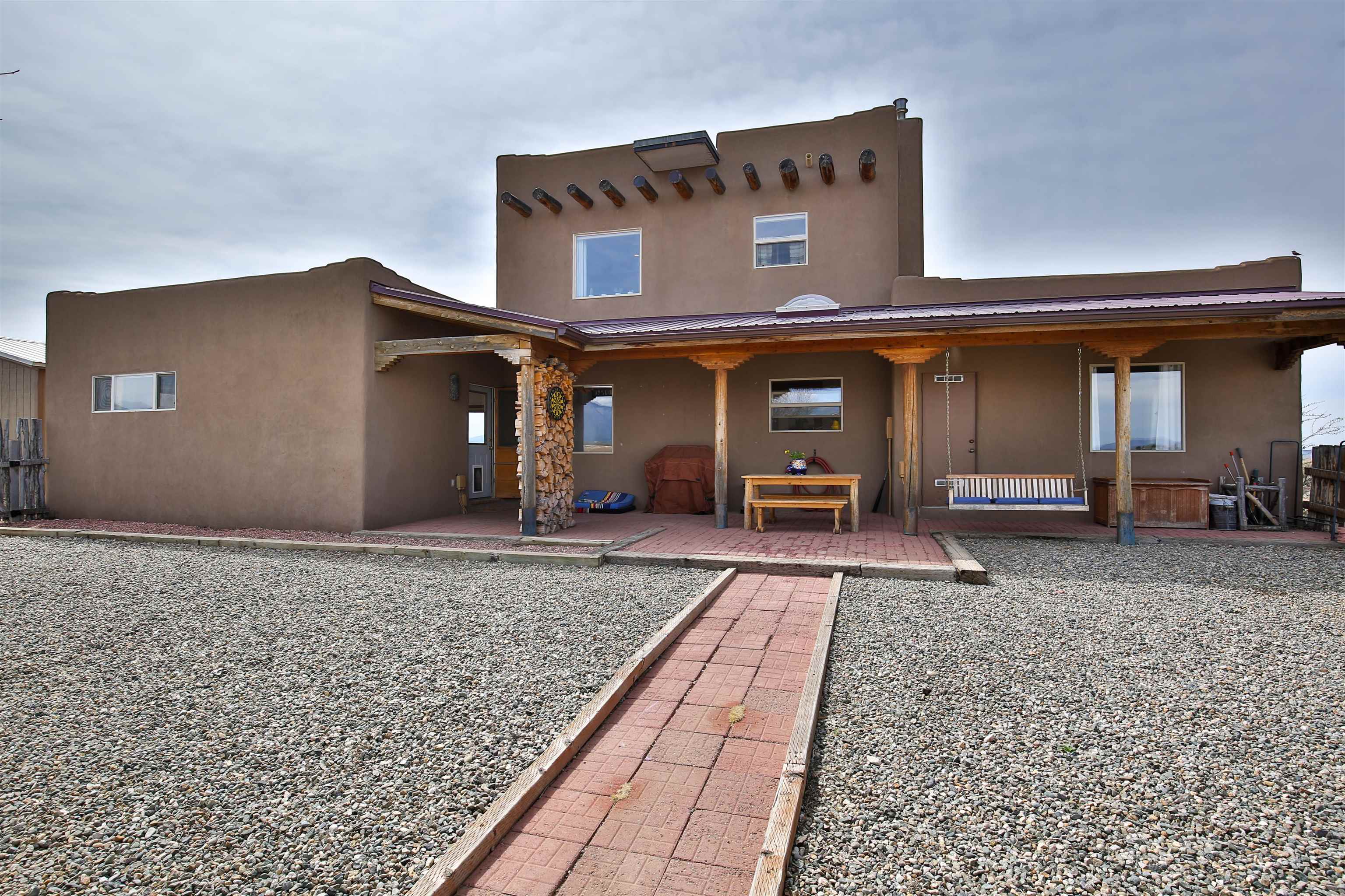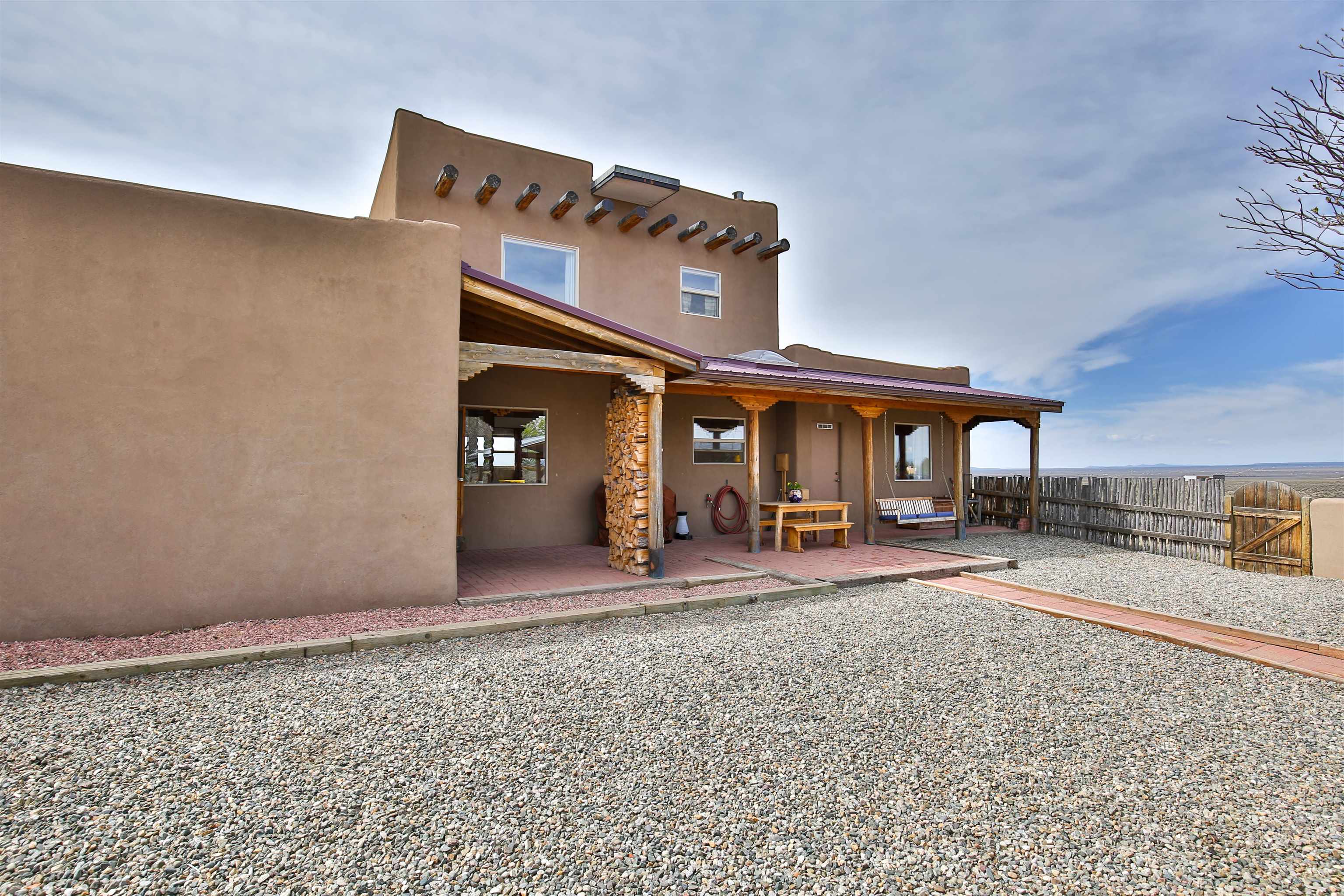 If you are looking for views, this home delivers in every direction. Seriously, every window has something to show off. This 3 bedroom, 2 and a half bath home offers space, light, and a layout that keeps things interesting. One of the bedrooms is a loft with its own ensuite bath, perfect for guests, creative space, or your own little retreat above it all. Horse lovers, this one is for you. Riding is encouraged, with designated easements along the roads and wider corridors along the east and west boundaries, so you can saddle up and head out right from home. Inside, radiant floor heat keeps things cozy, while a high efficiency wood stove adds that perfect mountain home touch. Copper countertops bring warmth and character to the kitchen, and there is room to spread out, entertain, and actually enjoy your space. The separate dining room is filled with natural light and feels made for long dinners and good company. Step outside and it only gets better. A large portal faces directly toward Taos Mountain, giving you a front row seat to one of the best views in the area. It is the perfect setting for outdoor entertaining, complete with an exterior bar and barbecue area. There is also a separate area for animals, making this property as practical as it is beautiful. If you love the outdoors, you are in the right place. Hiking, biking, and exploring are all close by, with the Rio Grande del Norte National Monument just minutes away, helping preserve the views and the wide open feel for years to come. Space, views, and a lifestyle that feels a little bigger out here. Come see it for yourself. For more views: https://youtu.be/mpZ2B_1aX8M
