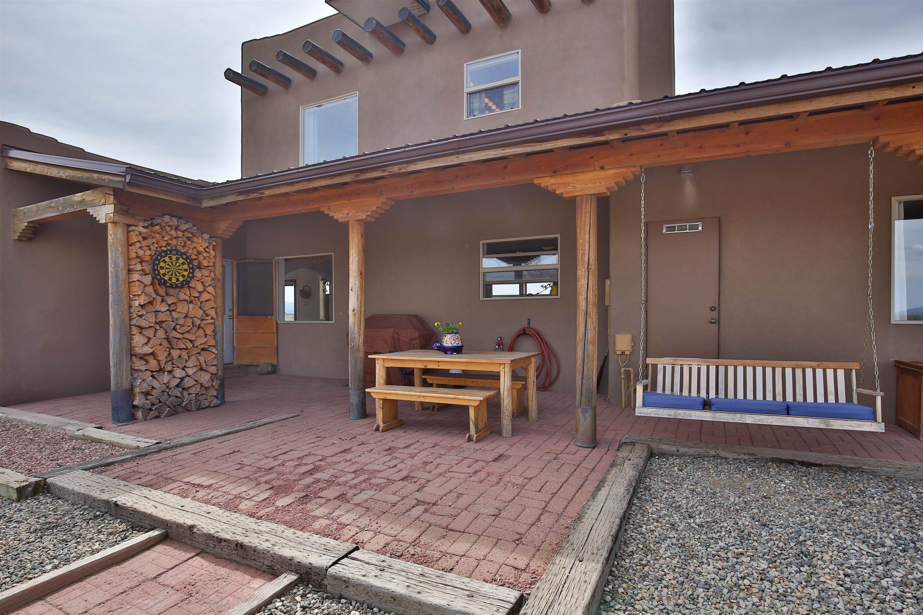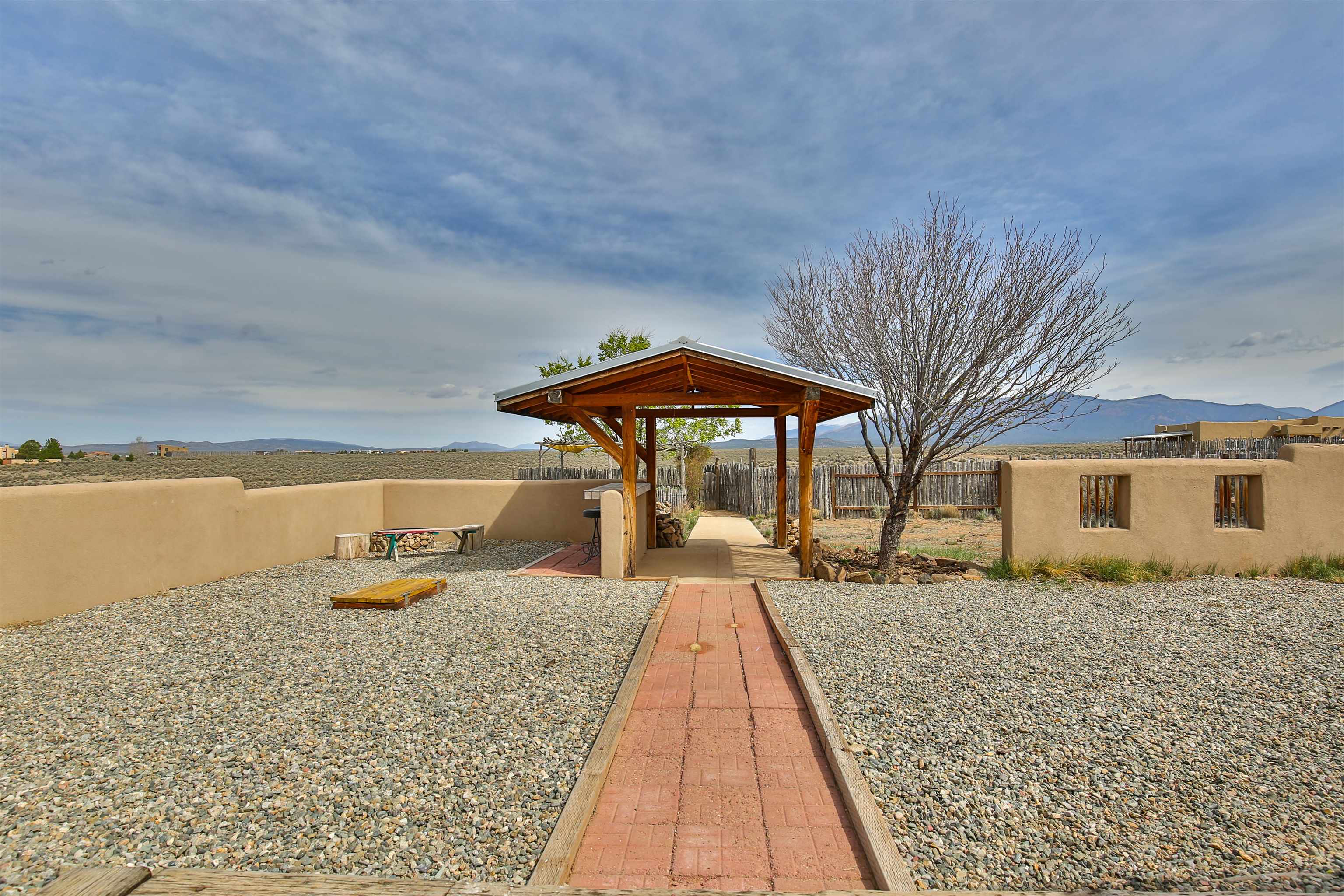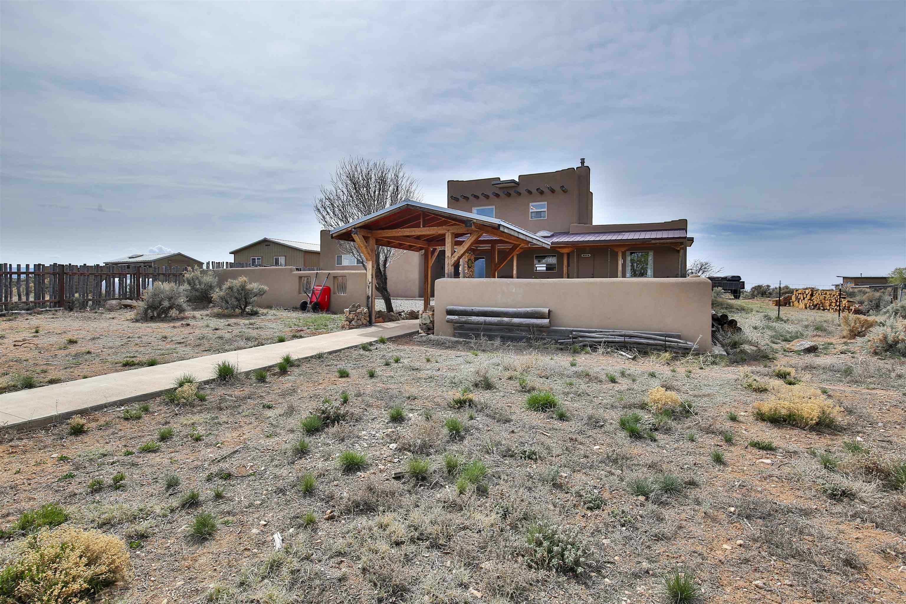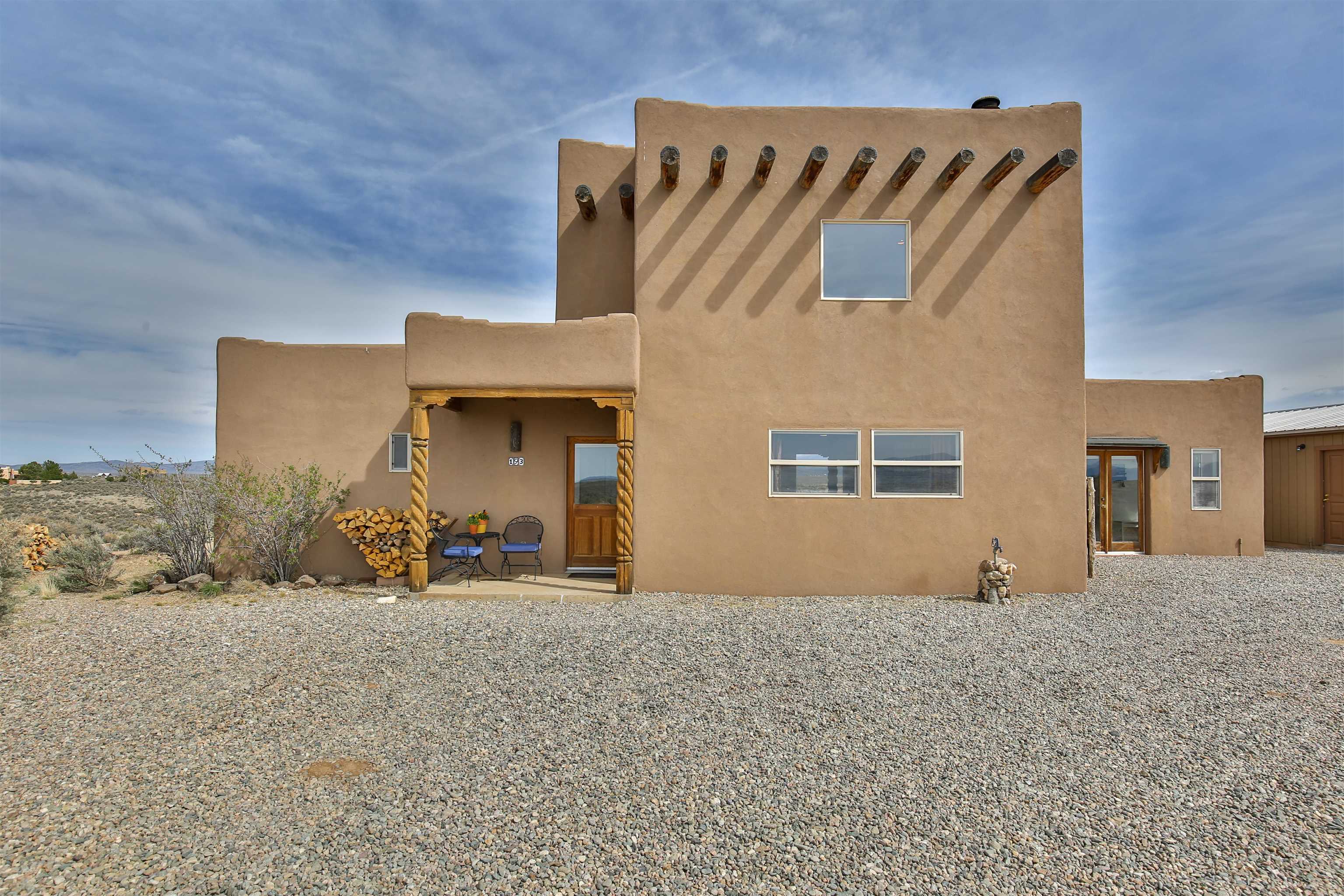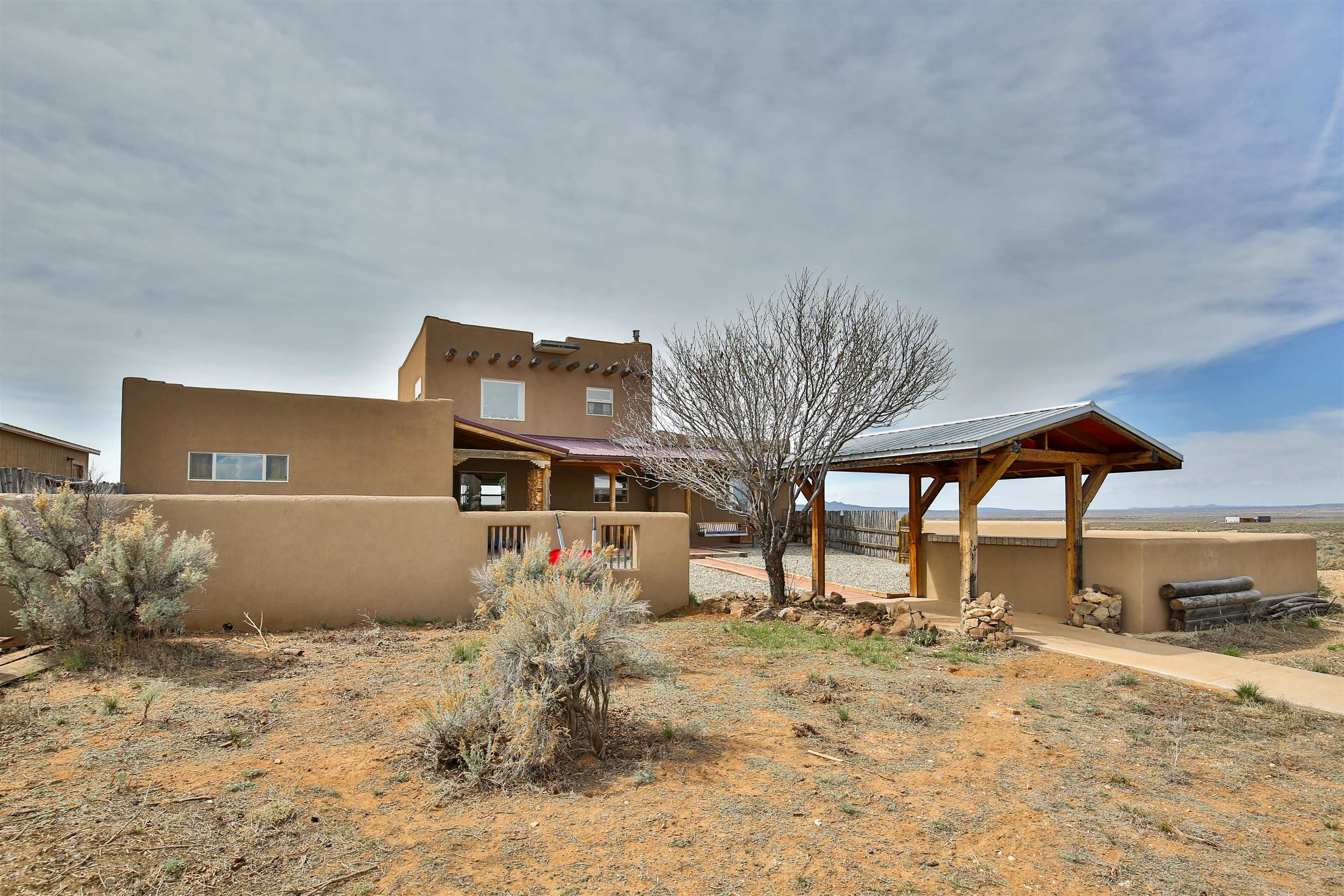 If you are looking for views, this home delivers in every direction. Seriously, every window has something to show off. This 3 bedroom, 2 and a half bath home offers space, light, and a layout that keeps things interesting. One of the bedrooms is a loft with its own ensuite bath, perfect for guests, creative space, or your own little retreat above it all. Horse lovers, this one is for you. Riding is encouraged, with designated easements along the roads and wider corridors along the east and west boundaries, so you can saddle up and head out right from home. Inside, radiant floor heat keeps things cozy, while a high efficiency wood stove adds that perfect mountain home touch. Copper countertops bring warmth and character to the kitchen, and there is room to spread out, entertain, and actually enjoy your space. The separate dining room is filled with natural light and feels made for long dinners and good company. Step outside and it only gets better. A large portal faces directly toward Taos Mountain, giving you a front row seat to one of the best views in the area. It is the perfect setting for outdoor entertaining, complete with an exterior bar and barbecue area. There is also a separate area for animals, making this property as practical as it is beautiful. If you love the outdoors, you are in the right place. Hiking, biking, and exploring are all close by, with the Rio Grande del Norte National Monument just minutes away, helping preserve the views and the wide open feel for years to come. Space, views, and a lifestyle that feels a little bigger out here. Come see it for yourself. For more views: https://youtu.be/mpZ2B_1aX8M