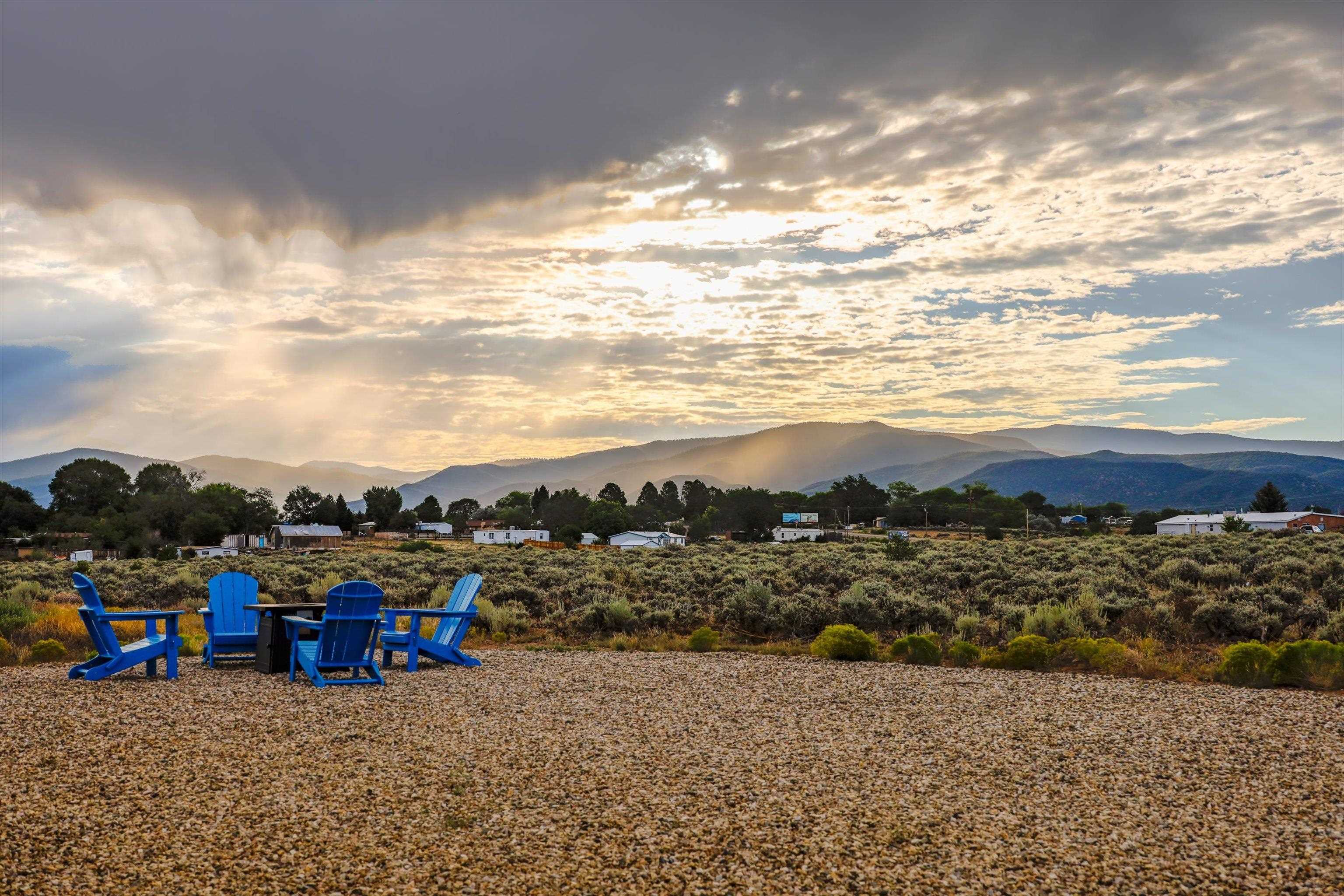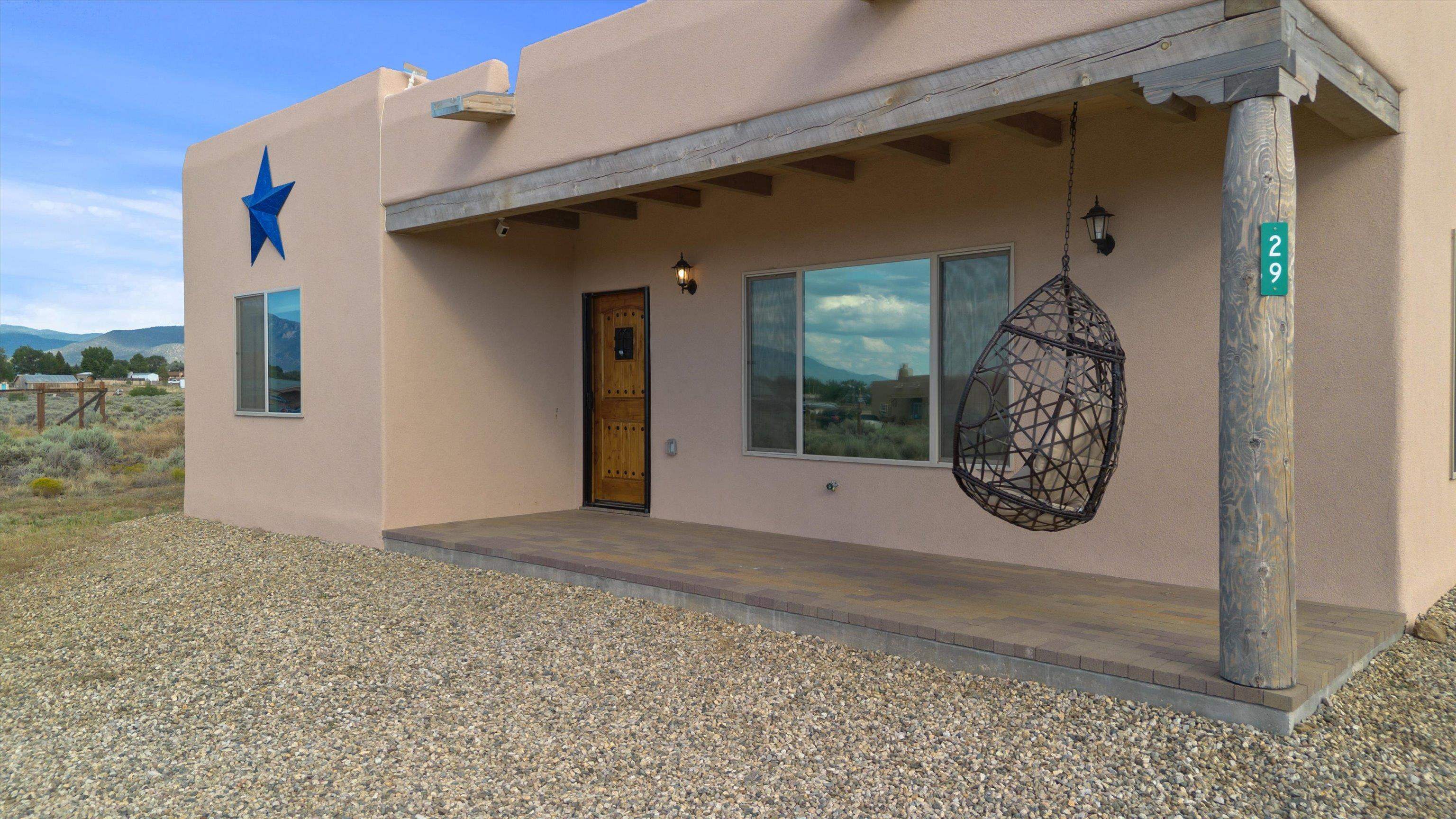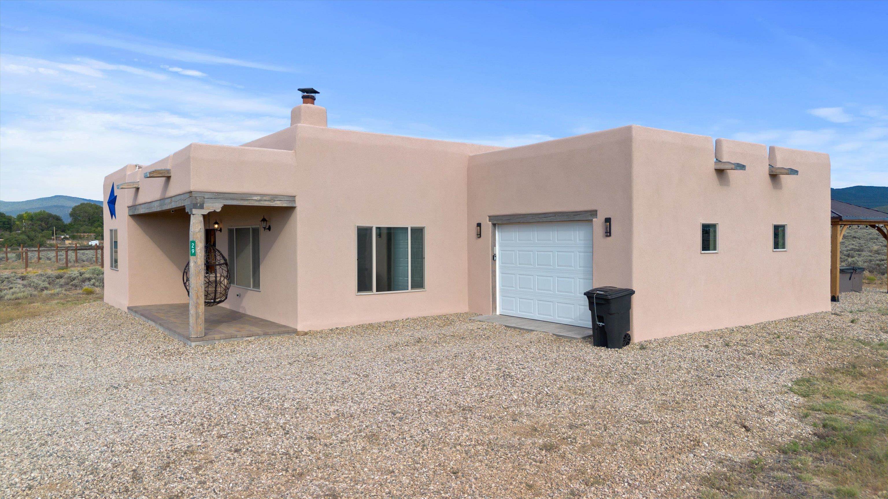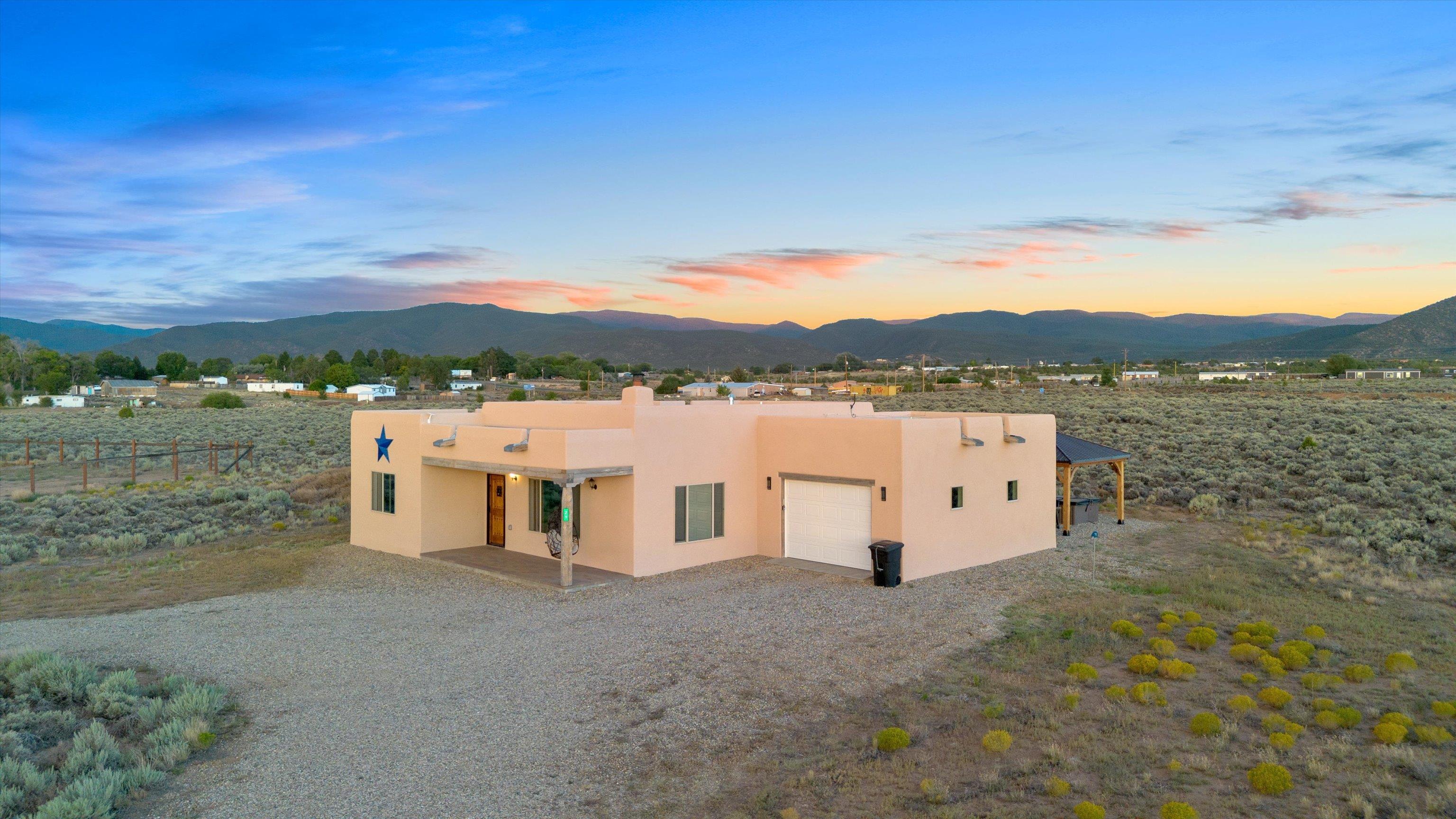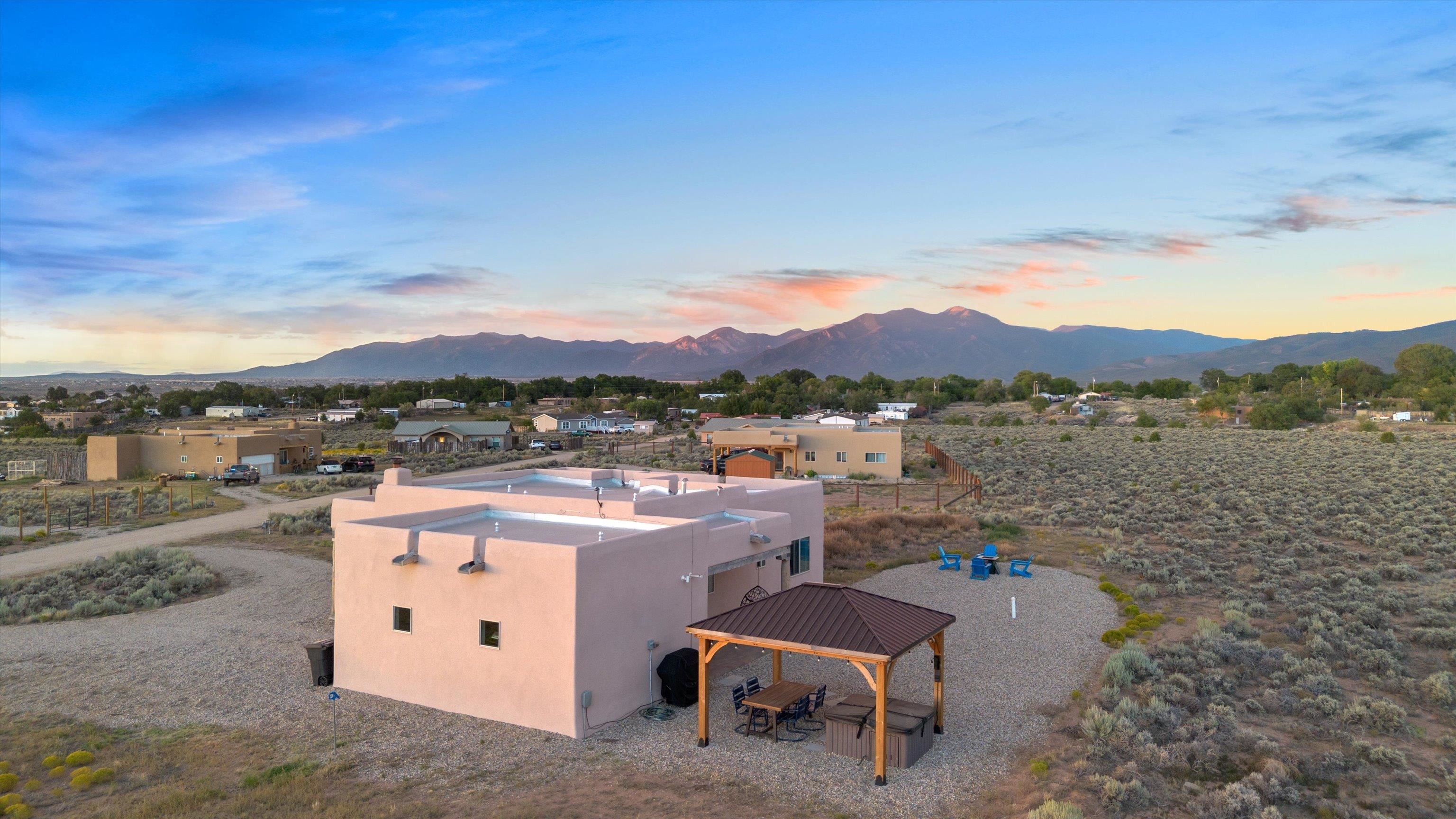 This 2-bedroom, 2-bath home offers a compelling combination of personal use, investment potential, and Taos lifestyle and can be optionally fully furnished. Built in 2023 and located in the Ranchos de Taos valley, the property has a proven track record as a successful short-term rental, with documented gross income and net operating income available. Wide-open views of the Sangre de Cristo Mountains define the experience here, with vibrant sunrises and dramatic evening sunsets visible from the property. The setting provides a sense of space and privacy while remaining just minutes from town. Inside, the home features a practical and comfortable floor plan with radiant in-floor heating, quality finishes, and thoughtful design that supports both everyday living and guest use. An oversized one-car garage adds valuable storage and convenience. Outdoor living is a highlight, with a hot tub, gazebo, and dedicated dining area that create an ideal setting for relaxing or entertaining. The combination of open skies and mountain views makes this a place people want to return to. Conveniently located near the Taos Country Club and approximately 10 minutes from Taos Plaza, the property also offers easy access to hiking, biking, and the Rio Grande in Pilar for year-round recreation. Well maintained and move-in ready, this property delivers both a comfortable home base and a proven income-producing opportunity in one of Taos’ most desirable settings