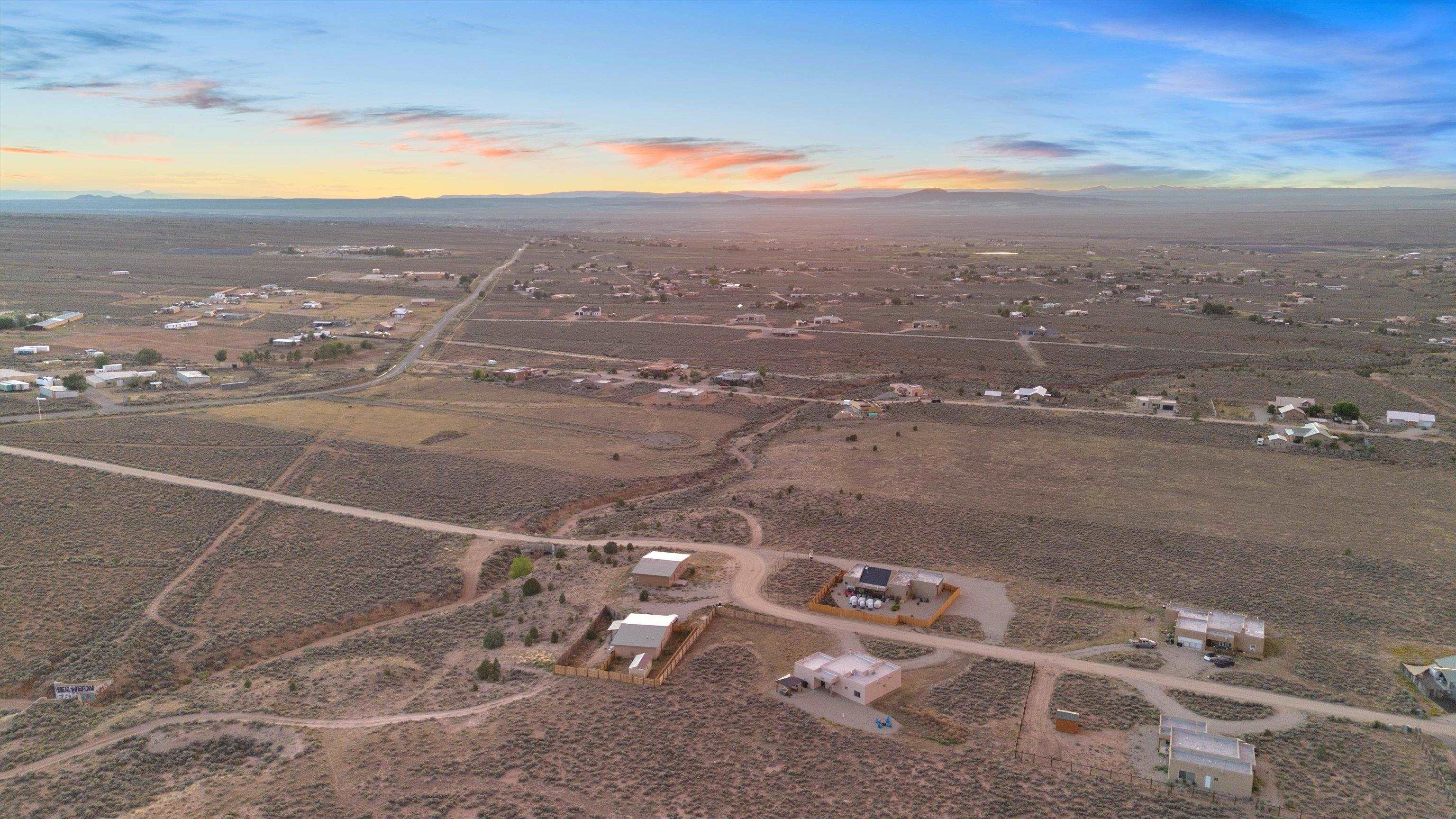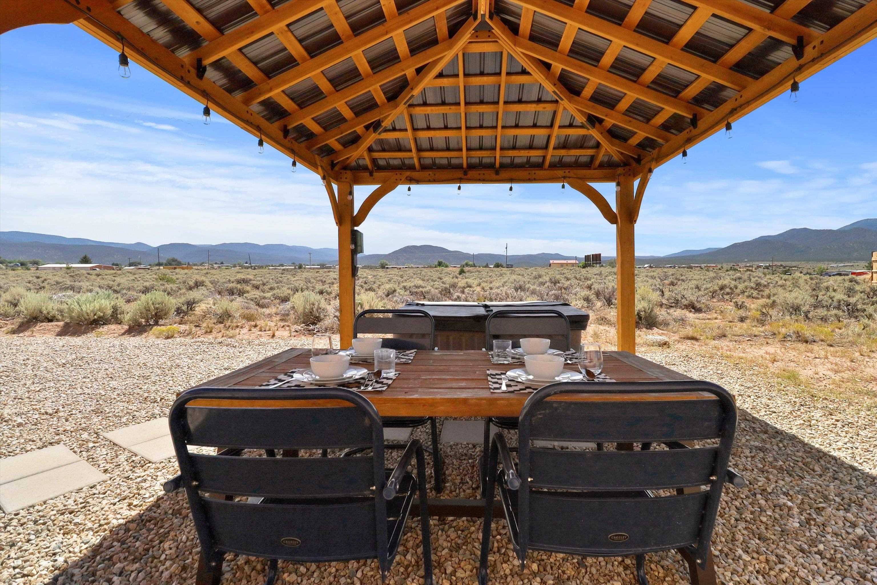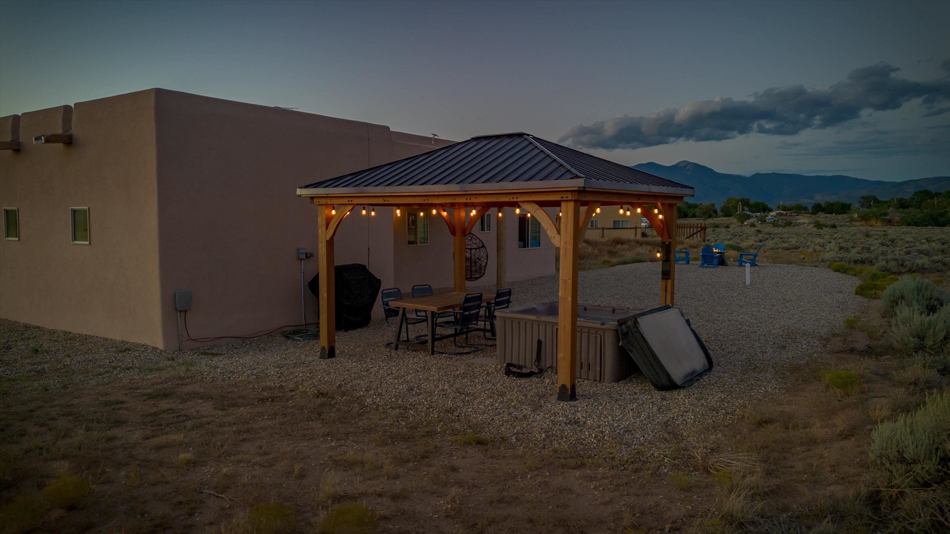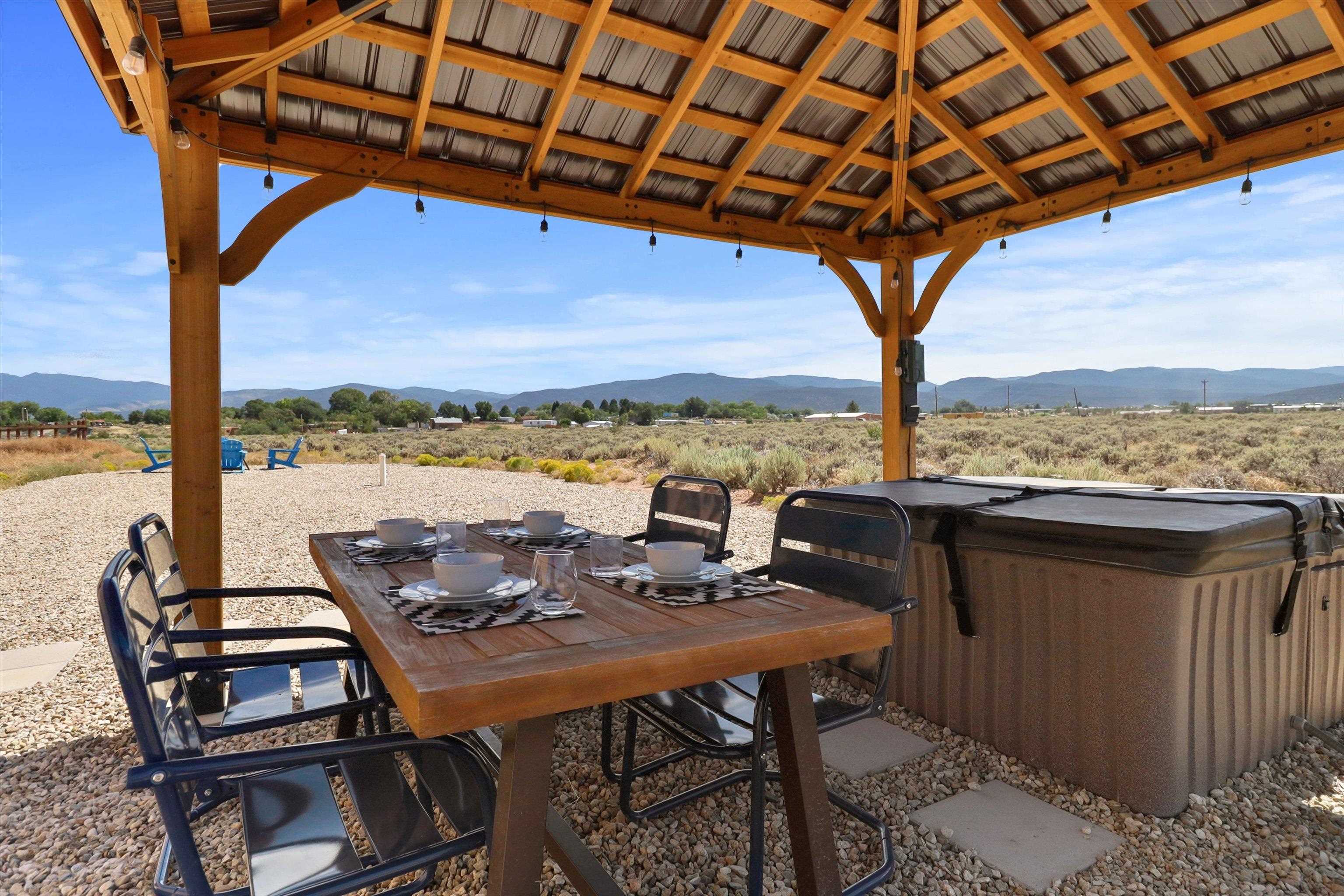 This 2-bedroom, 2-bath home offers a compelling combination of personal use, investment potential, and Taos lifestyle and can be optionally fully furnished. Built in 2023 and located in the Ranchos de Taos valley, the property has a proven track record as a successful short-term rental, with documented gross income and net operating income available. Wide-open views of the Sangre de Cristo Mountains define the experience here, with vibrant sunrises and dramatic evening sunsets visible from the property. The setting provides a sense of space and privacy while remaining just minutes from town. Inside, the home features a practical and comfortable floor plan with radiant in-floor heating, quality finishes, and thoughtful design that supports both everyday living and guest use. An oversized one-car garage adds valuable storage and convenience. Outdoor living is a highlight, with a hot tub, gazebo, and dedicated dining area that create an ideal setting for relaxing or entertaining. The combination of open skies and mountain views makes this a place people want to return to. Conveniently located near the Taos Country Club and approximately 10 minutes from Taos Plaza, the property also offers easy access to hiking, biking, and the Rio Grande in Pilar for year-round recreation. Well maintained and move-in ready, this property delivers both a comfortable home base and a proven income-producing opportunity in one of Taos’ most desirable settings