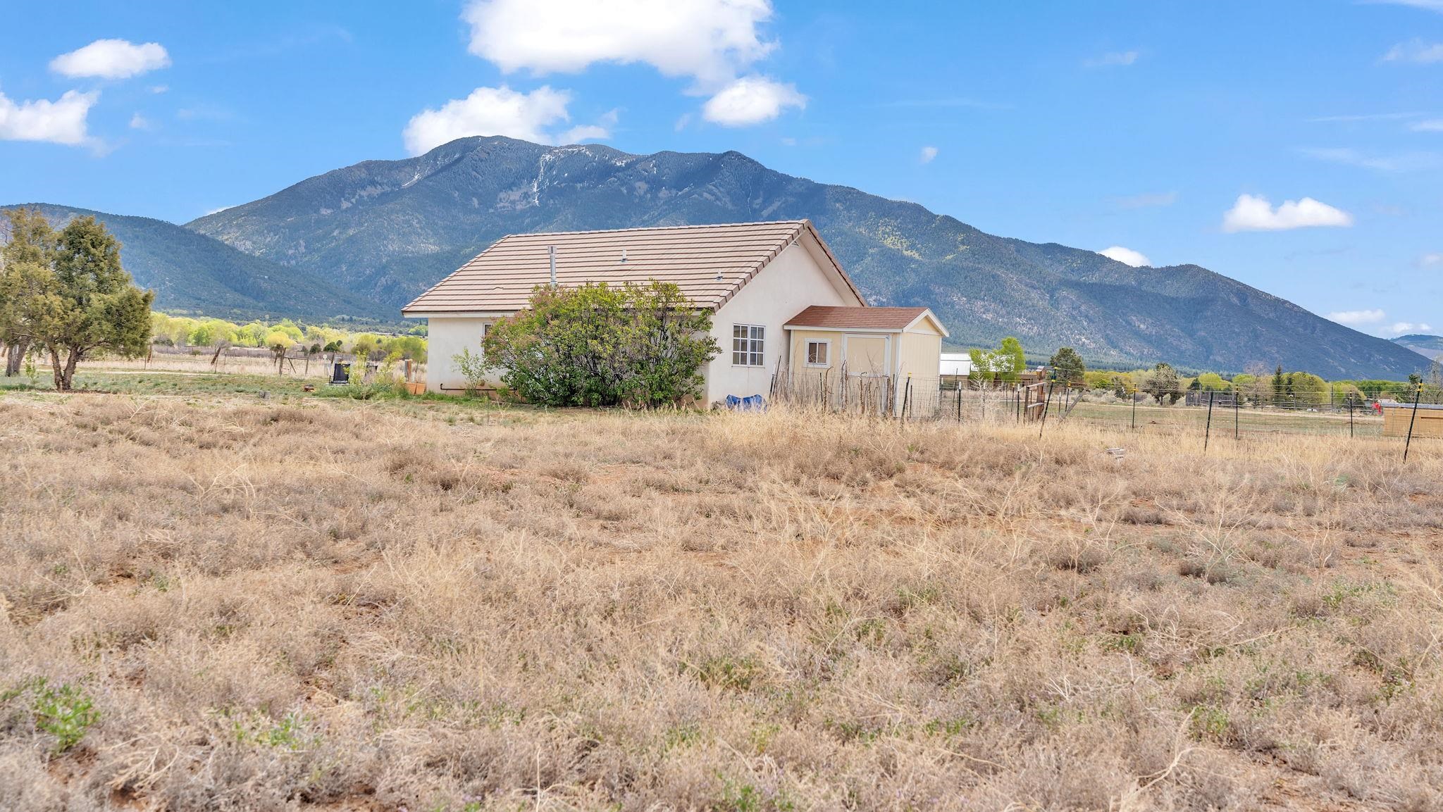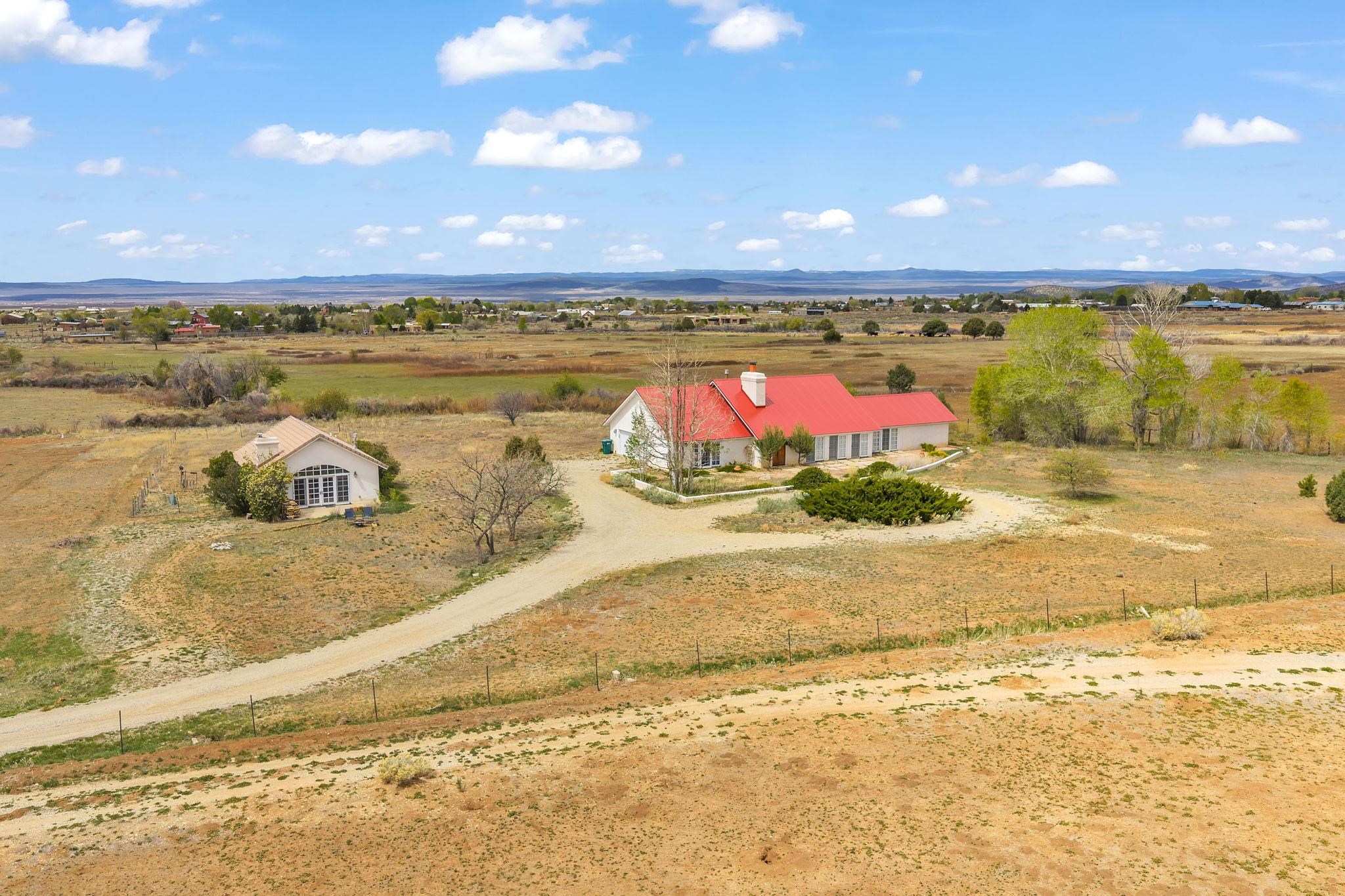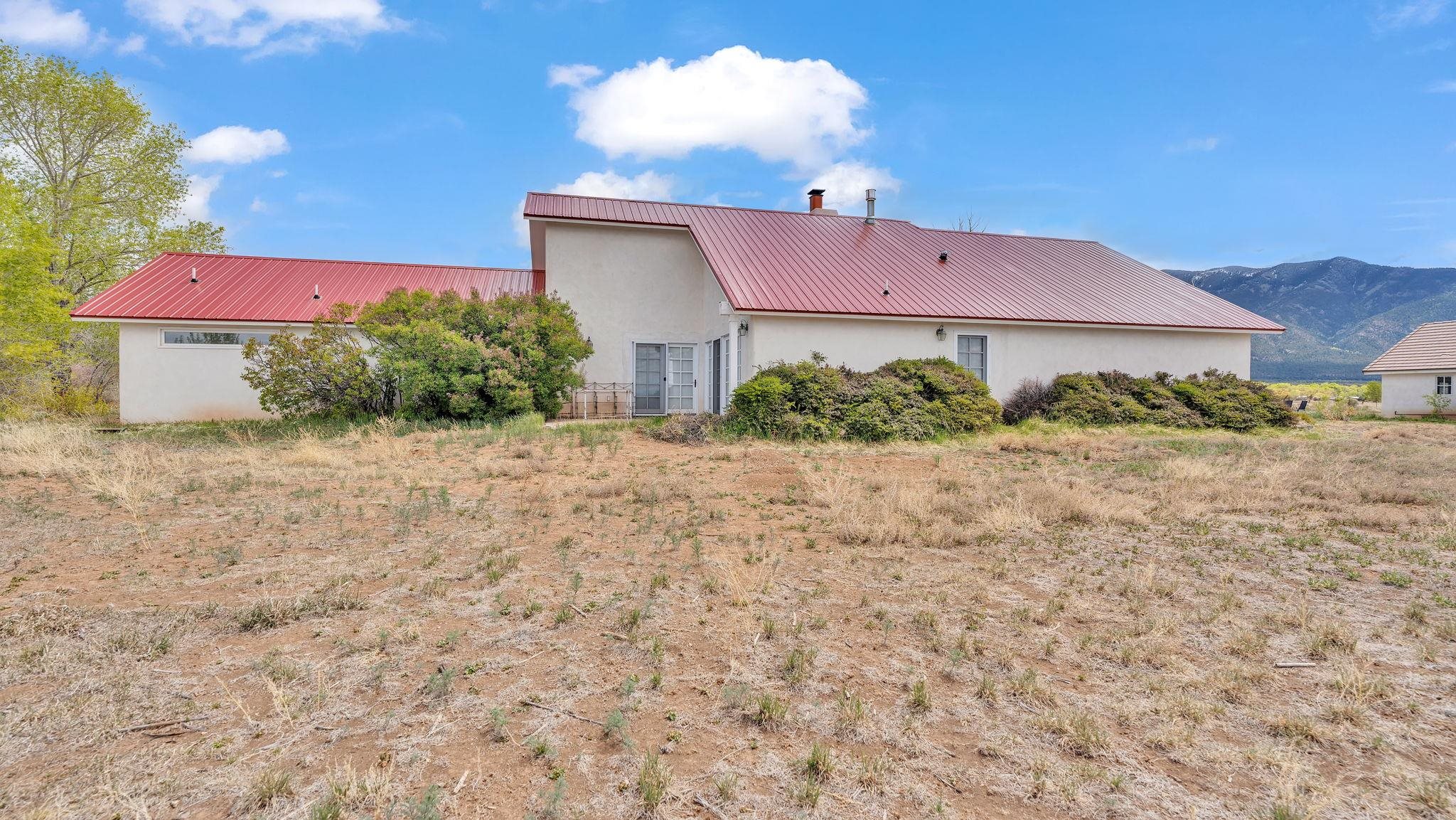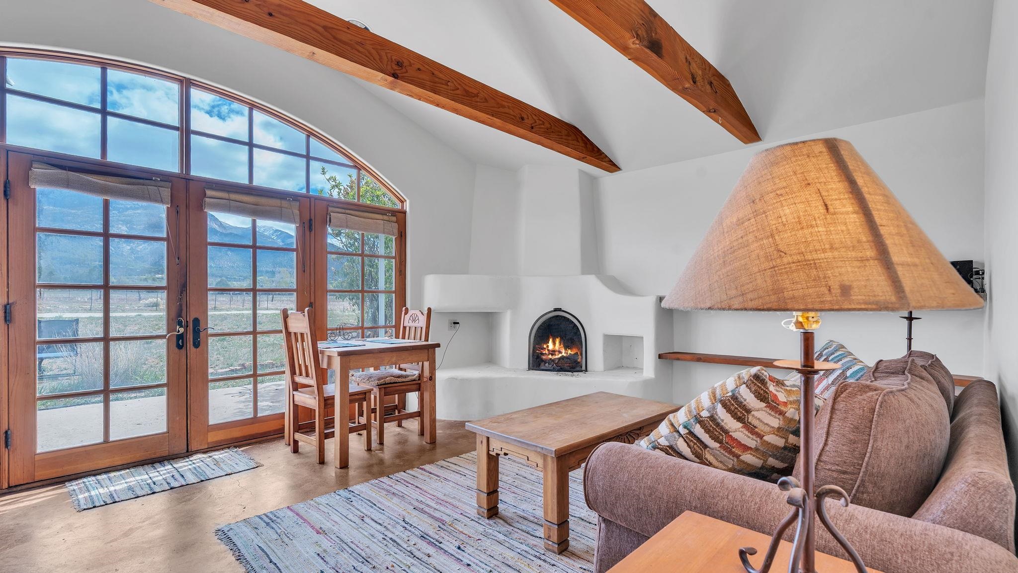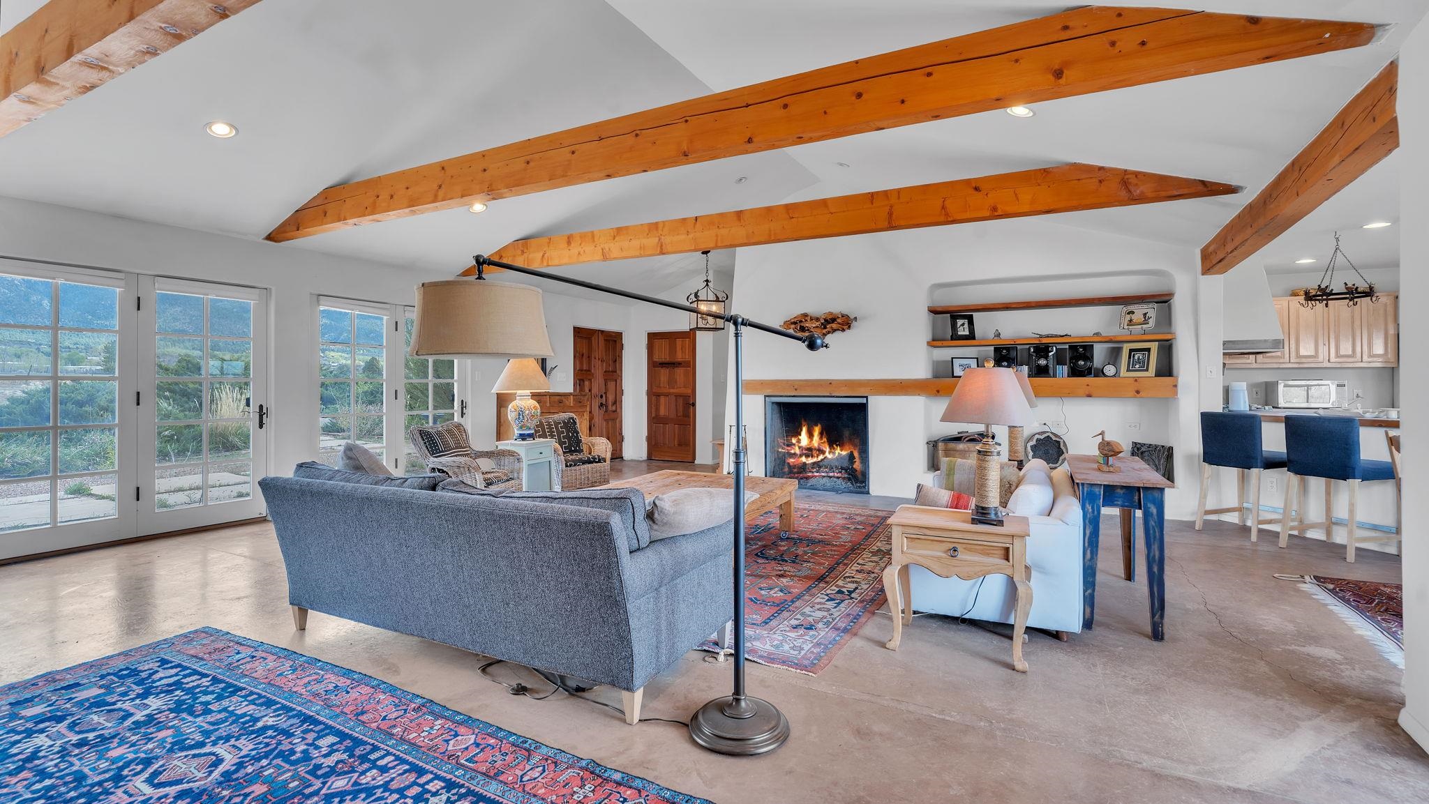 Nestled in the heart of Arroyo Seco, this expansive estate featuring a beautifully designed two-bedroom main residence and a charming two-bedroom casita offers a refined blend of modern elegance and timeless Northern New Mexico allure. Inside, the home unfolds into a light-filled living space defined by soaring vaulted ceilings and exposed wood beams that create both architectural drama and warmth. The elevated ceilingline enhances volume and airiness, while the natural timber detailing brings a grounded, mountain-modern sophistication. At the center, a statement fireplace inspired by the French countryside anchors the room, offering an inviting focal point for quiet evenings and elevated entertaining alike. The open-concept layout flows effortlessly into a thoughtfully designed kitchen, where a custom statement hood and distinctive tilework add an artistic, high-end touch. Expansive windows frame panoramic mountain views, creating a seamless connection between indoor living and the surrounding landscape. Designed for both comfort and efficiency, the home features modern concrete radiant heated flooring throughout. Along the property boundary, there is a traditional acequia. Outside you can experience breathtaking 360-degree views of surrounding peaks and valleys, all while enjoying the privacy of a quiet dead-end road setting. A two-car garage and a recently installed new roof complete the offering, delivering both convenience and peace of mind. A truly rare and elevated retreat in the enchanting landscape of Arroyo Seco—where design, comfort, and natural beauty exist in perfect harmony!