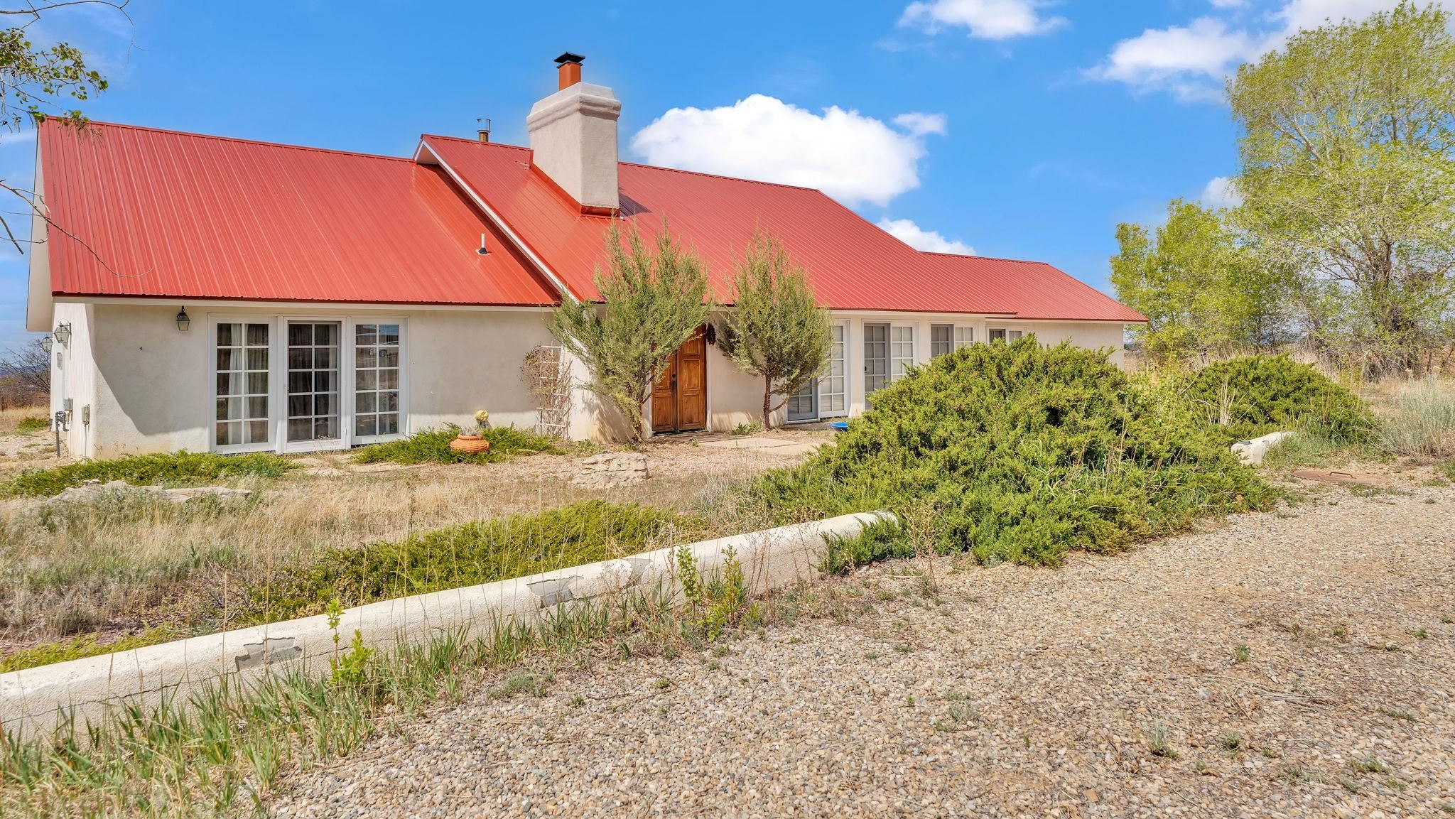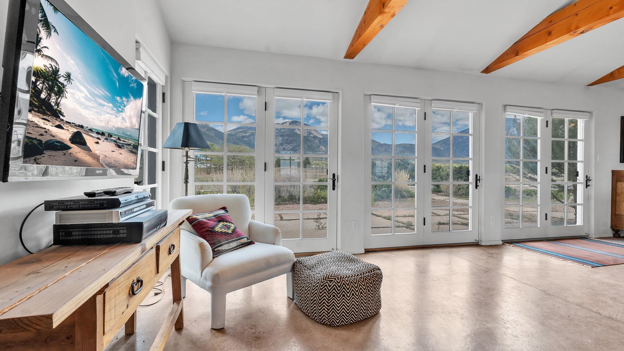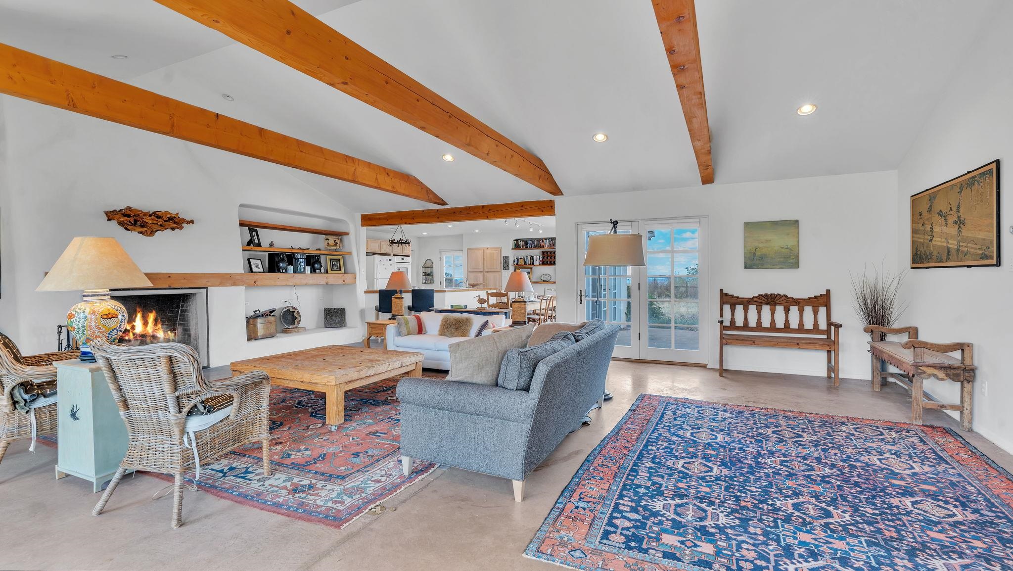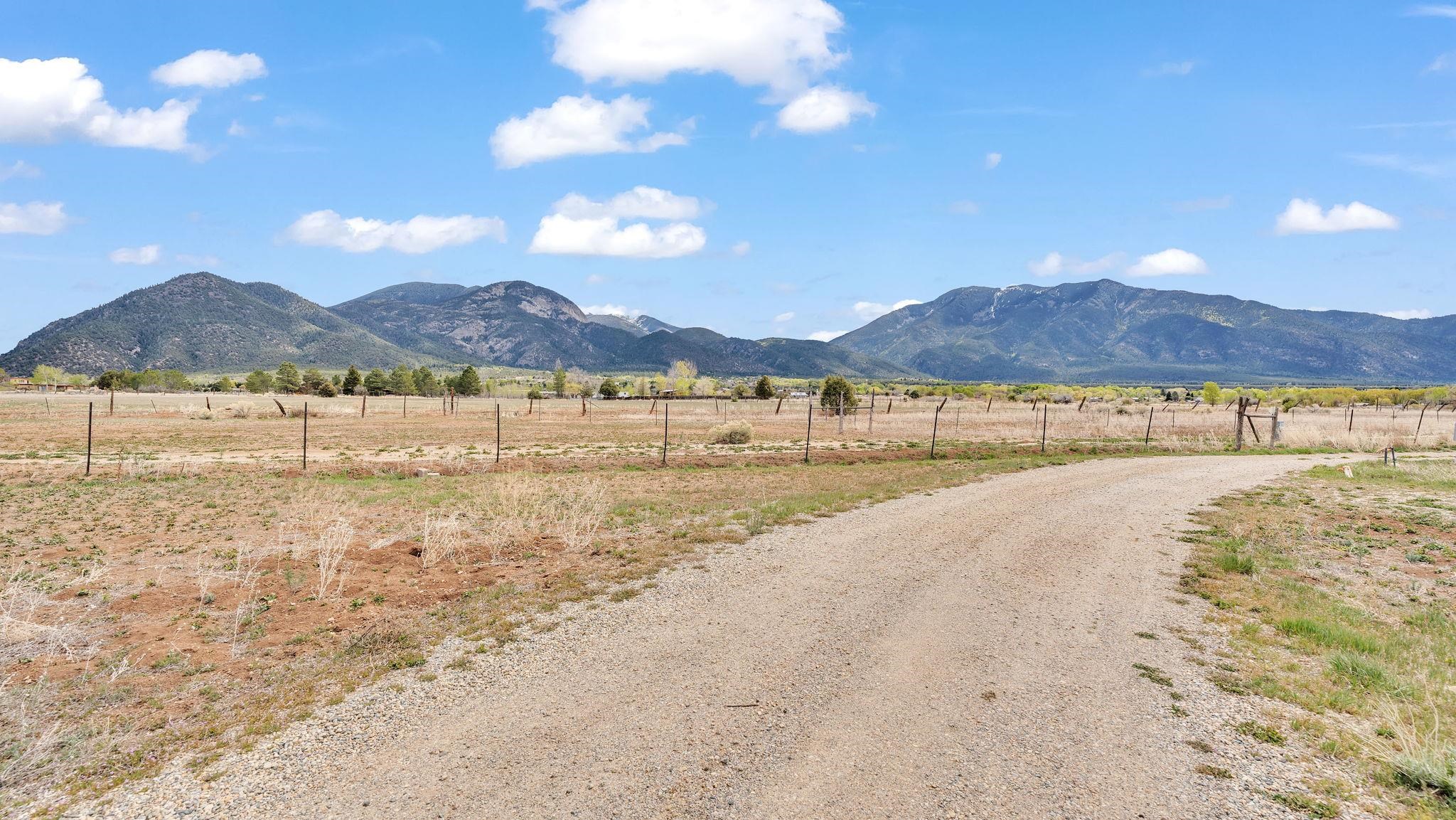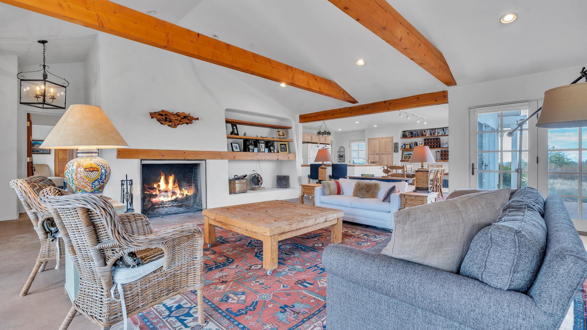 Nestled in the heart of Arroyo Seco, this expansive estate featuring a beautifully designed two-bedroom main residence and a charming two-bedroom casita offers a refined blend of modern elegance and timeless Northern New Mexico allure. Inside, the home unfolds into a light-filled living space defined by soaring vaulted ceilings and exposed wood beams that create both architectural drama and warmth. The elevated ceilingline enhances volume and airiness, while the natural timber detailing brings a grounded, mountain-modern sophistication. At the center, a statement fireplace inspired by the French countryside anchors the room, offering an inviting focal point for quiet evenings and elevated entertaining alike. The open-concept layout flows effortlessly into a thoughtfully designed kitchen, where a custom statement hood and distinctive tilework add an artistic, high-end touch. Expansive windows frame panoramic mountain views, creating a seamless connection between indoor living and the surrounding landscape. Designed for both comfort and efficiency, the home features modern concrete radiant heated flooring throughout. Along the property boundary, there is a traditional acequia. Outside you can experience breathtaking 360-degree views of surrounding peaks and valleys, all while enjoying the privacy of a quiet dead-end road setting. A two-car garage and a recently installed new roof complete the offering, delivering both convenience and peace of mind. A truly rare and elevated retreat in the enchanting landscape of Arroyo Seco—where design, comfort, and natural beauty exist in perfect harmony!