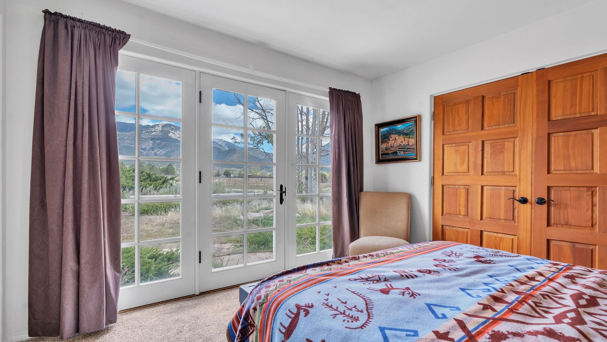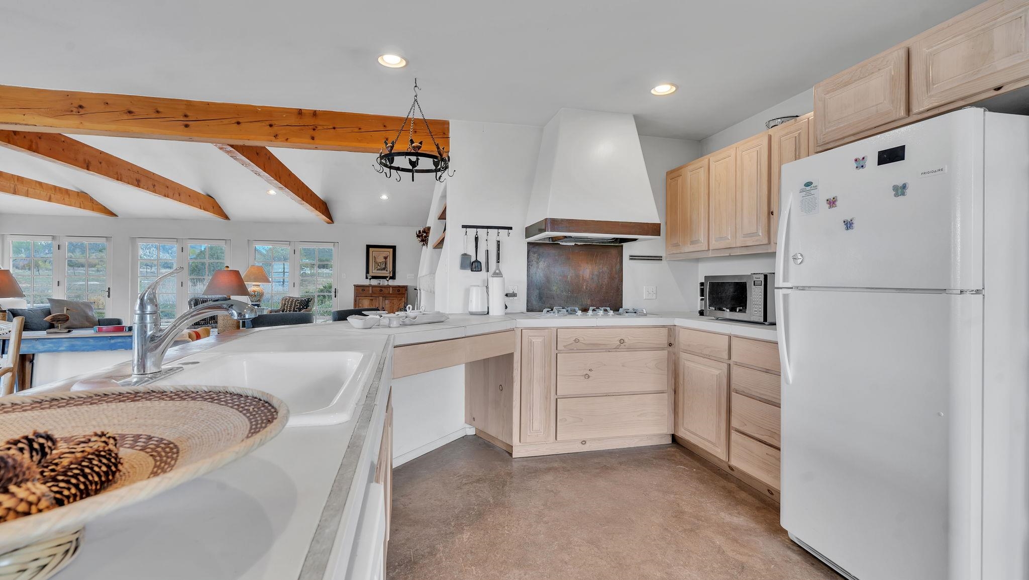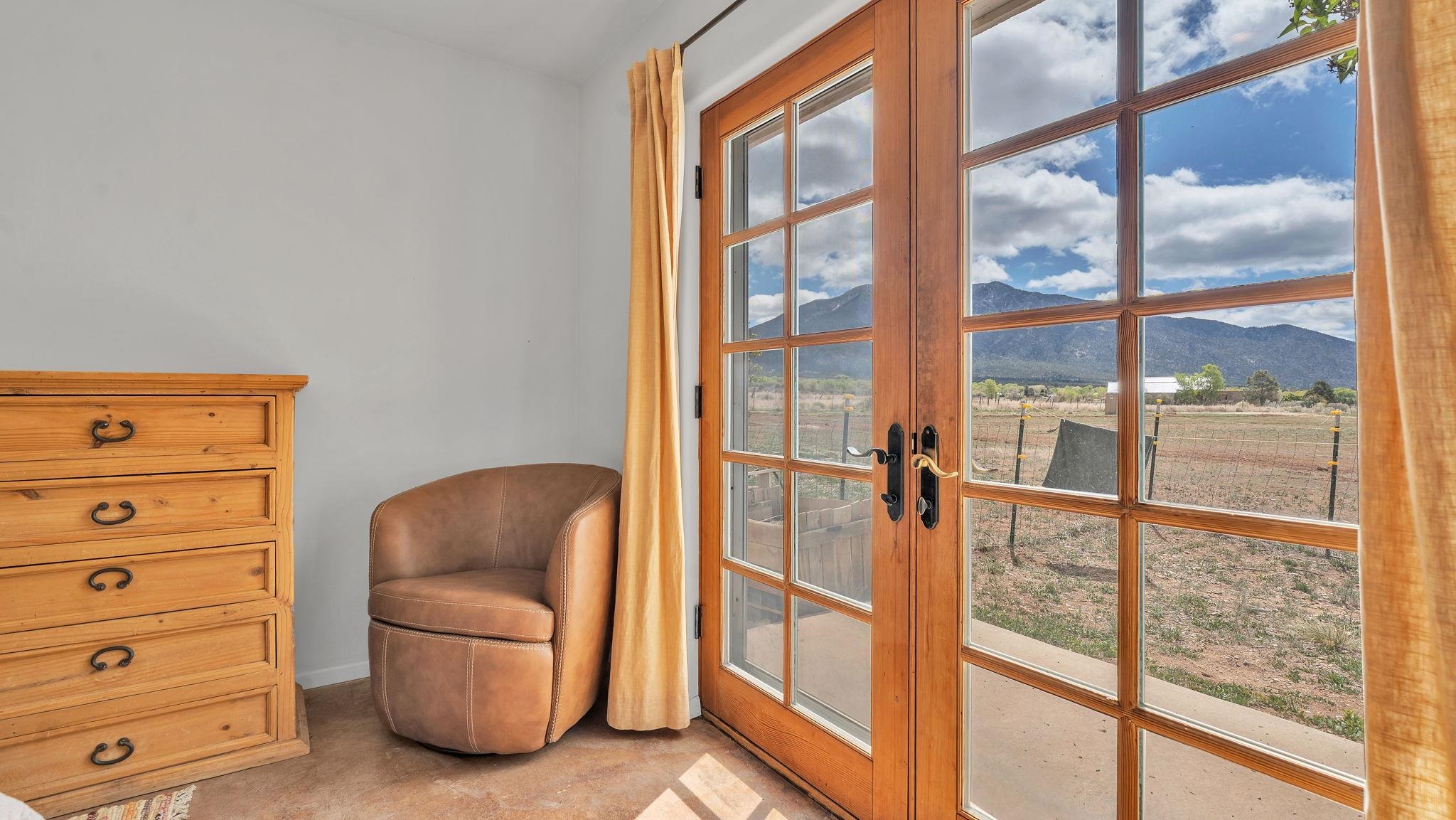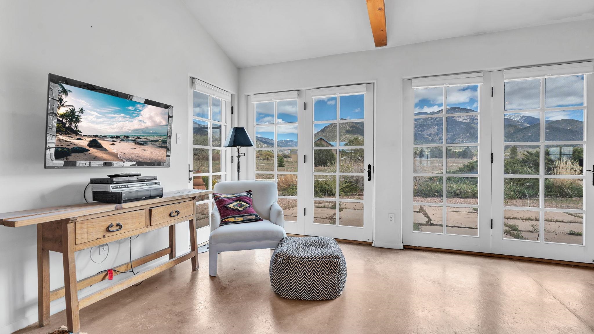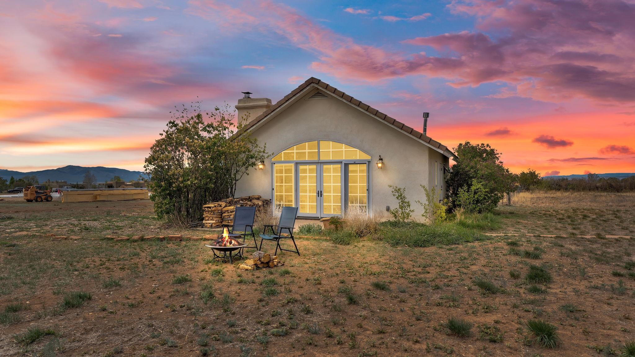 Nestled in the heart of Arroyo Seco, this expansive estate featuring a beautifully designed two-bedroom main residence and a charming two-bedroom casita offers a refined blend of modern elegance and timeless Northern New Mexico allure. Inside, the home unfolds into a light-filled living space defined by soaring vaulted ceilings and exposed wood beams that create both architectural drama and warmth. The elevated ceilingline enhances volume and airiness, while the natural timber detailing brings a grounded, mountain-modern sophistication. At the center, a statement fireplace inspired by the French countryside anchors the room, offering an inviting focal point for quiet evenings and elevated entertaining alike. The open-concept layout flows effortlessly into a thoughtfully designed kitchen, where a custom statement hood and distinctive tilework add an artistic, high-end touch. Expansive windows frame panoramic mountain views, creating a seamless connection between indoor living and the surrounding landscape. Designed for both comfort and efficiency, the home features modern concrete radiant heated flooring throughout. Along the property boundary, there is a traditional acequia. Outside you can experience breathtaking 360-degree views of surrounding peaks and valleys, all while enjoying the privacy of a quiet dead-end road setting. A two-car garage and a recently installed new roof complete the offering, delivering both convenience and peace of mind. A truly rare and elevated retreat in the enchanting landscape of Arroyo Seco—where design, comfort, and natural beauty exist in perfect harmony!