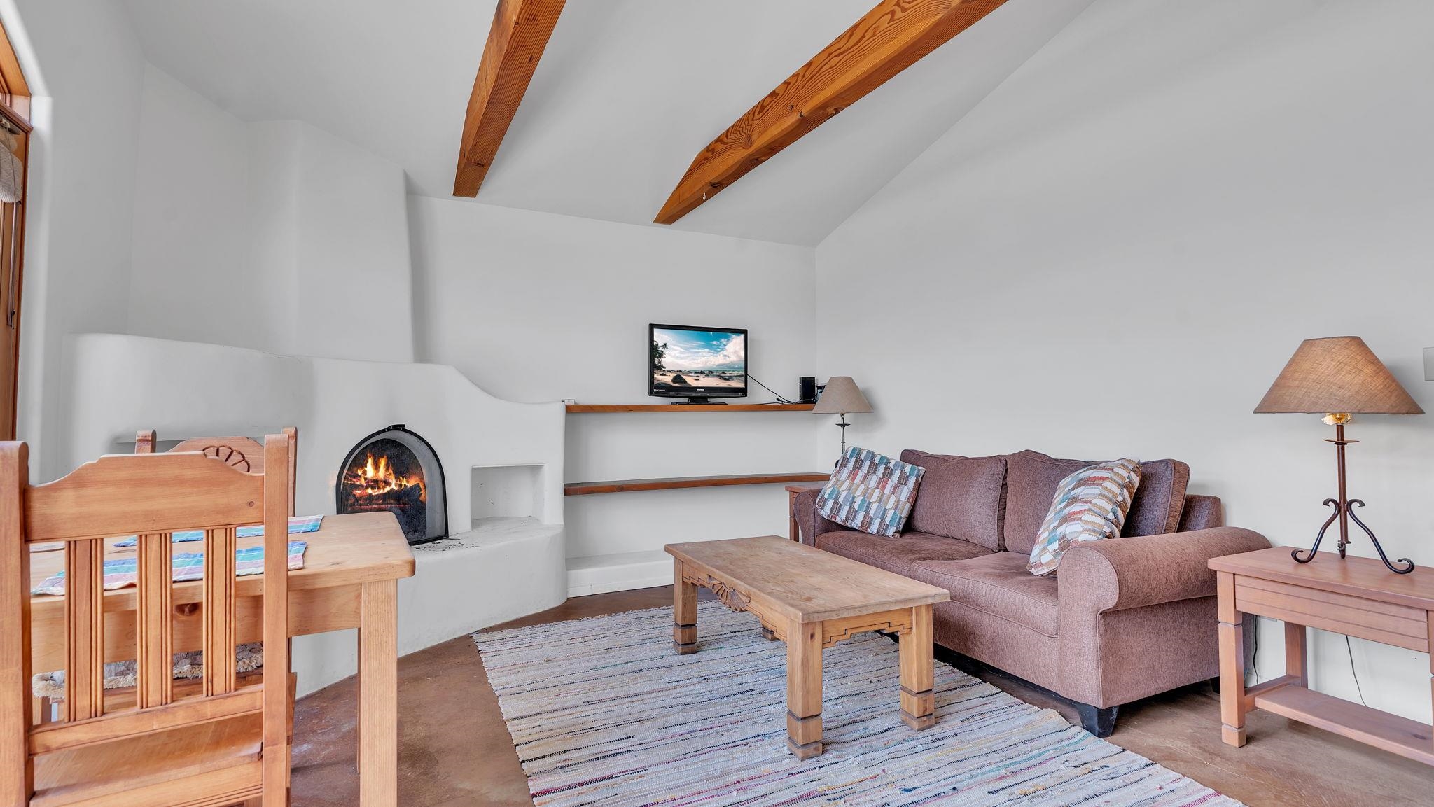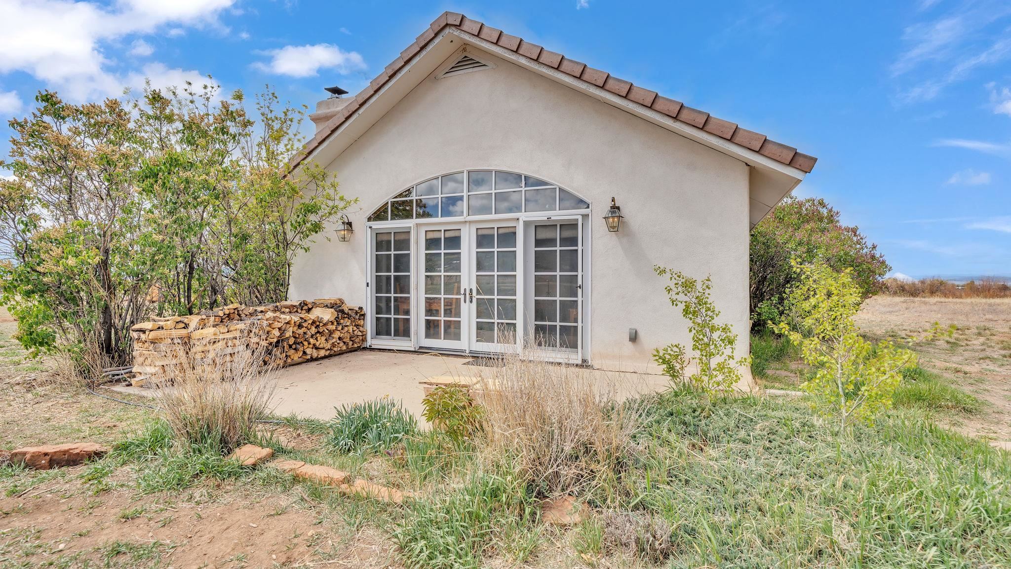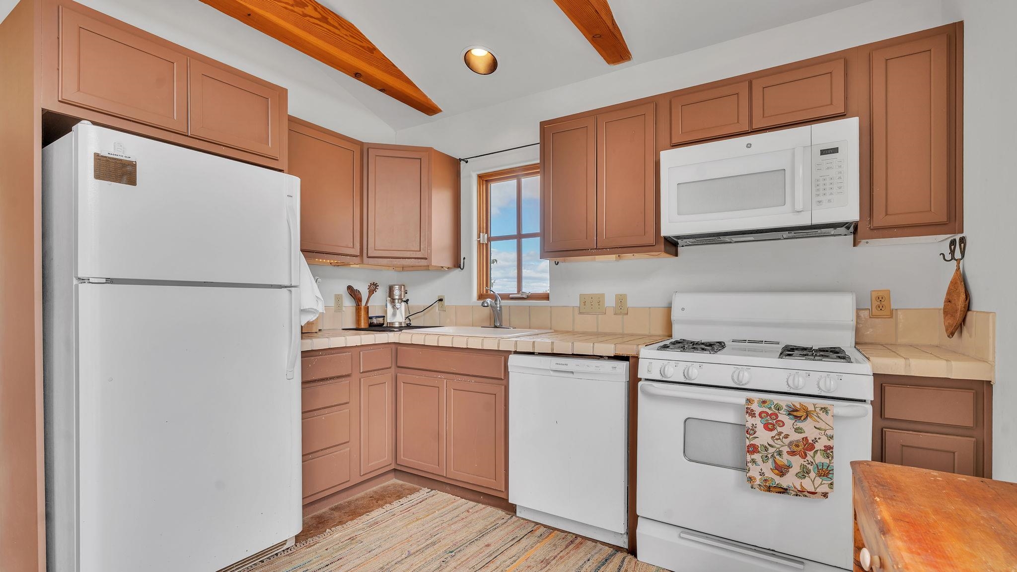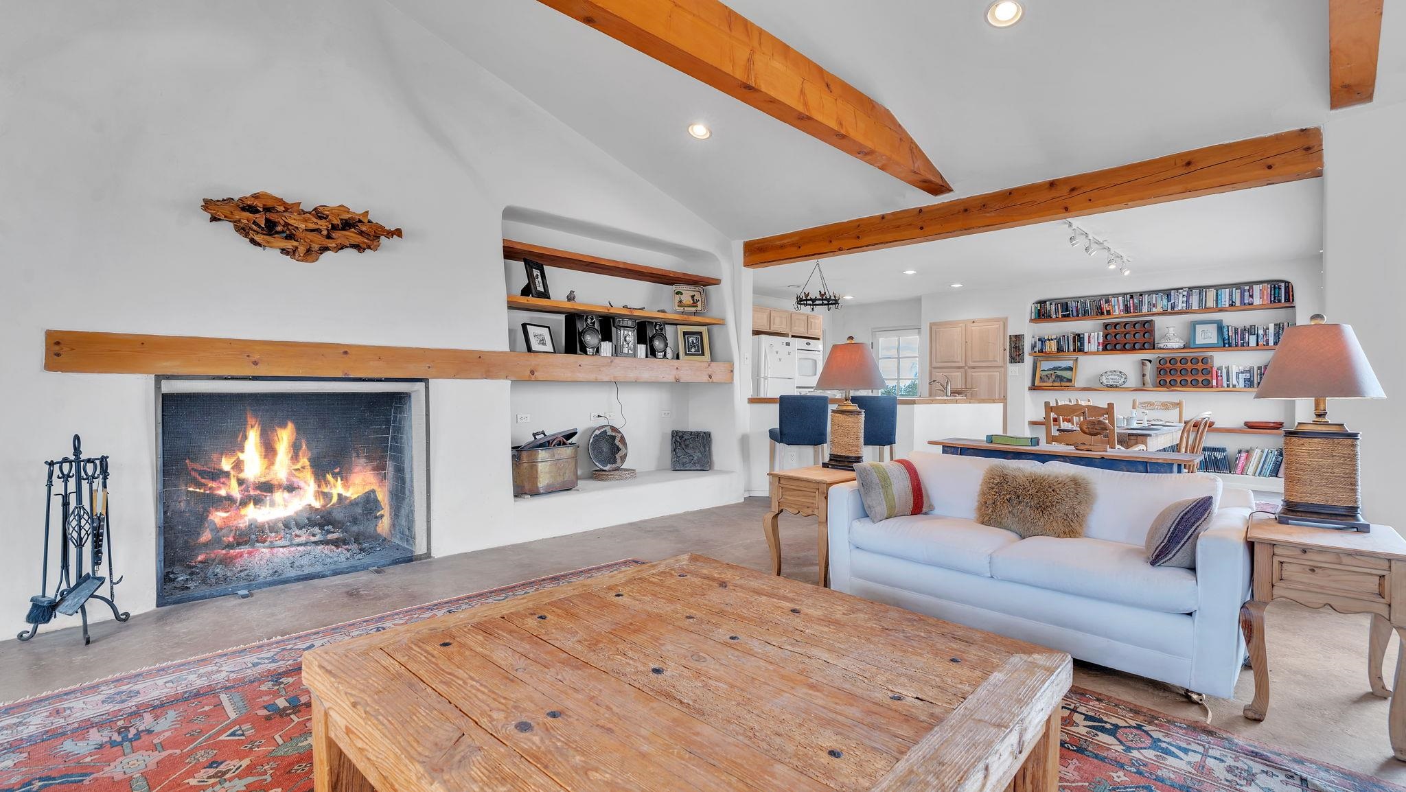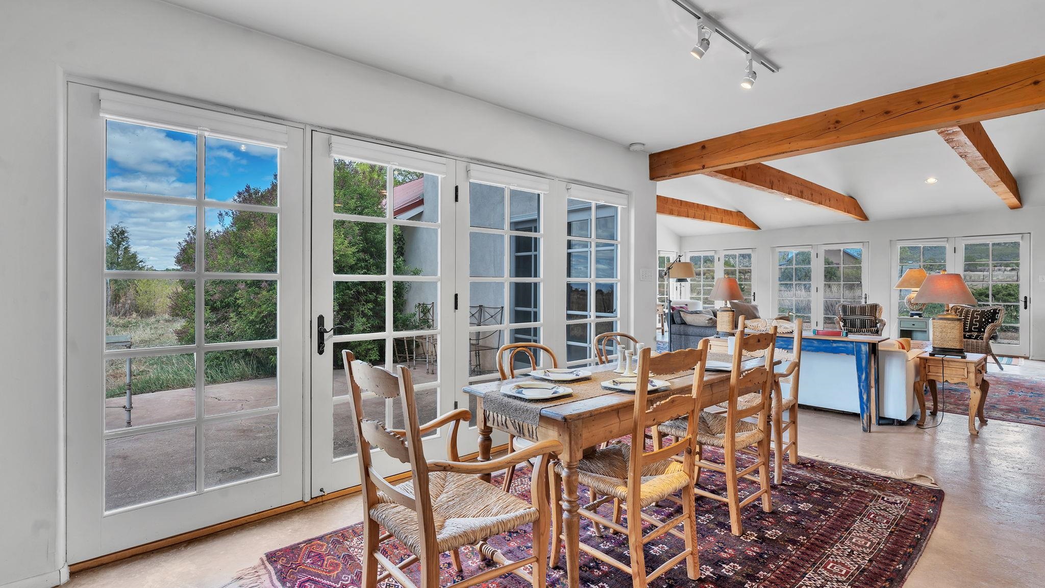 Nestled in the heart of Arroyo Seco, this expansive estate featuring a beautifully designed two-bedroom main residence and a charming two-bedroom casita offers a refined blend of modern elegance and timeless Northern New Mexico allure. Inside, the home unfolds into a light-filled living space defined by soaring vaulted ceilings and exposed wood beams that create both architectural drama and warmth. The elevated ceilingline enhances volume and airiness, while the natural timber detailing brings a grounded, mountain-modern sophistication. At the center, a statement fireplace inspired by the French countryside anchors the room, offering an inviting focal point for quiet evenings and elevated entertaining alike. The open-concept layout flows effortlessly into a thoughtfully designed kitchen, where a custom statement hood and distinctive tilework add an artistic, high-end touch. Expansive windows frame panoramic mountain views, creating a seamless connection between indoor living and the surrounding landscape. Designed for both comfort and efficiency, the home features modern concrete radiant heated flooring throughout. Along the property boundary, there is a traditional acequia. Outside you can experience breathtaking 360-degree views of surrounding peaks and valleys, all while enjoying the privacy of a quiet dead-end road setting. A two-car garage and a recently installed new roof complete the offering, delivering both convenience and peace of mind. A truly rare and elevated retreat in the enchanting landscape of Arroyo Seco—where design, comfort, and natural beauty exist in perfect harmony!